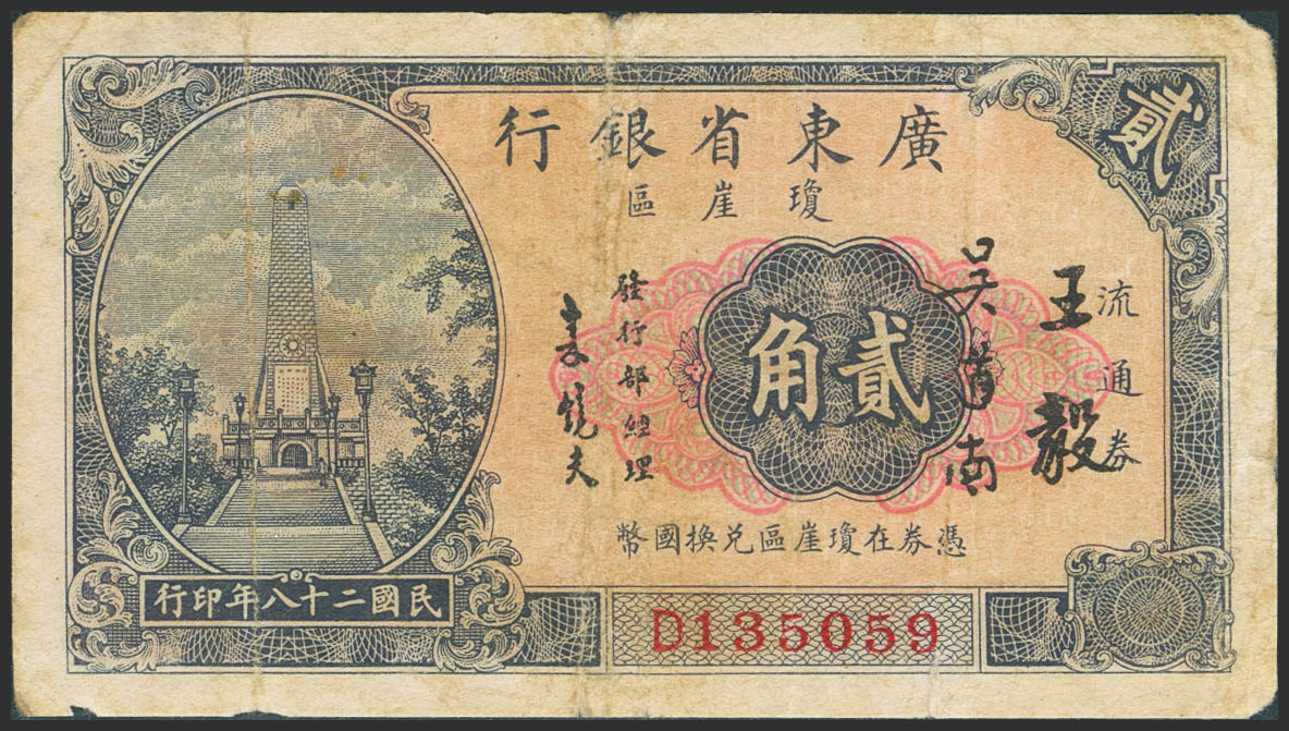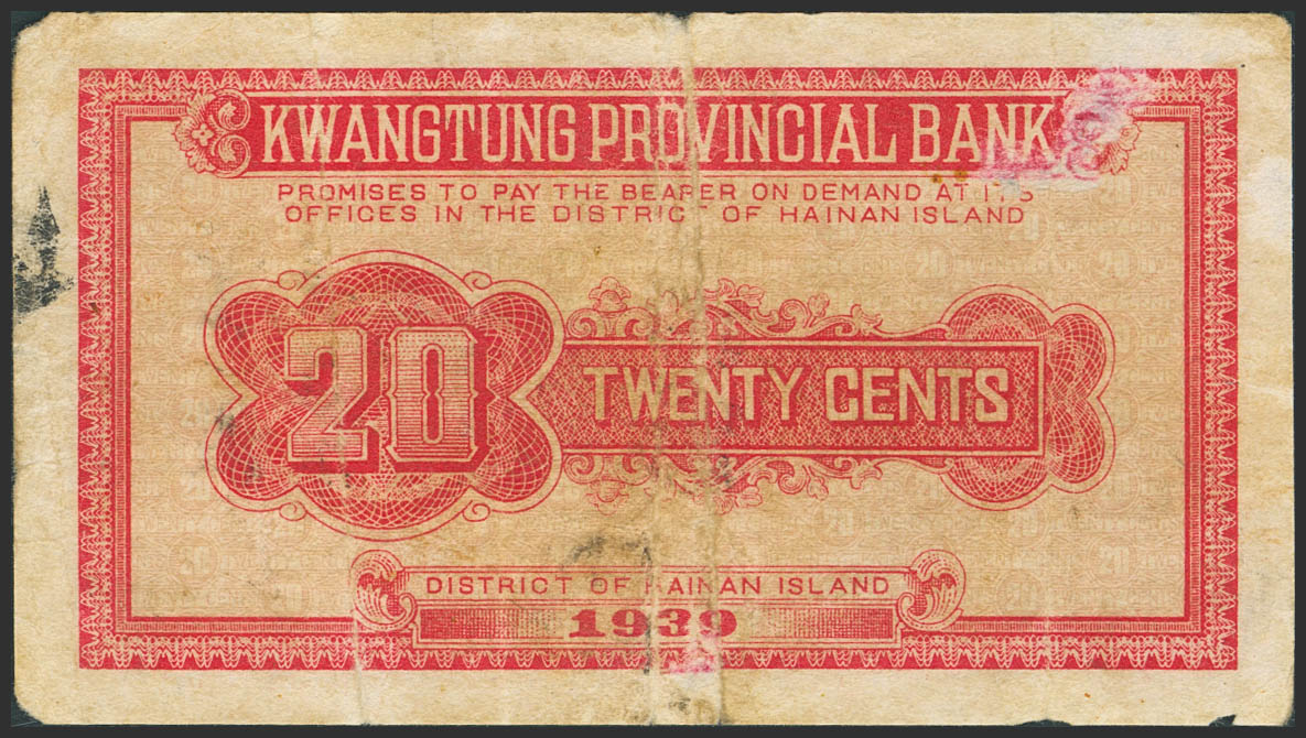 CHINA. 20 Cents. 1939. Kwangtung Provincial Bank. District of Hainan Island. (Pick: S2446). Very Fine.