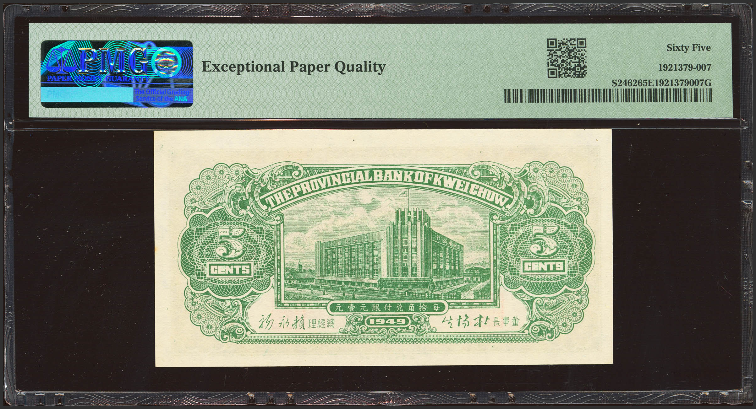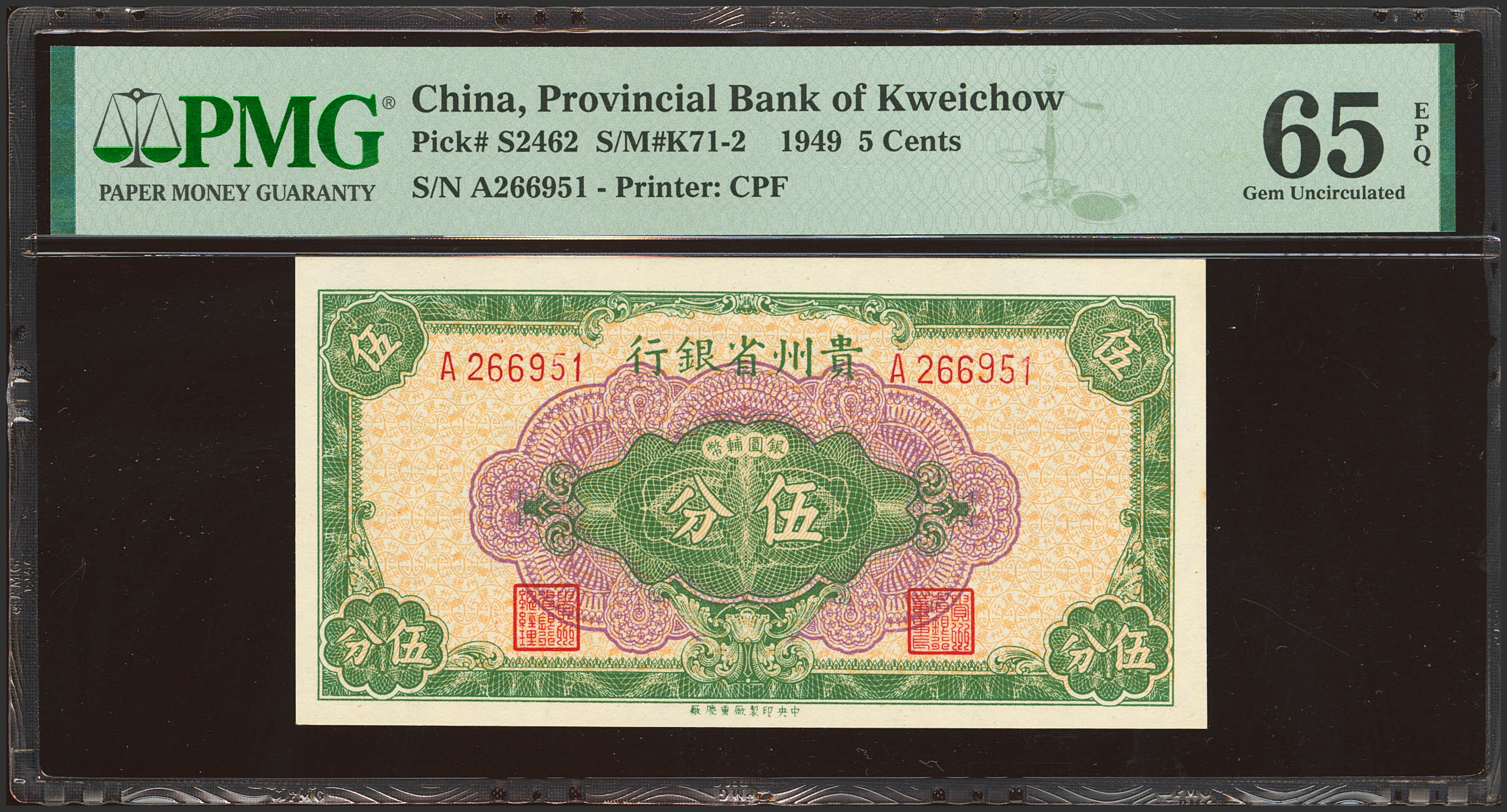 CHINA. 5 Cents. 1949. Provincial Bank of Kweichow. (Pick: S2462, SM: K71-2). PMG65EPQ.