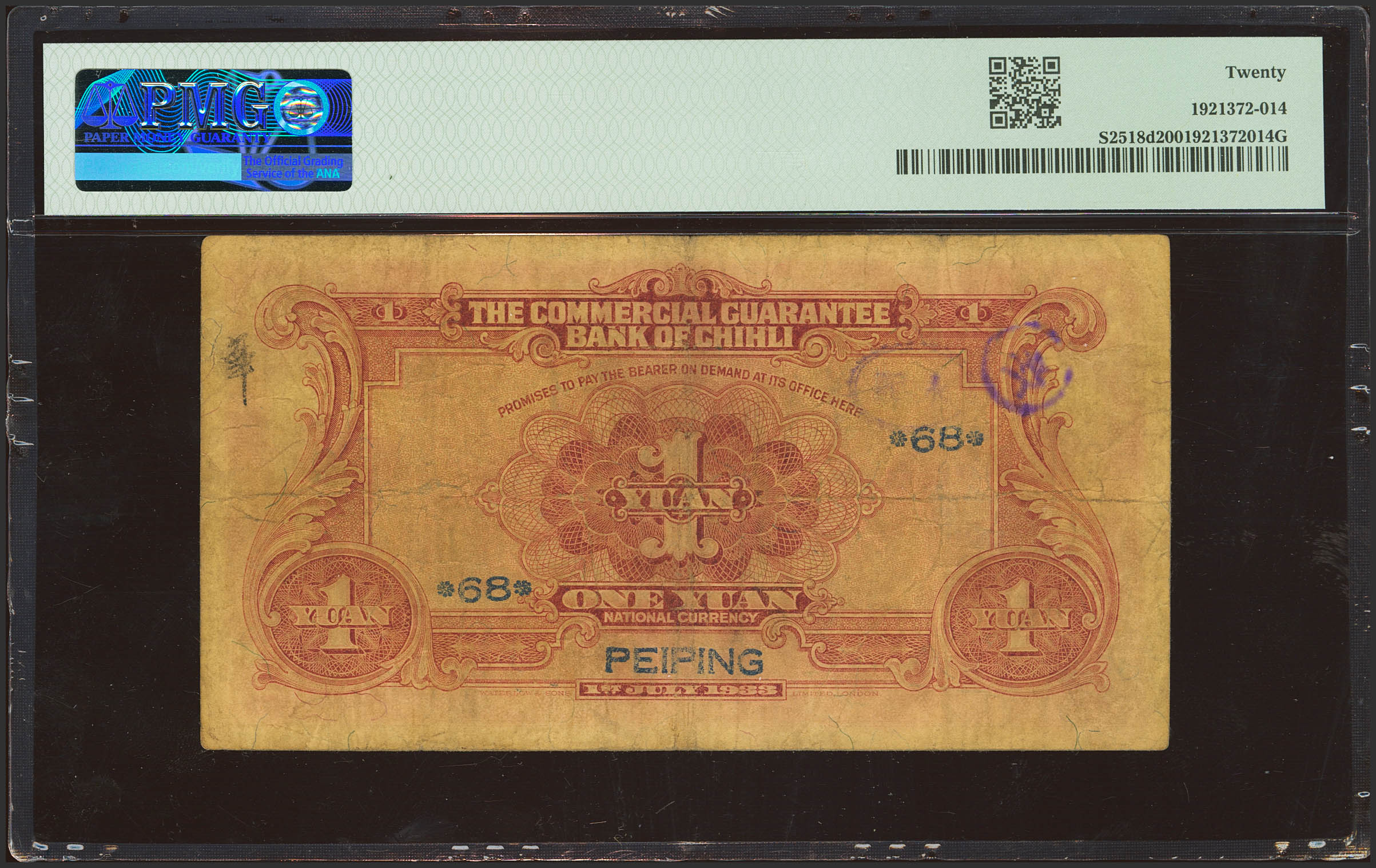 CHINA. 1 Yuan. 1 July 1933. Commercial Guarantee Bank of Chihli. Peiping. Small signatures. (Pick: S2518d, SM: P33-20d). PMG20.