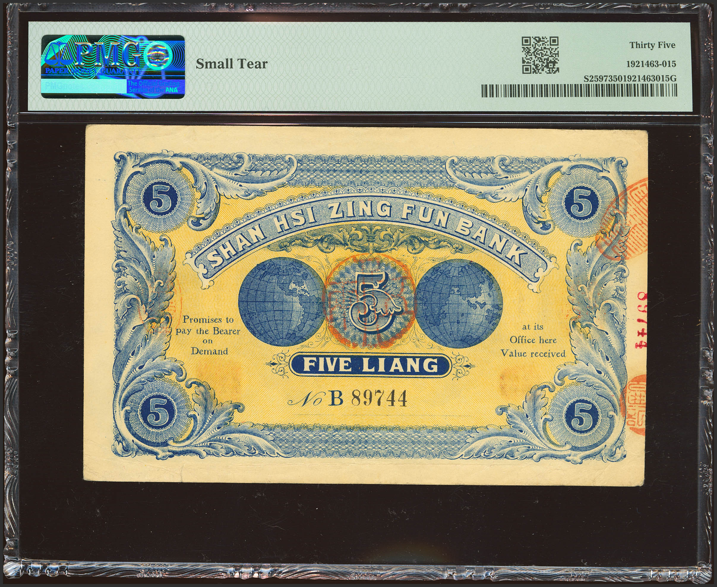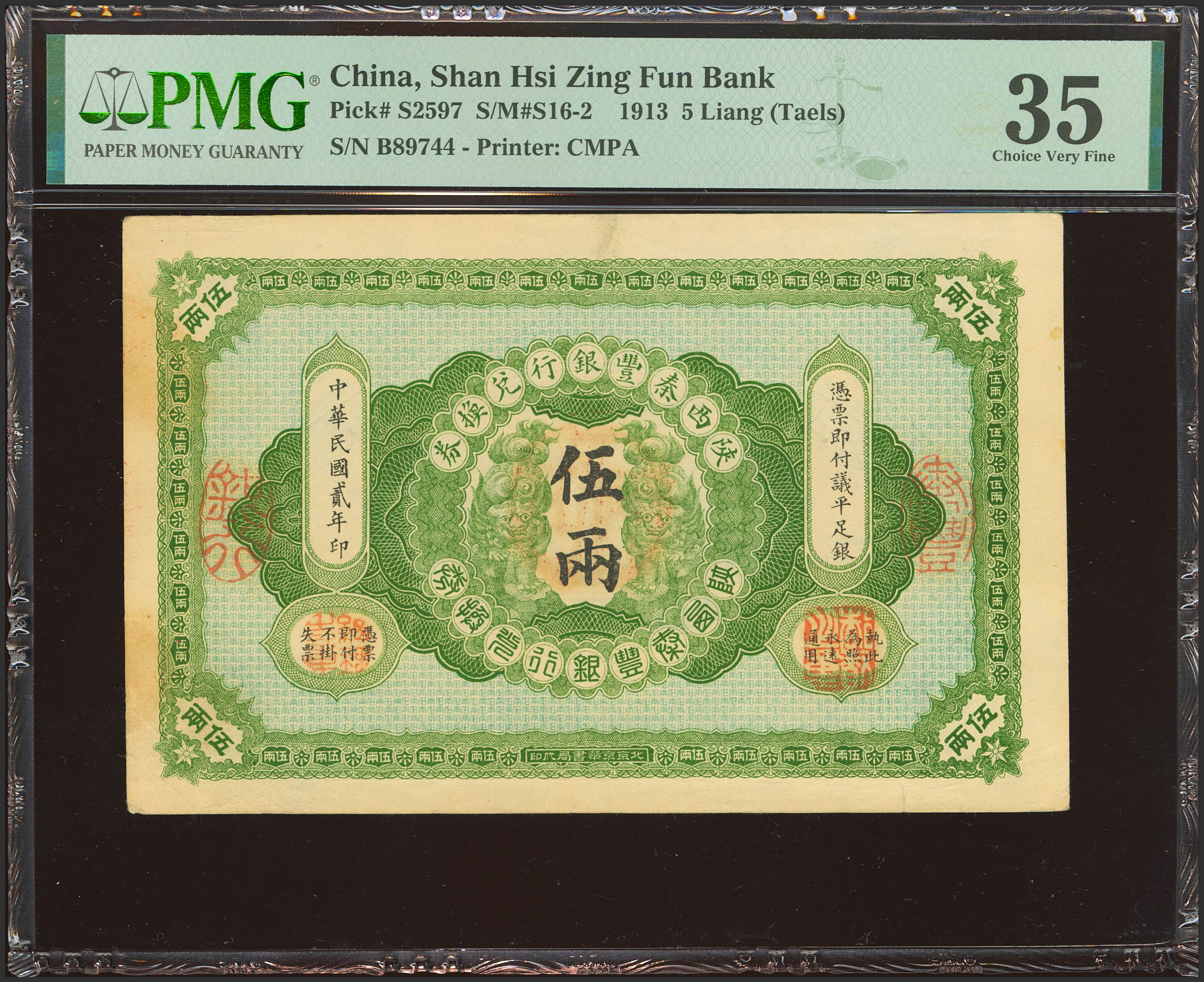 CHINA. 5 Liang. 1913. Shan Hsi Zing Fun Bank. (Pick: S2597, SM: S16-2). PMG35 (small tear).