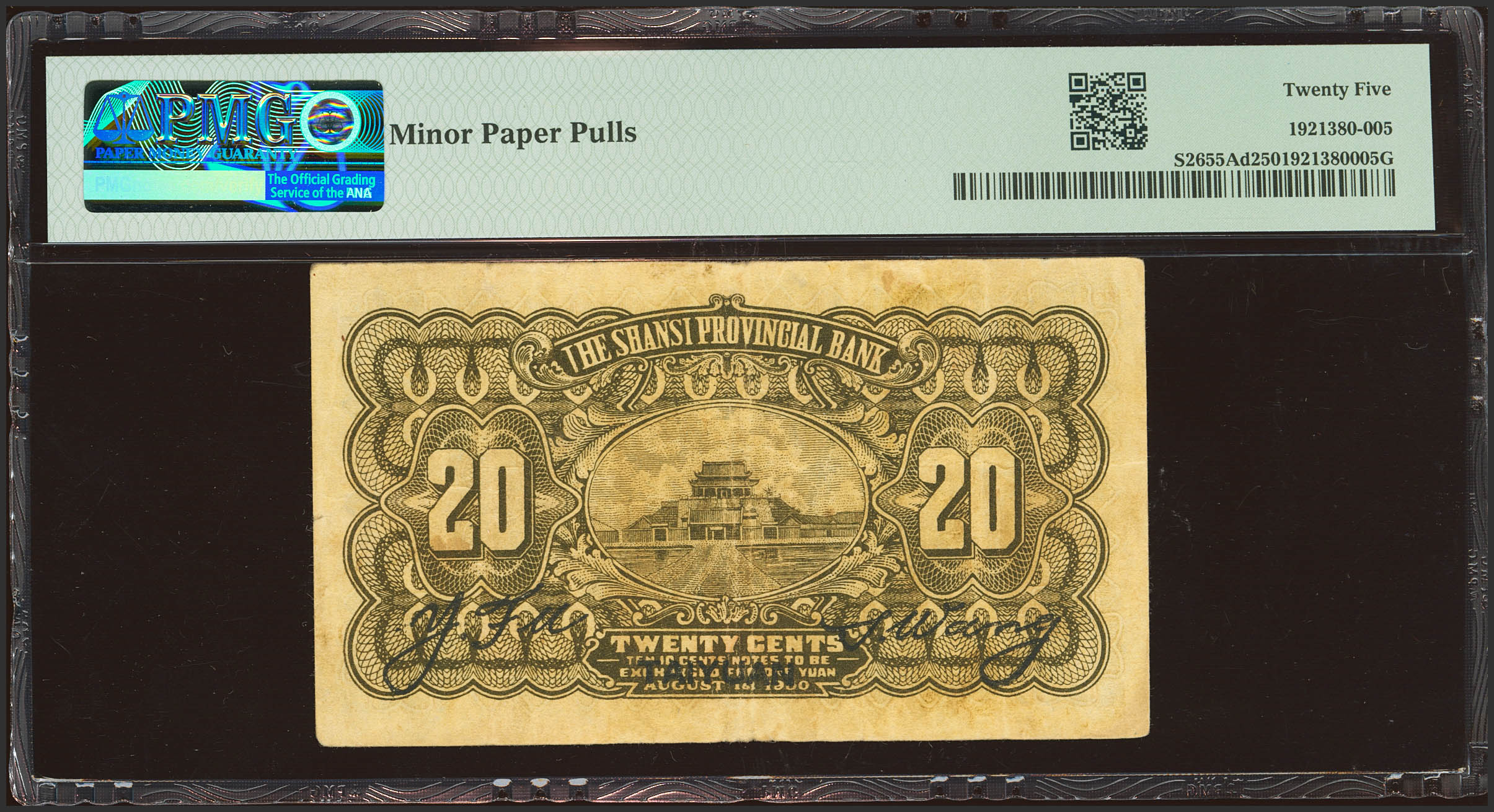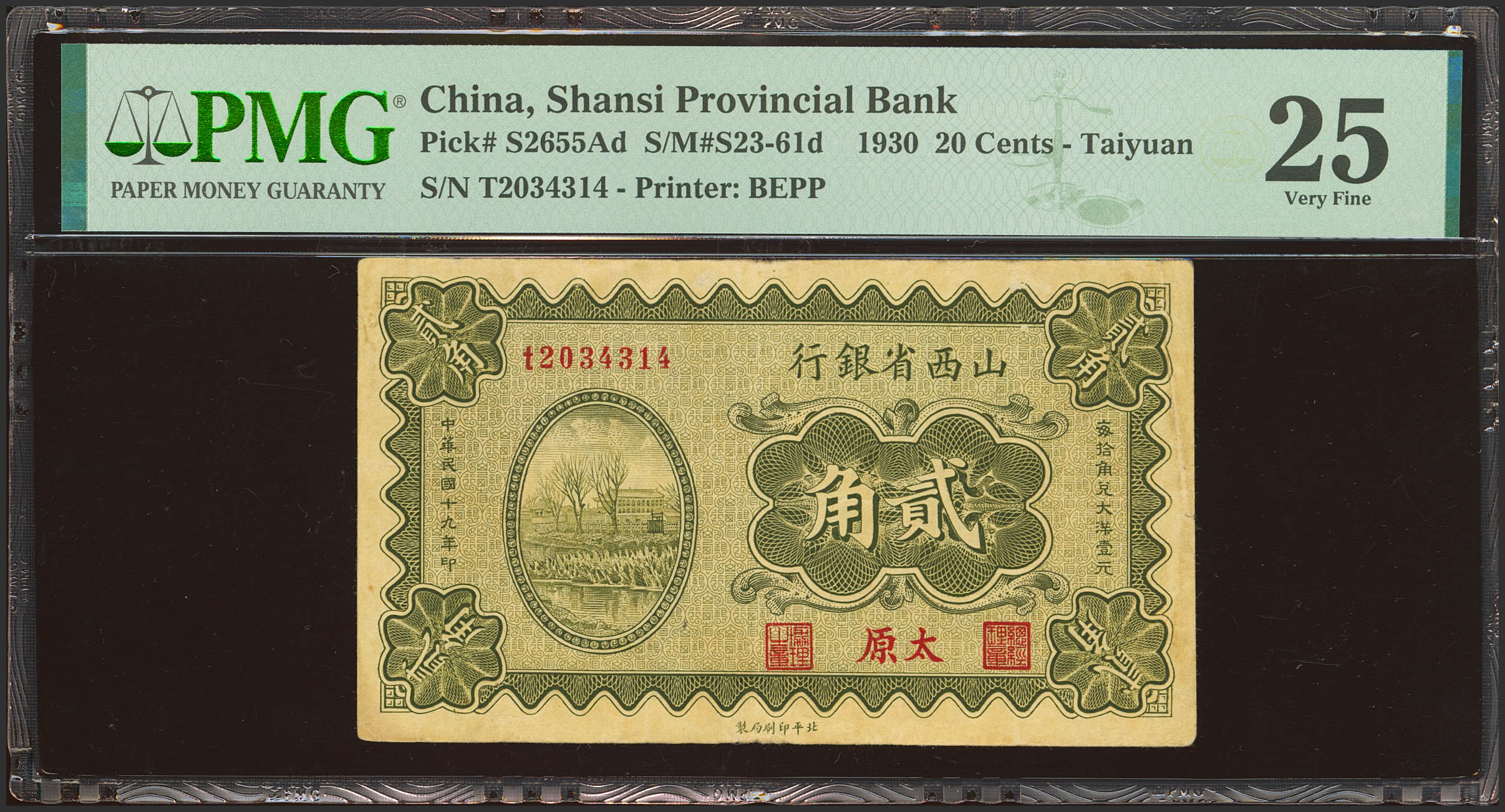 CHINA. 20 Cents. 1 August 1930. Shanse Provincial Bank. Taiyuan. (Pick: S2655Ad, SM: S23-61d). PMG25 (minor paper pulls).