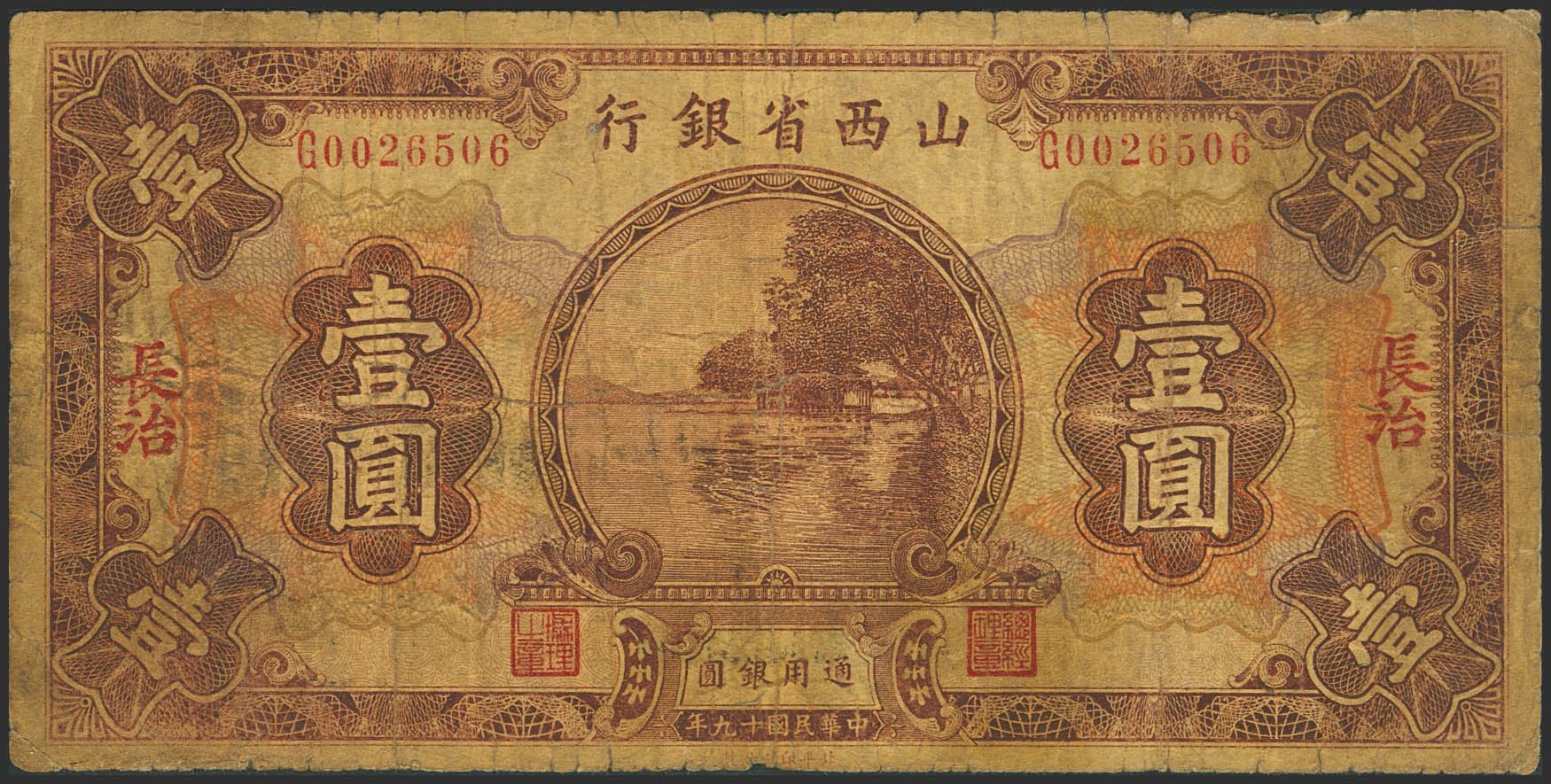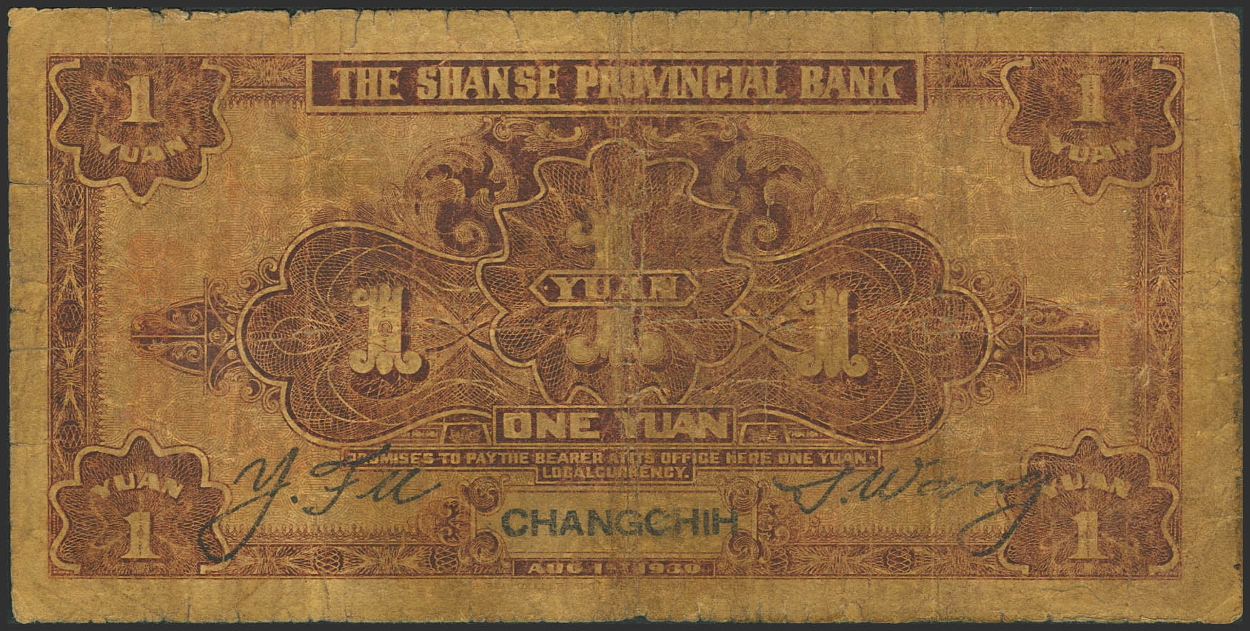 CHINA. 1 Yuan. 1 August 1930. Shanse Provincial Bank. Changchih. (Pick: S2657a). Very Good.