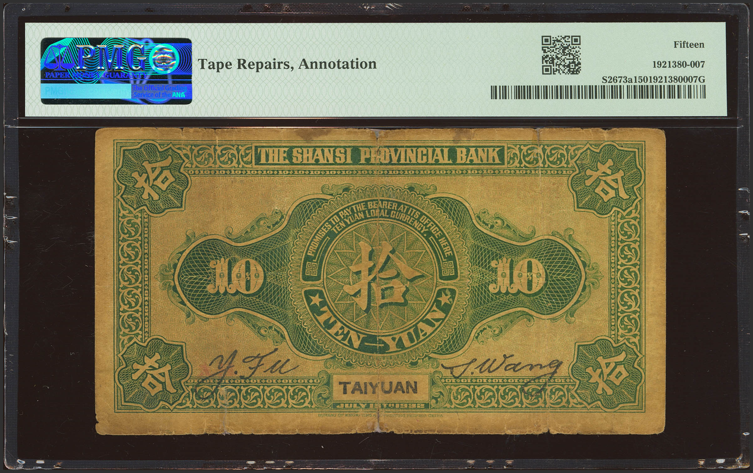 CHINA. 10 Yuan. 1 August 1930. Shanse Provincial Bank. Taiyuan. (Pick: S2673a, SM: S23-82a). PMG15 (tape repairs, annotation).