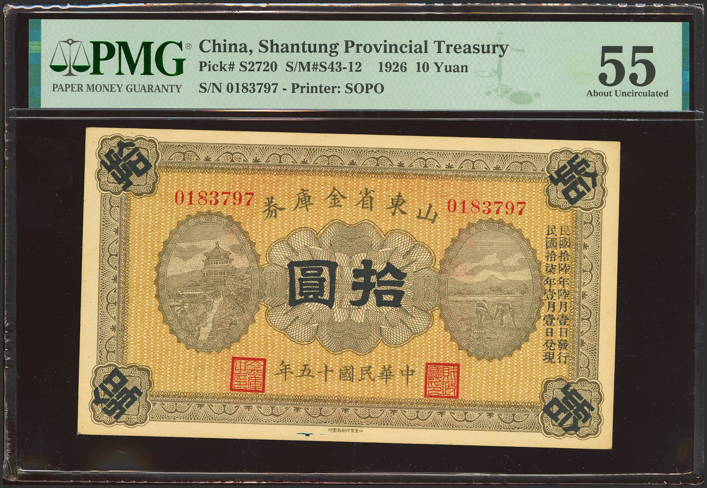 CHINA. 10 Yuan. 1926. Shantung Provincial Treasury. (Pick: S2720, SM: S43-12). PMG55 (minor ink).