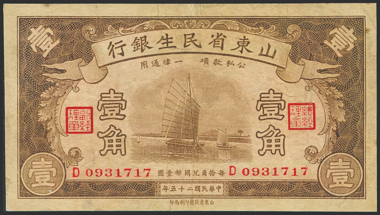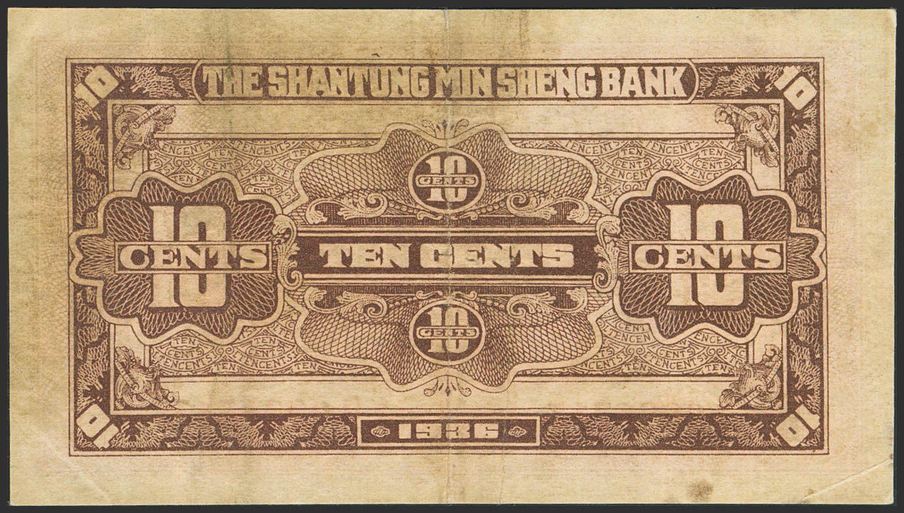 CHINA. 10 Cents. 1936. Shantung Min Sheng Bank. (Pick: S2731). Very Fine.