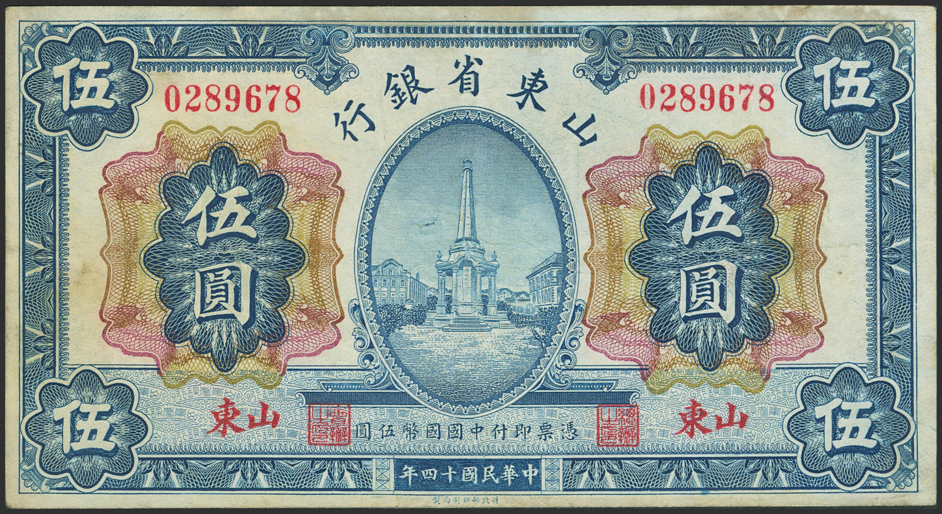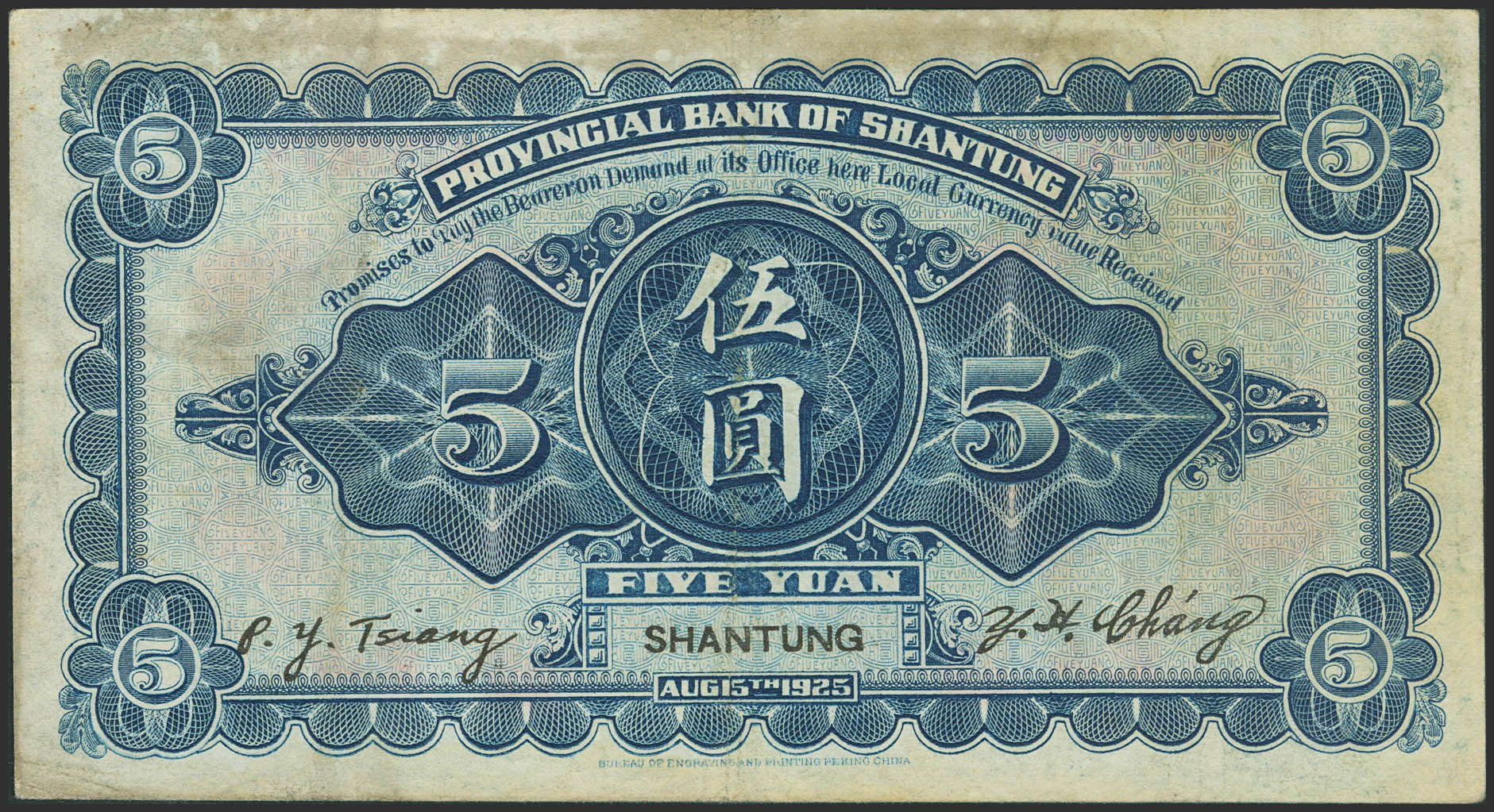 CHINA. 5 Yuan. 15 August 1925. Provincial Bank of Shantung. Shantung. (Pick: S2752a). Flattened. More than Very Fine.