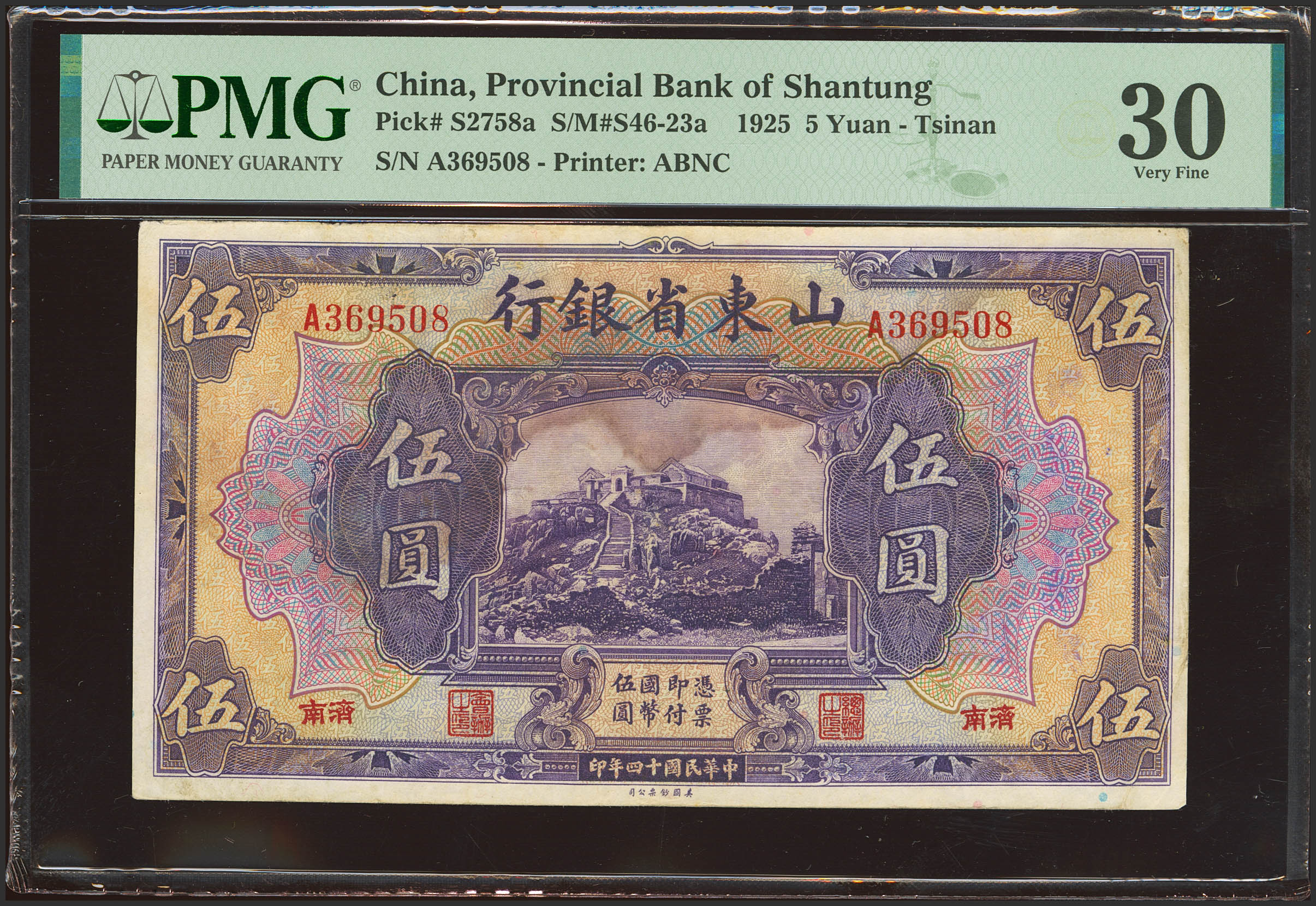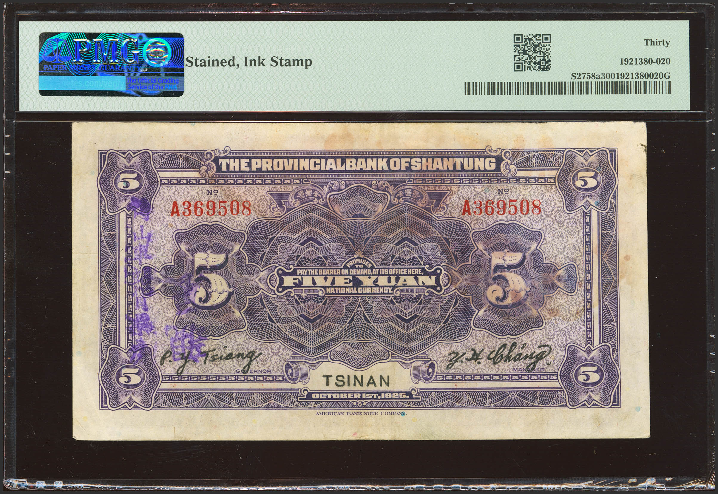 CHINA. 5 Yuan. 1 October 1925. Provincial Bank of Shantung. Tsinan. (Pick: S2758a, SM: S46-23a). PMG30 (stained, ink stamp).