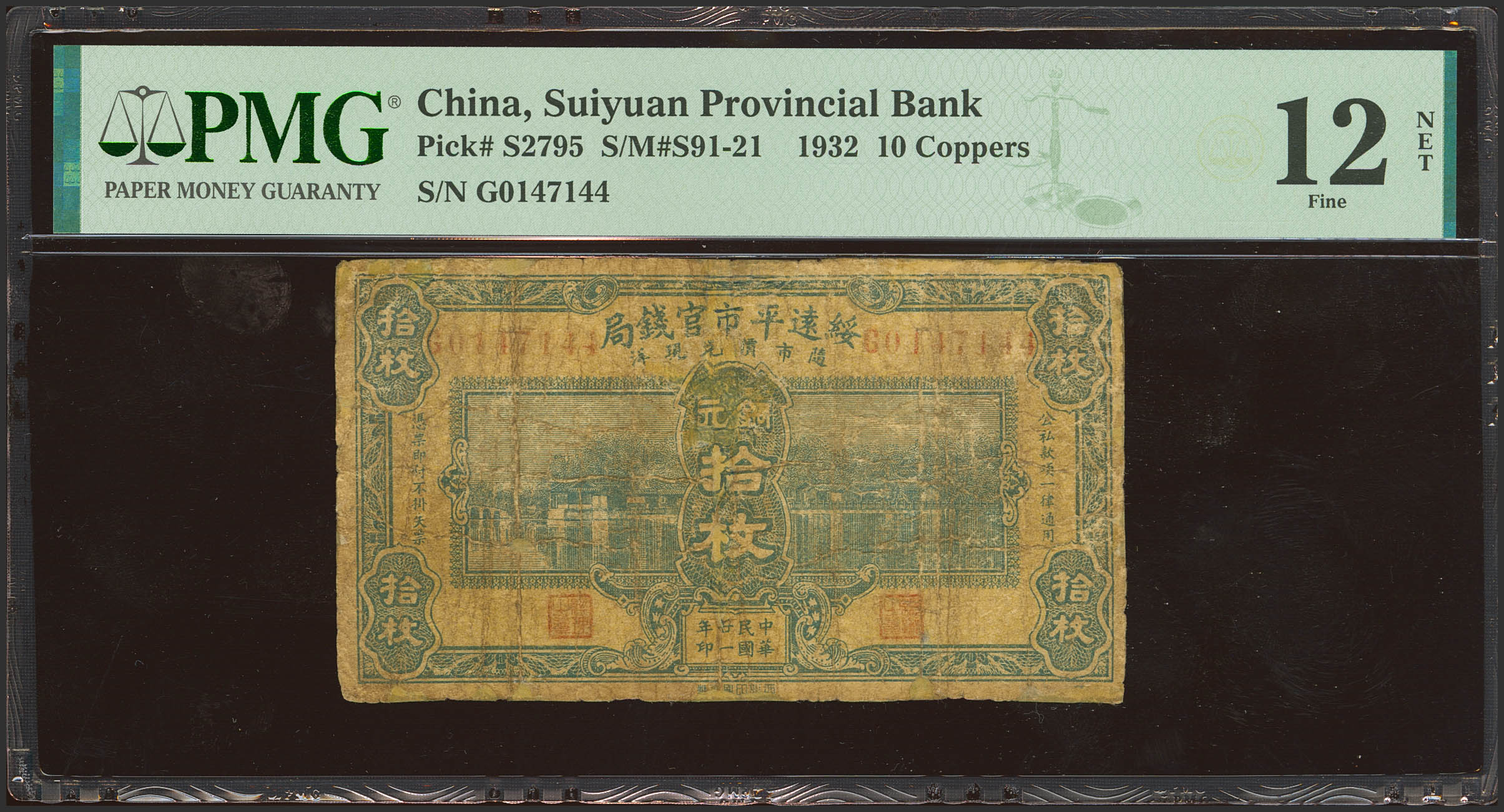 CHINA. 10 Coppers. 1932. Suiyuan Provincial Bank. (Pick: S2795, SM: S91-21). PMG12NET (repaired, reconstructed).