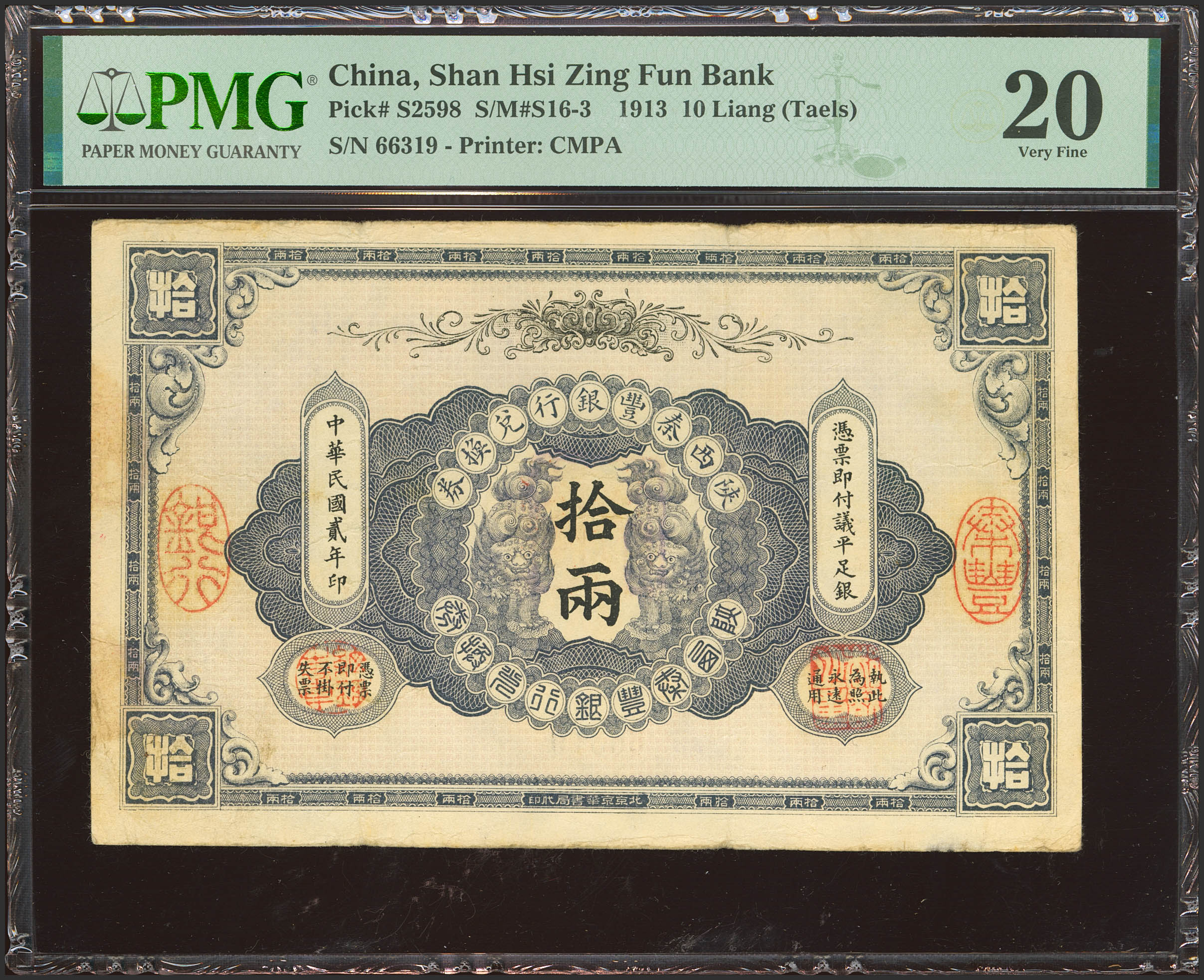 CHINA. 10 Liang. 1913. Shan Hsi Zing Fun Bank. (Pick: S2898, SM: S16-3). PMG20.