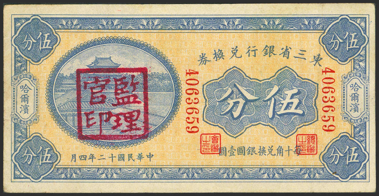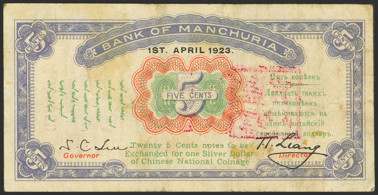 CHINA. 5 Cents. 1 April 1923. Bank of Manchuria. (Pick: S2940b). More than Very Fine.