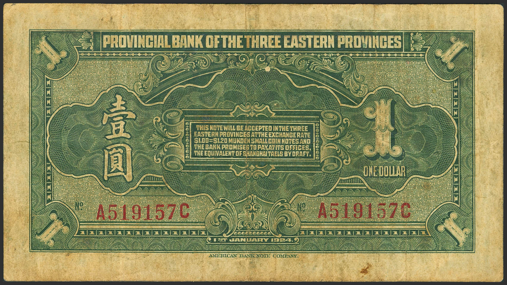 CHINA. 1 Dollar. 1 January 1924. Provincial Bank of the Three Eastern Provinces. (Pick: S2951a). Very Fine.