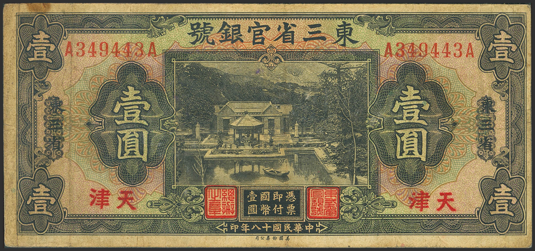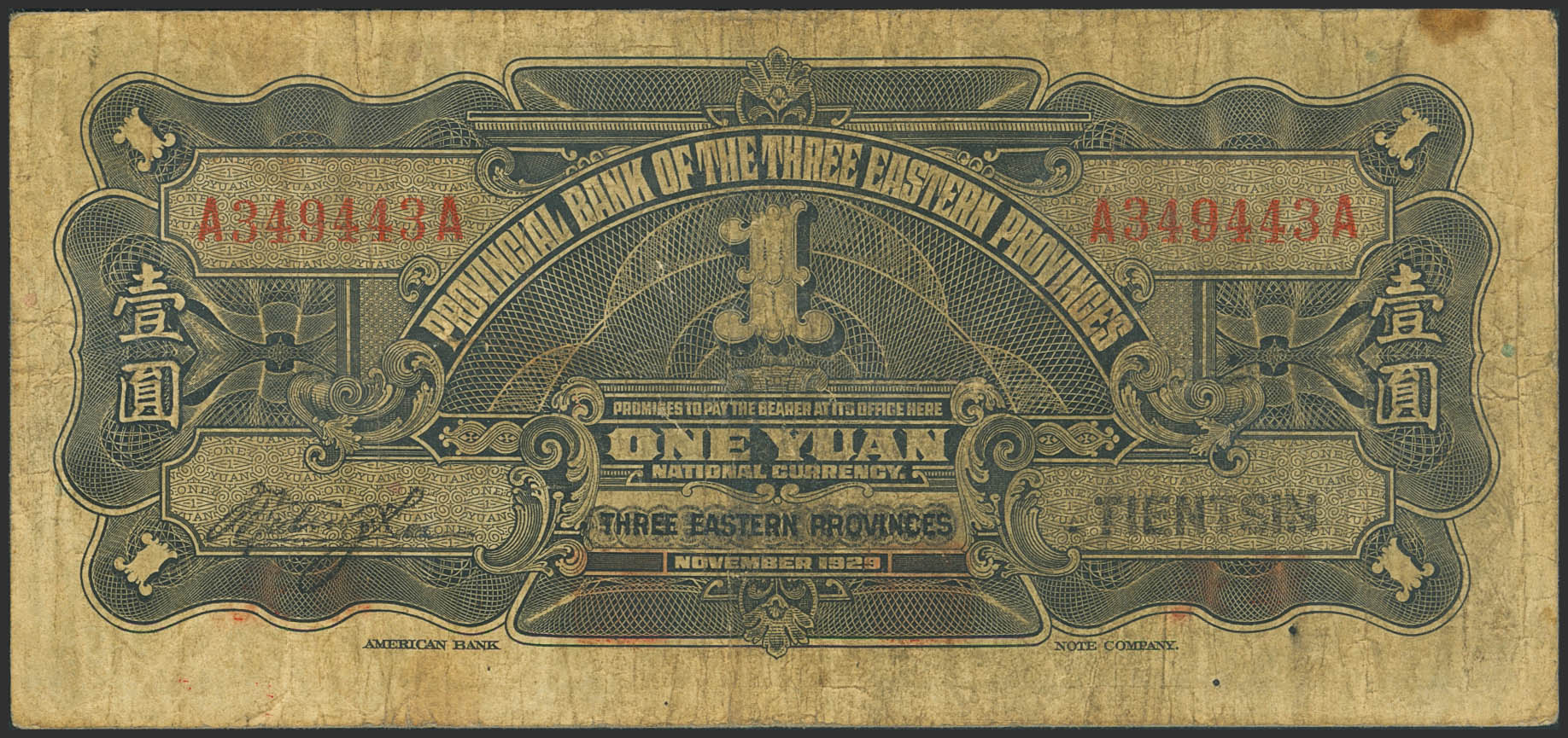 CHINA. 1 Yuan. November 1929. Provincial Bank of the Three Eastern Provinces. Tientsin. (Pick: S2962b). Pinhole. Fine.