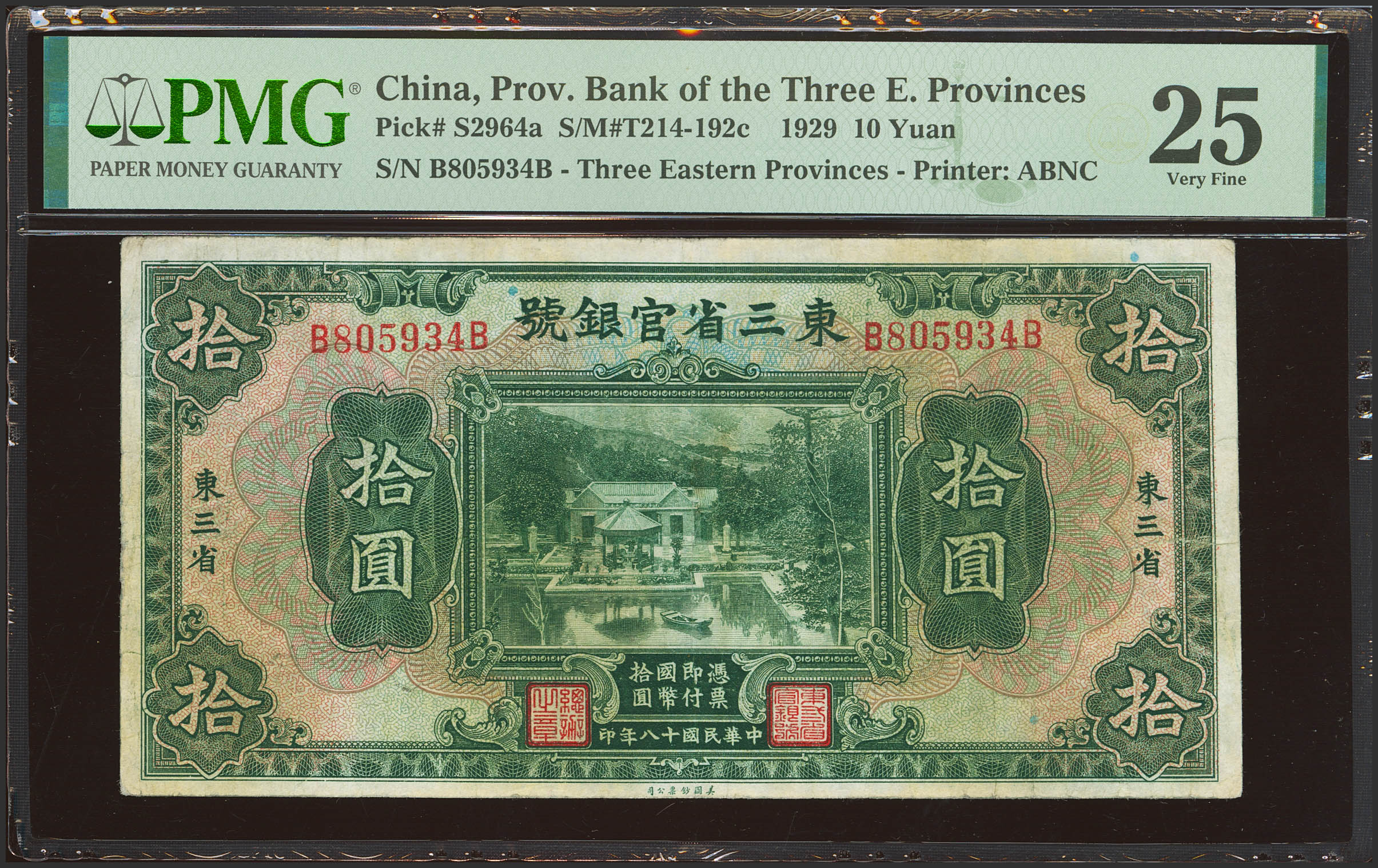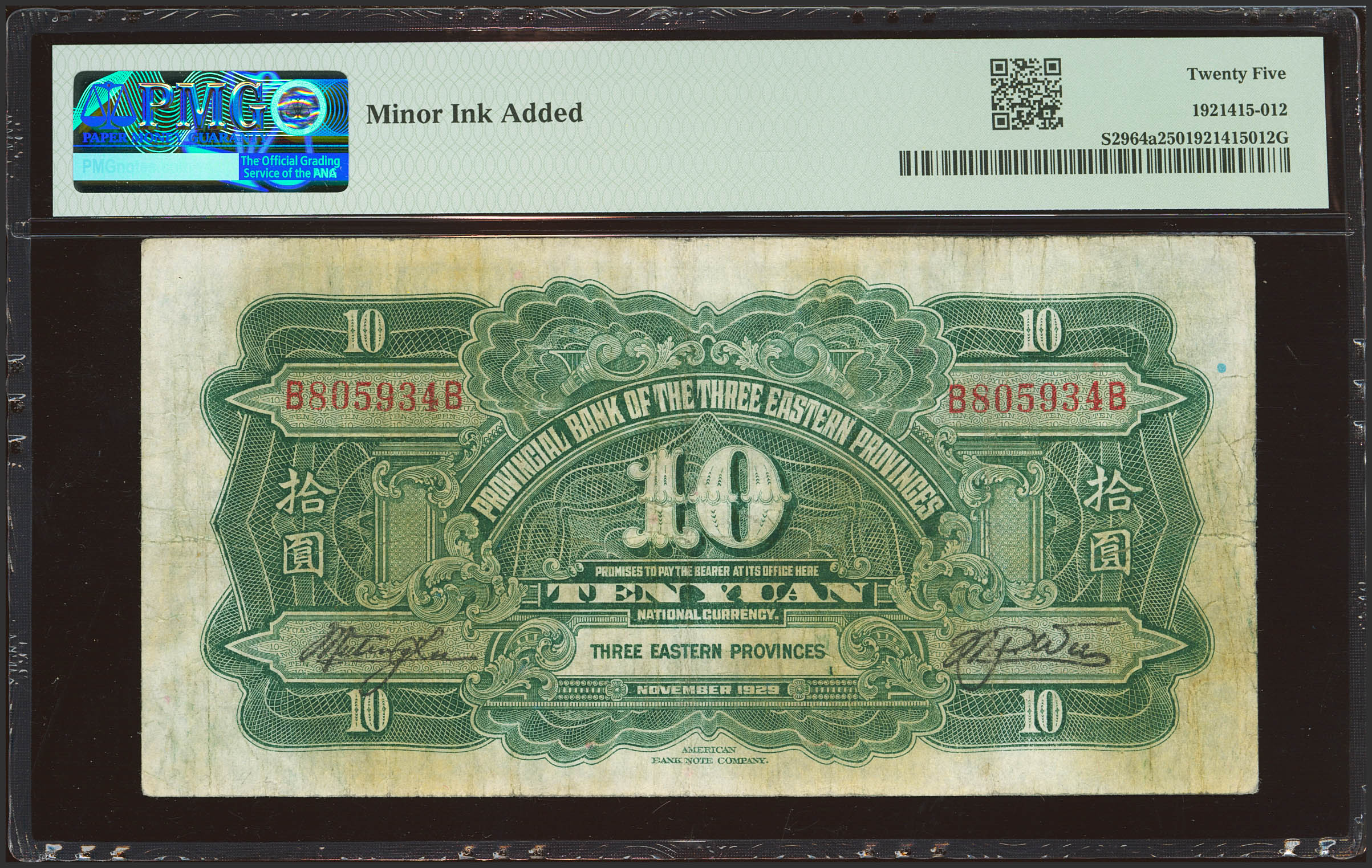 CHINA. 10 Yuan. November 1929. Provincial Bank of the Three Eastern Provinces. (Pick: S2964a, SM: T214-192c). PMG25 (minor ink added).