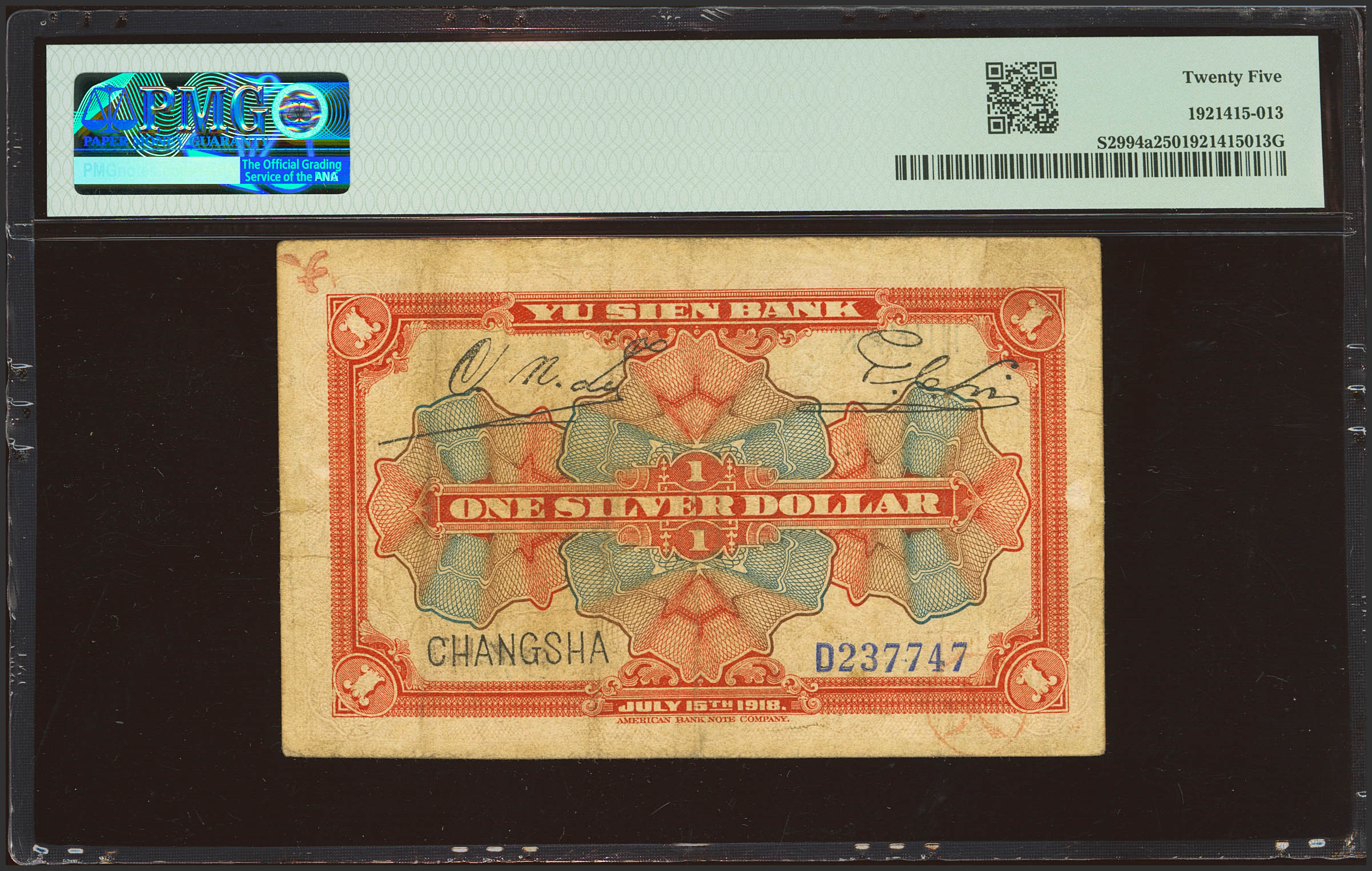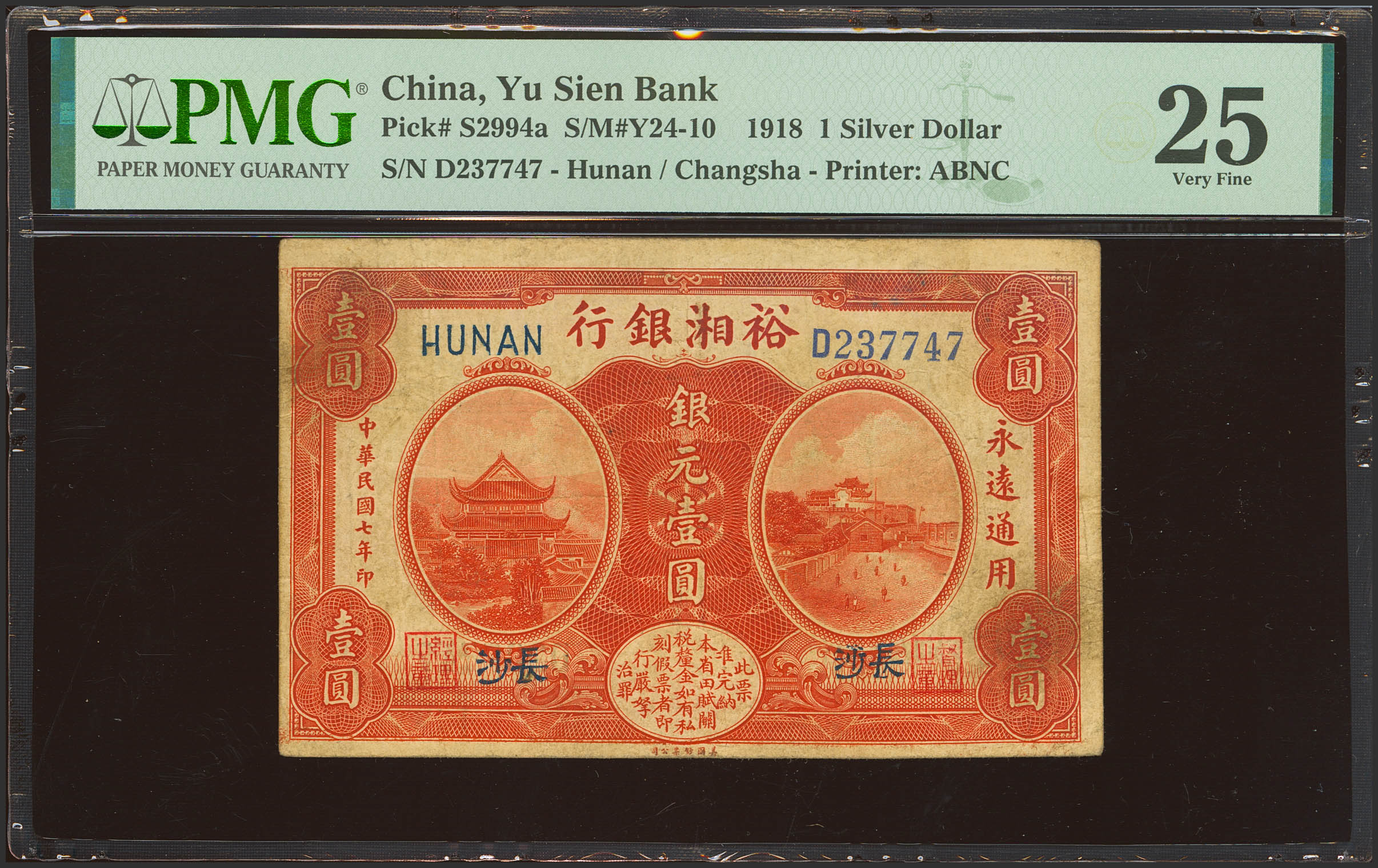 CHINA. 1 Silver Dollar. 15 July 1918. Yü Hsiang Bank. Hunan. Changsha. (Pick: S2994a, SM: Y24-10). PMG25.