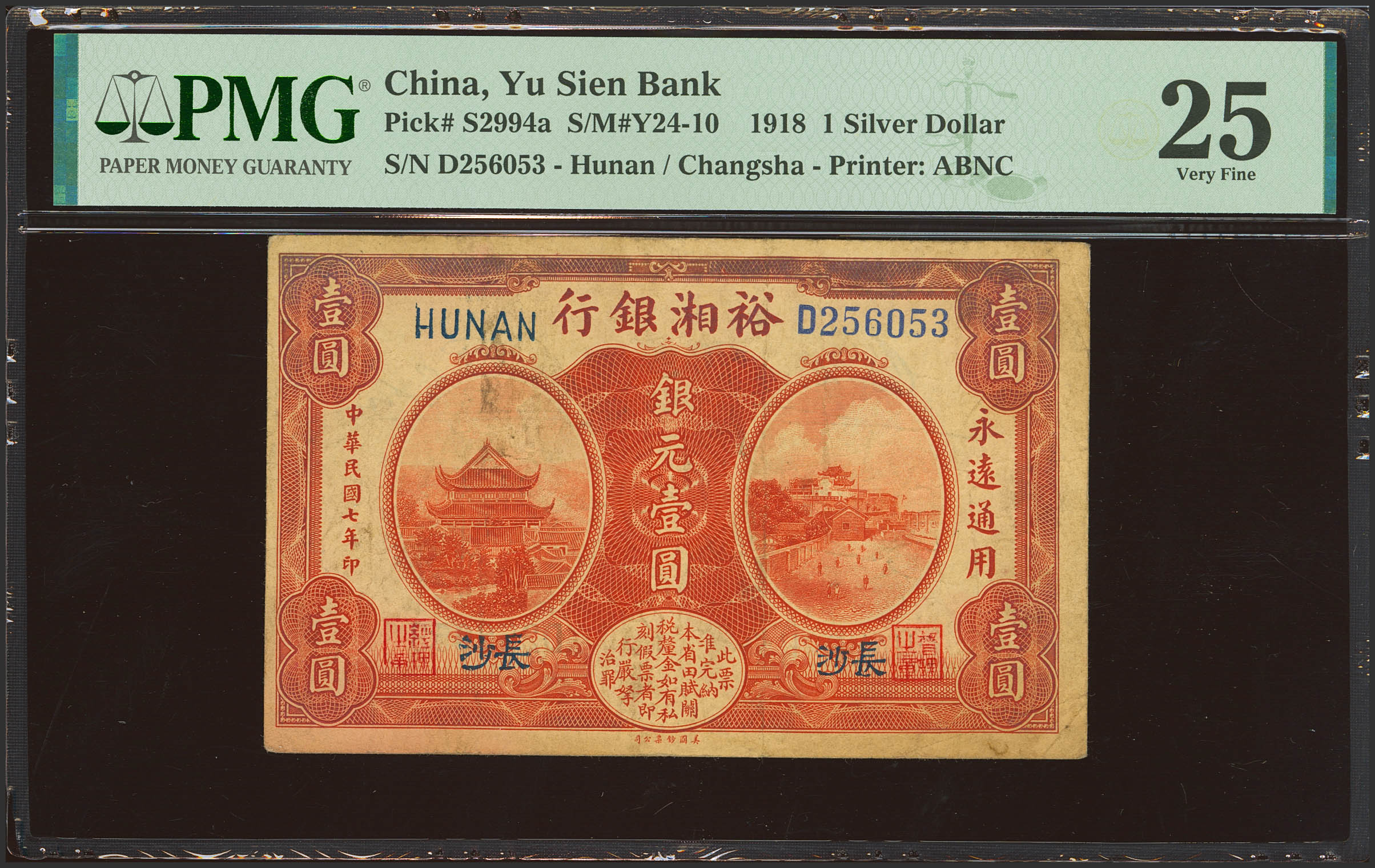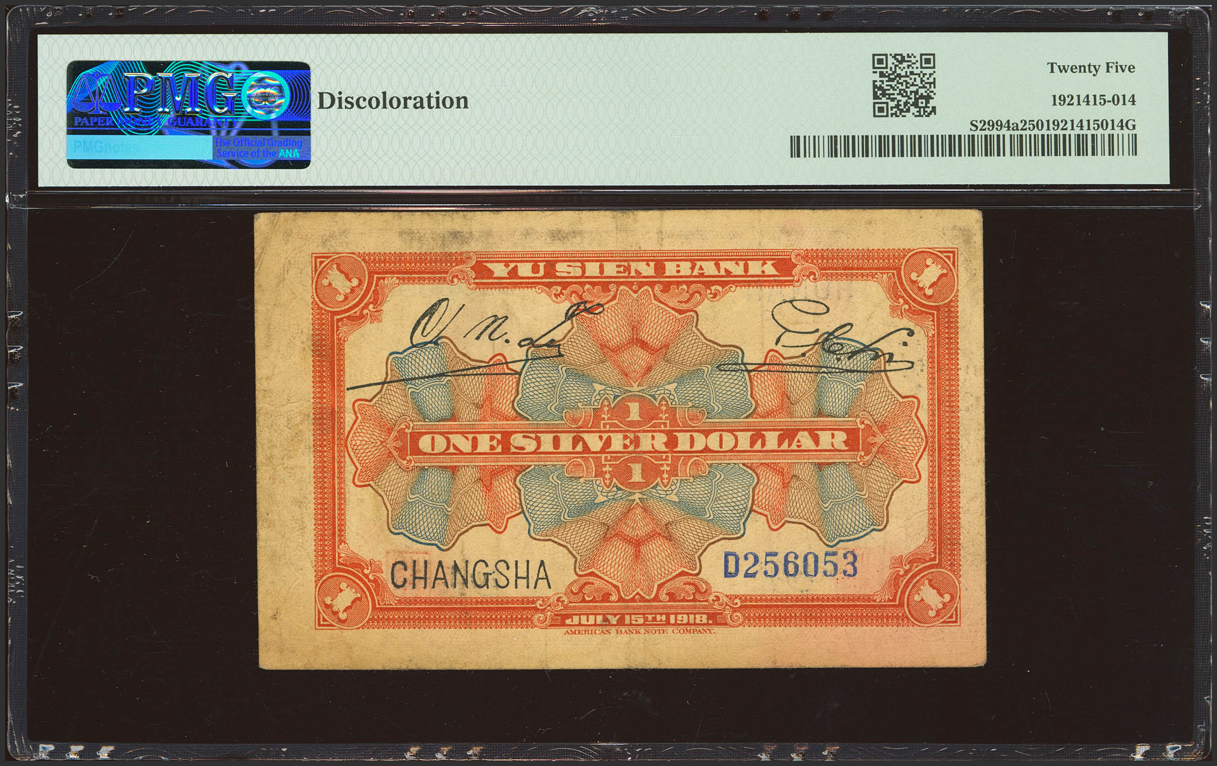 CHINA. 1 Silver Dollar. 15 July 1918. Yü Hsiang Bank. Hunan. Changsha. (Pick: S2994a, SM: Y24-10). PMG25 (discoloration).