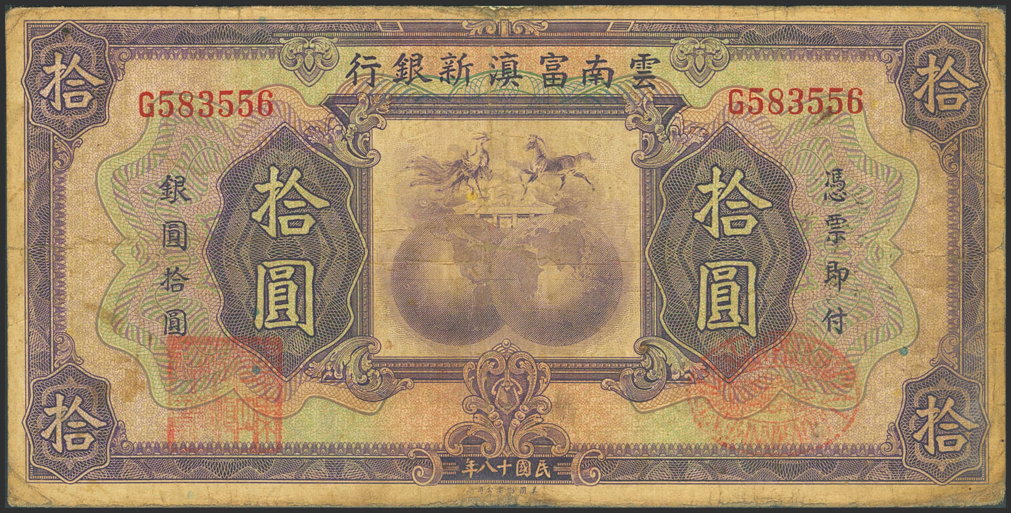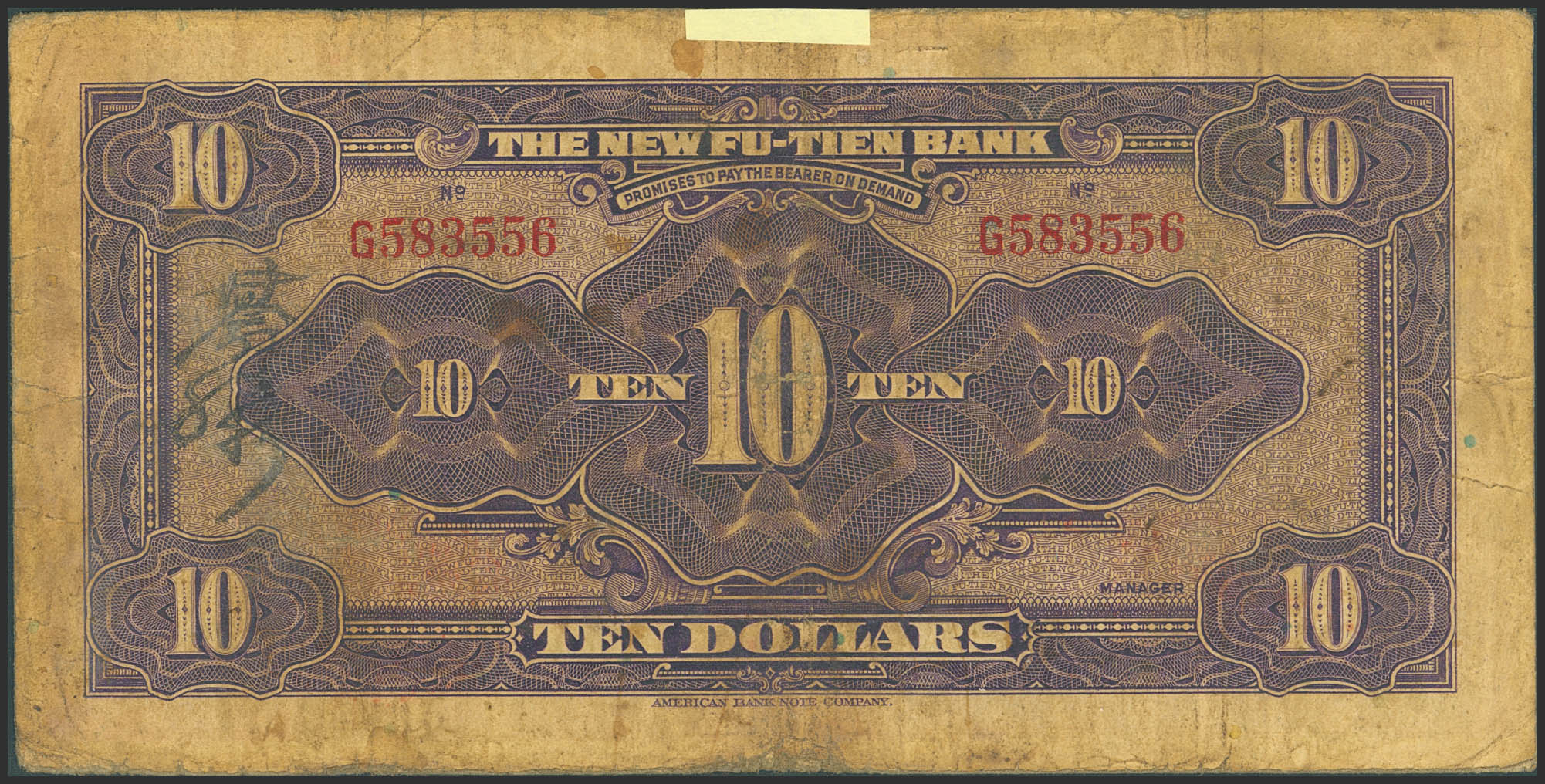 CHINA. 10 Dollars. 1929. New Fu-Tien Bank. (Pick: S2998a). Adhesive paper added to the top edge. Fine.