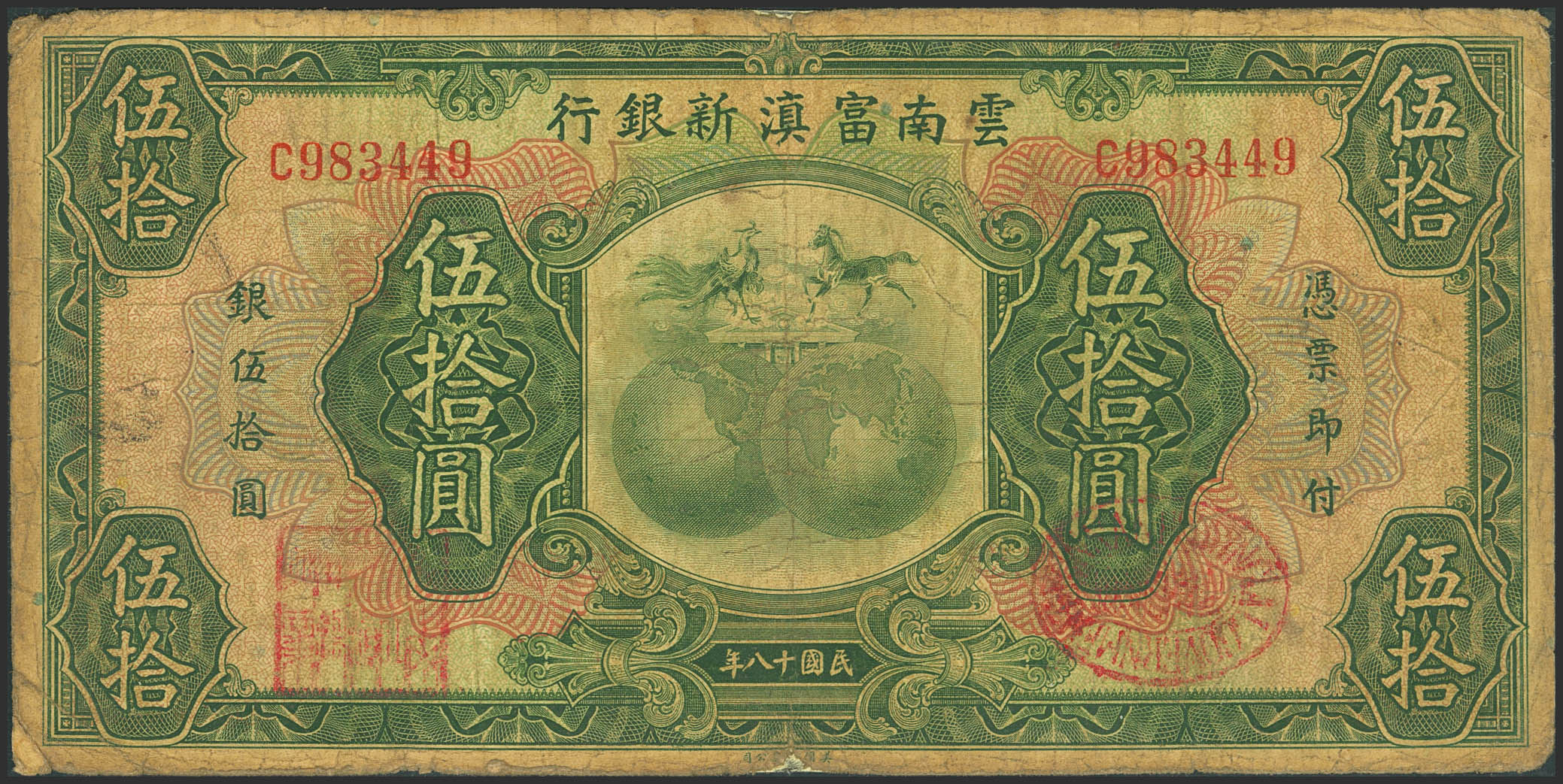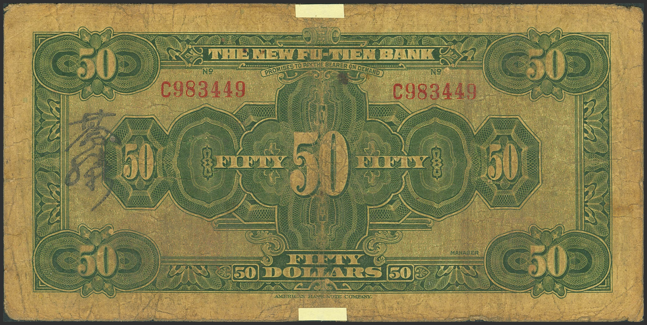 CHINA. 50 Dollars. 1929. New Fu-Tien Bank. (Pick: S2999a). Adhesive paper added to the top and bottom edges. Fine.