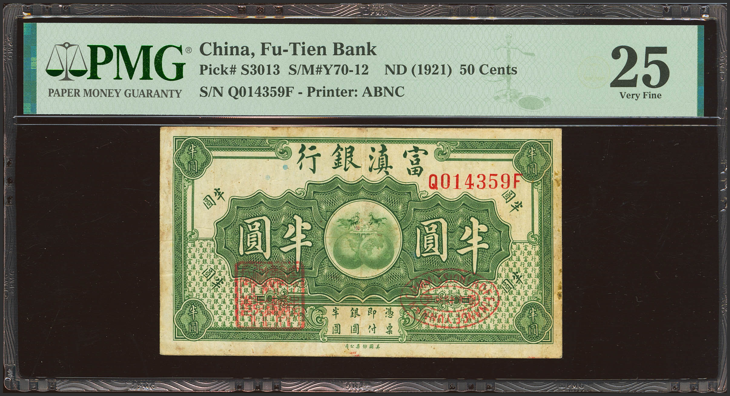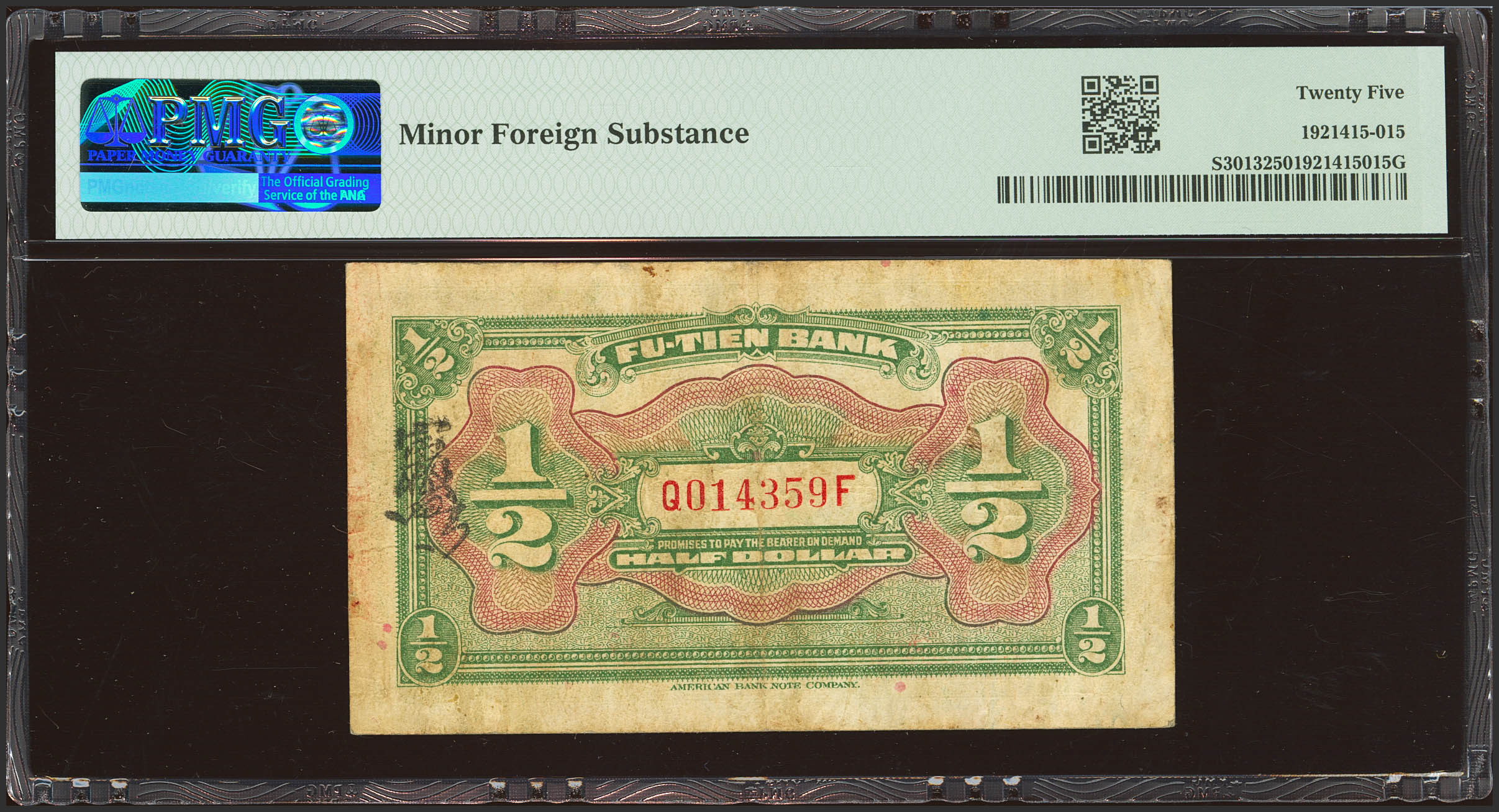 CHINA. 50 Cents. (1921ca). Fu-Tien Bank. (Pick: S3013, SM: Y70-12). PMG25 (minor foreign substance).