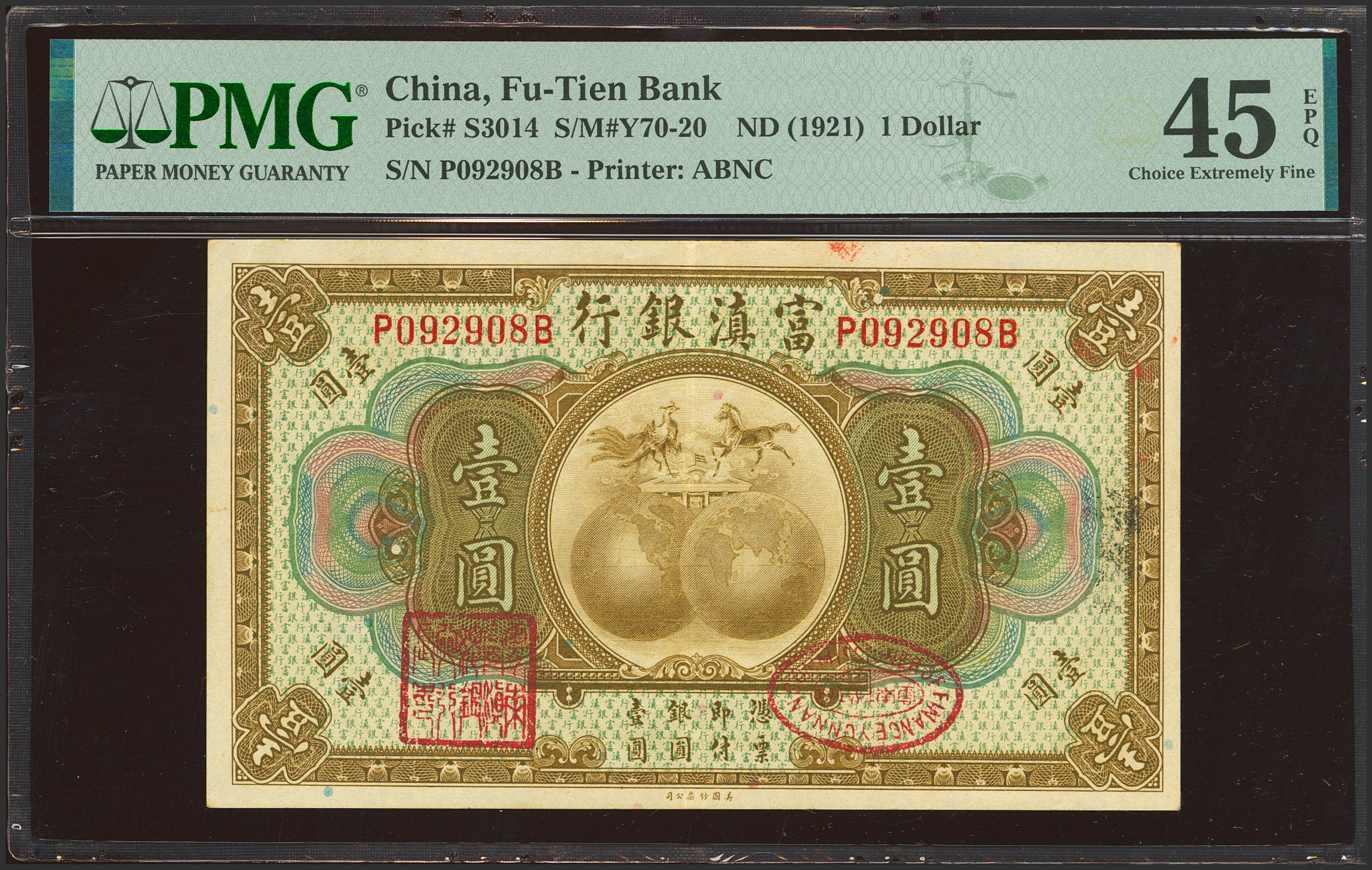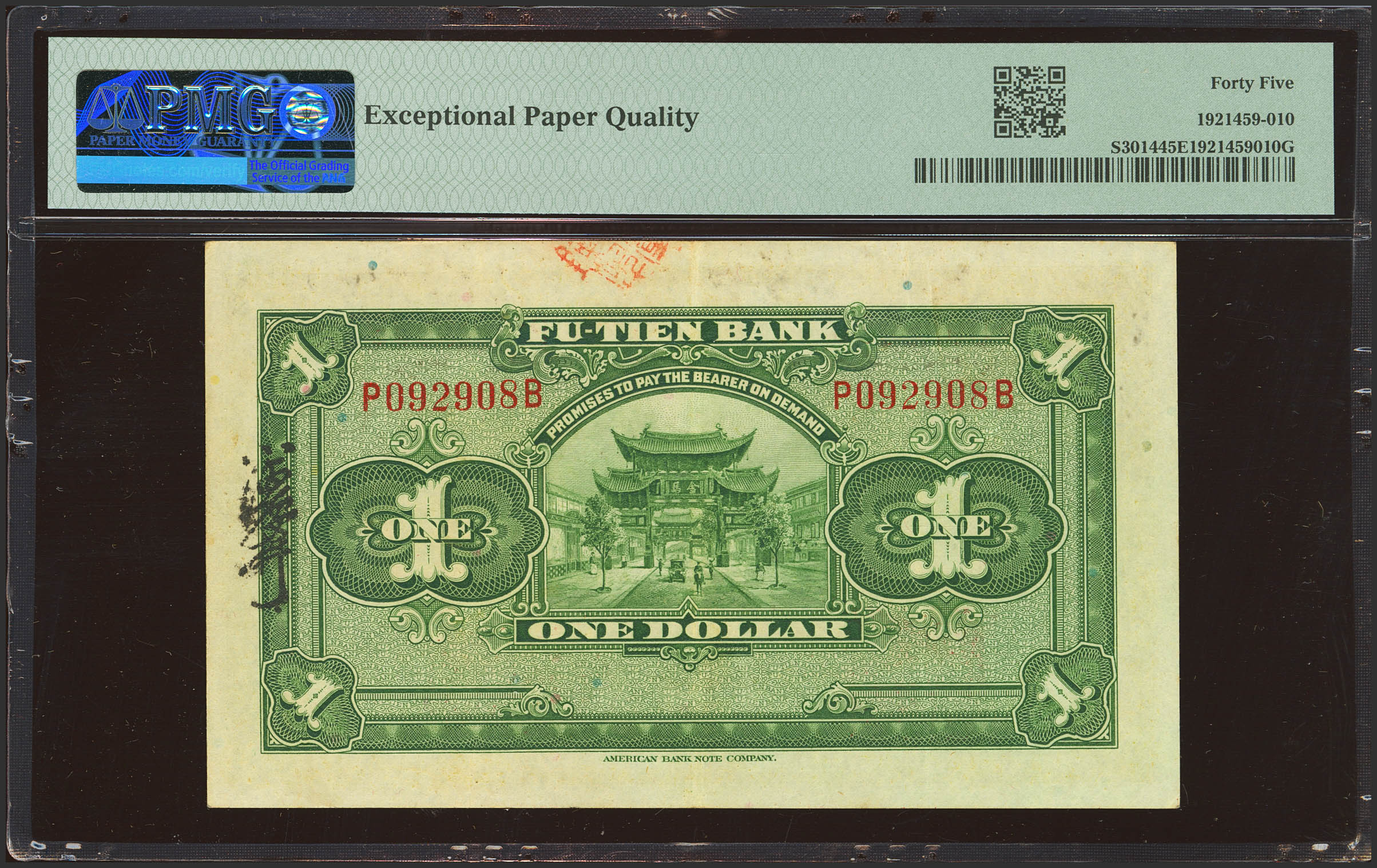 CHINA. 1 Dollar. (1921ca). Fu-Tien Bank. (Pick: S3014, SM: Y70-20). PMG45EPQ.
