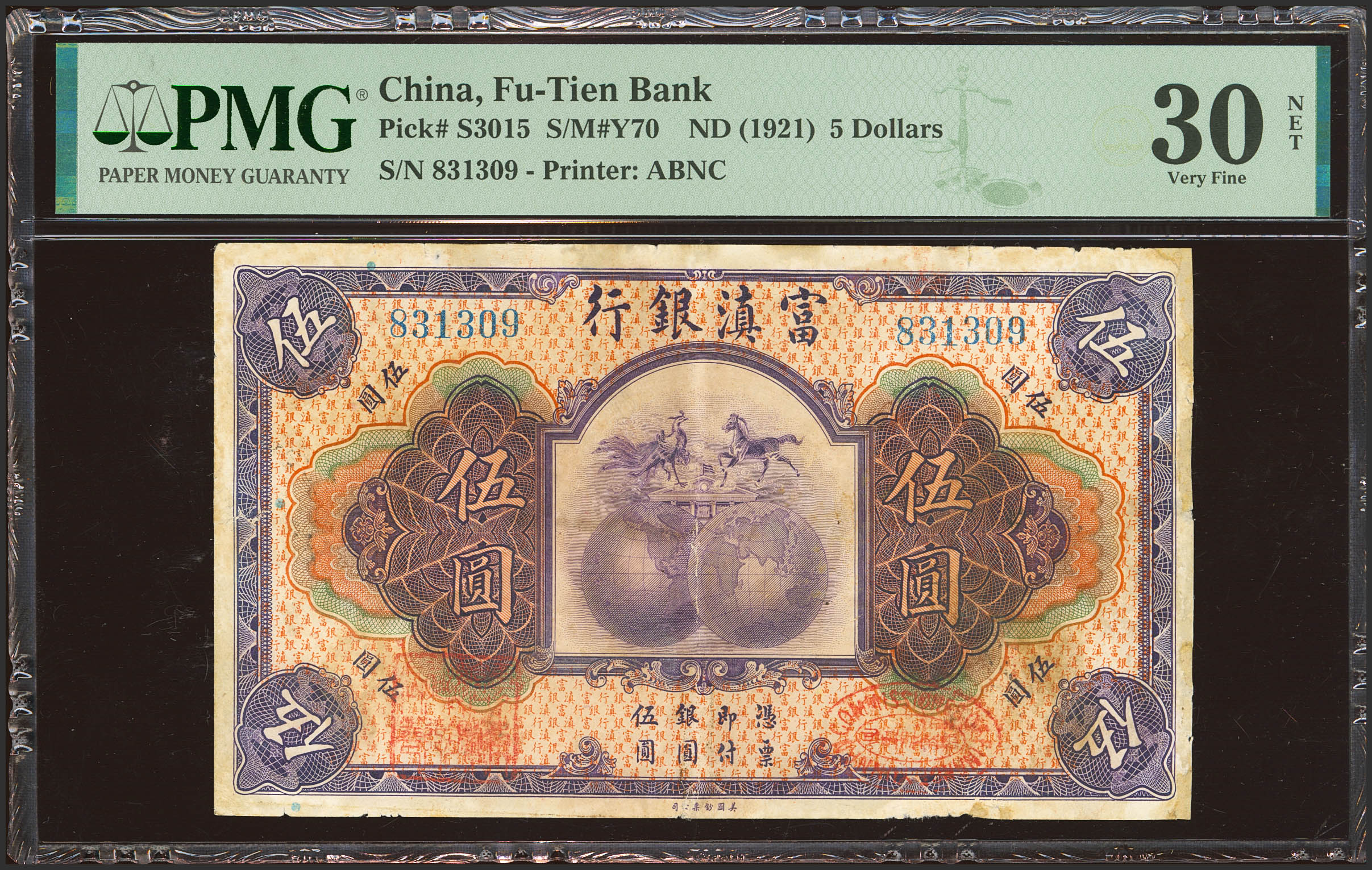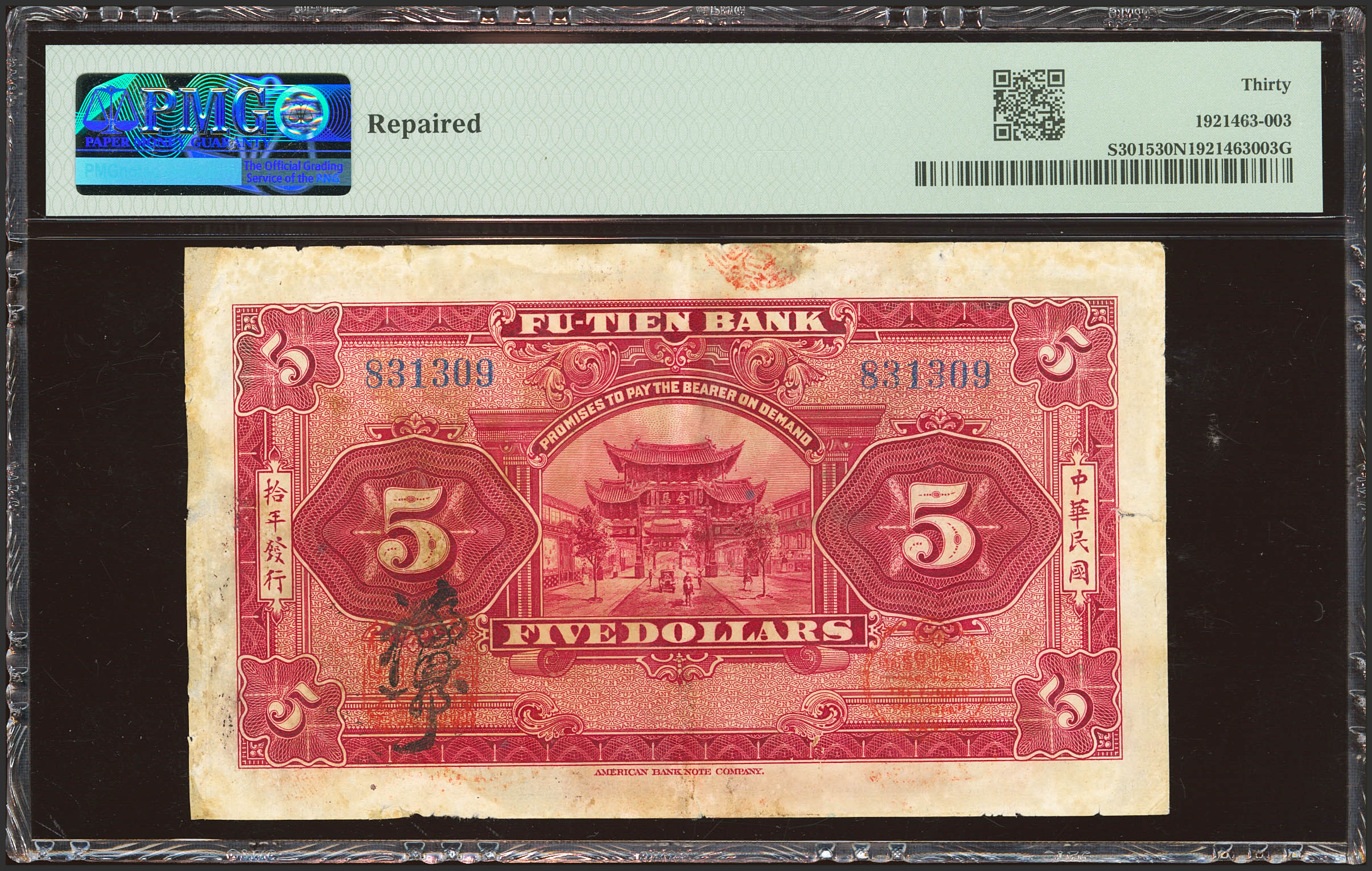 CHINA. 5 Dollars. (1921ca). Fu-Tien Bank. (Pick: S3015a, SM: Y70). PMG30NET (repaired).