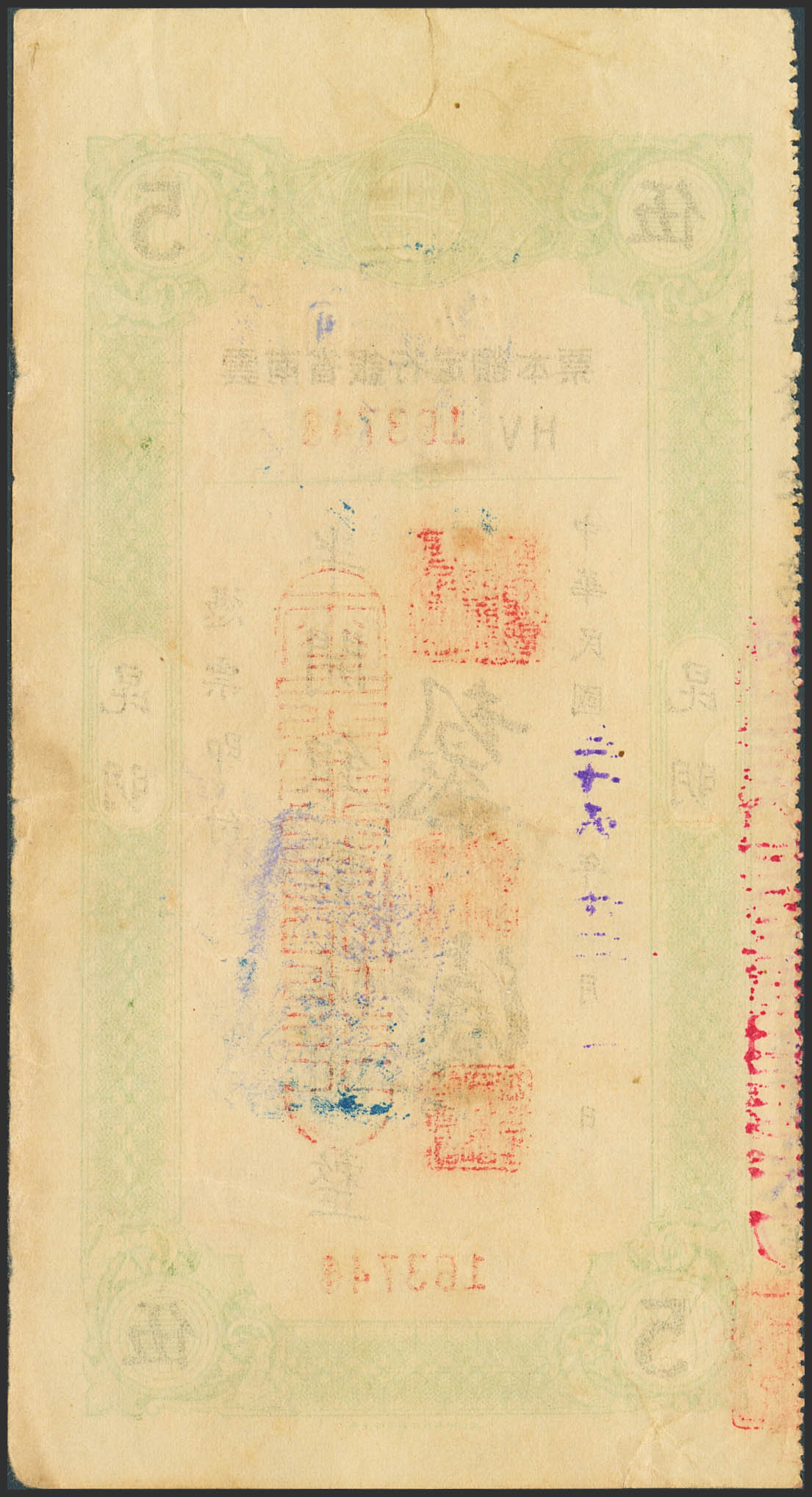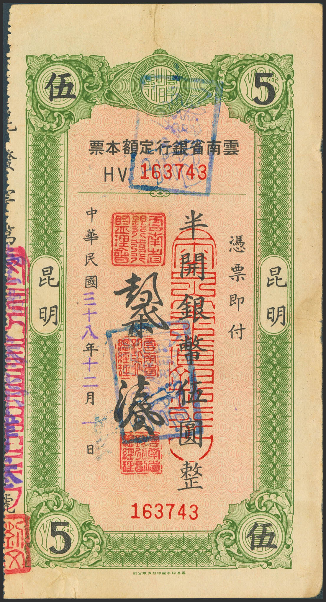 CHINA. 5 Dollars. 1949. Yunnan Provincial Bank. (Pick: S3031). More than Extremely Fine.