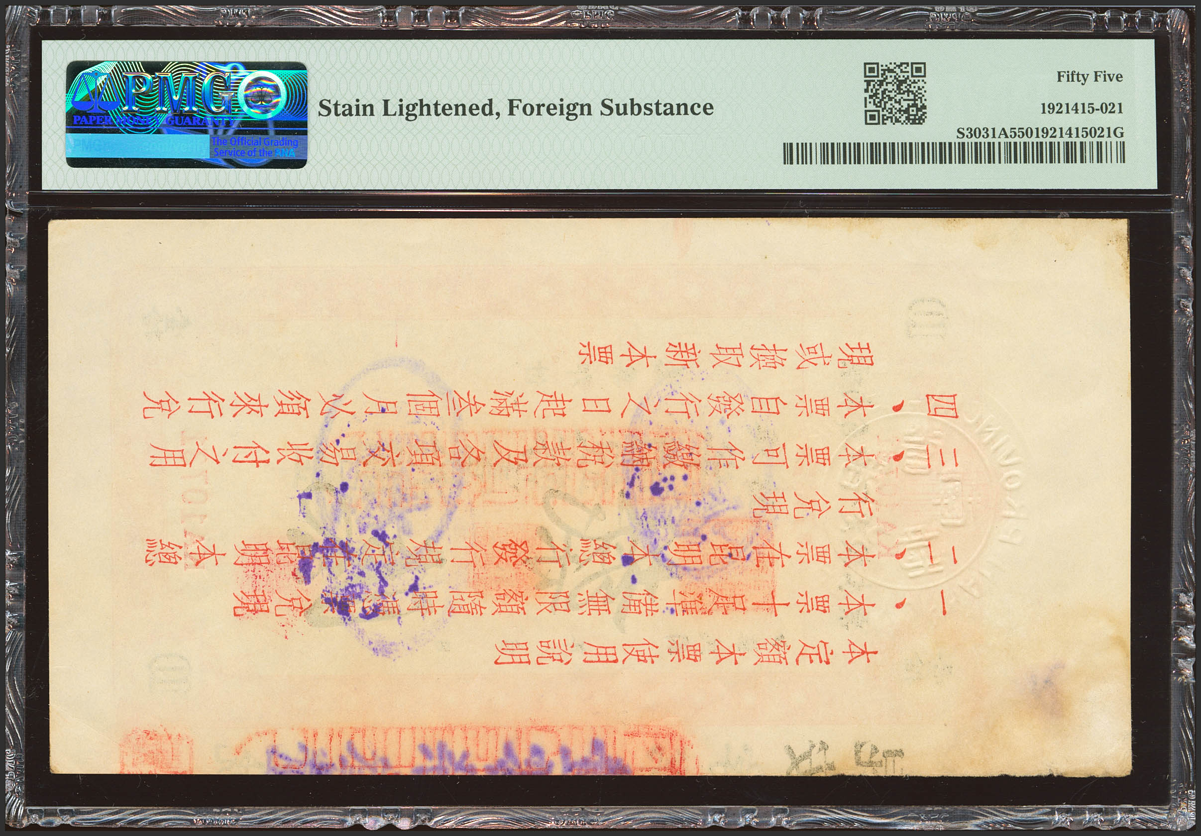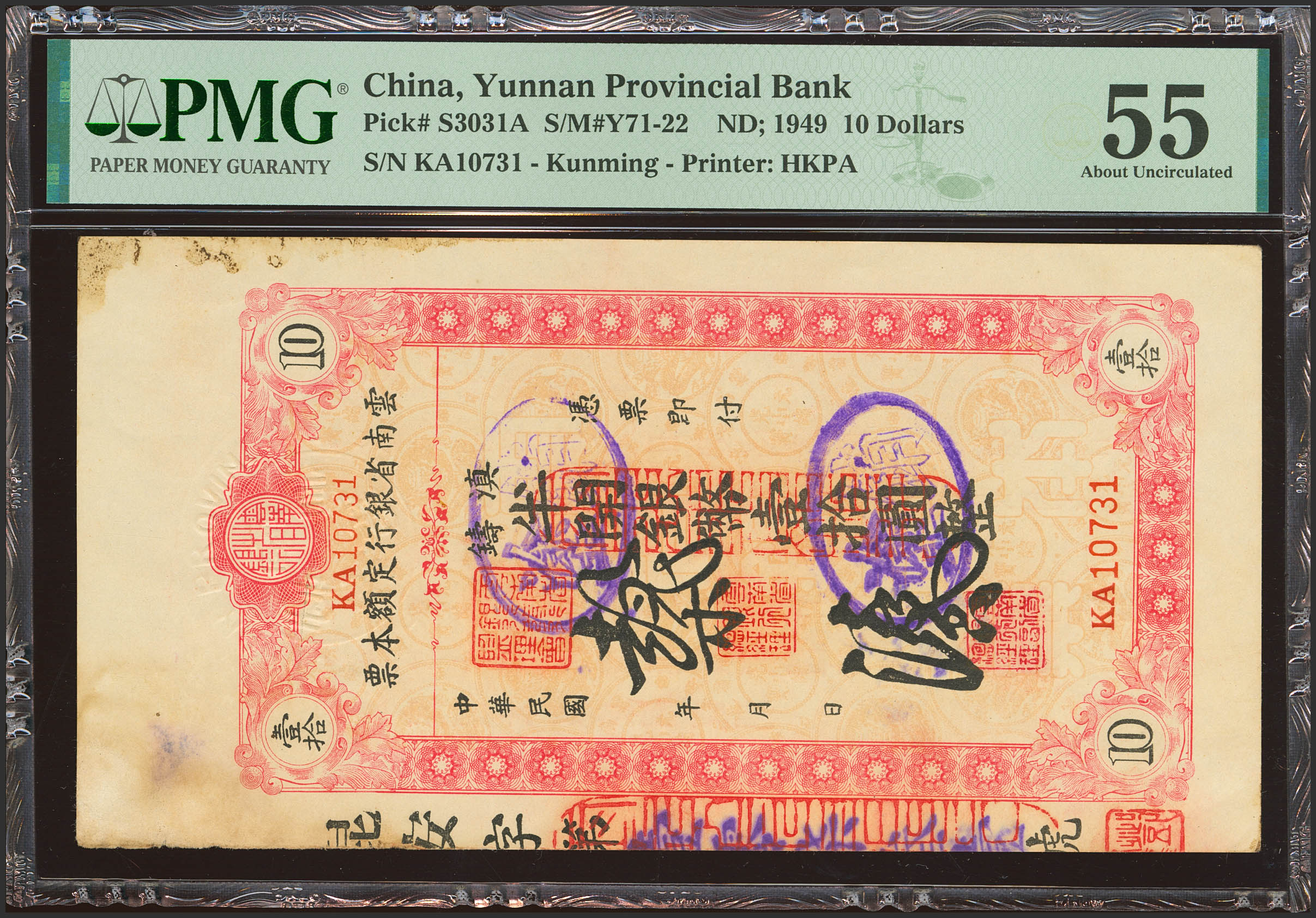 CHINA. 10 Dollars. 1949. Yunnan Provincial Bank. (Pick: S3031A, SM: Y71-22). PMG55 (stain lightened, foreign substance).