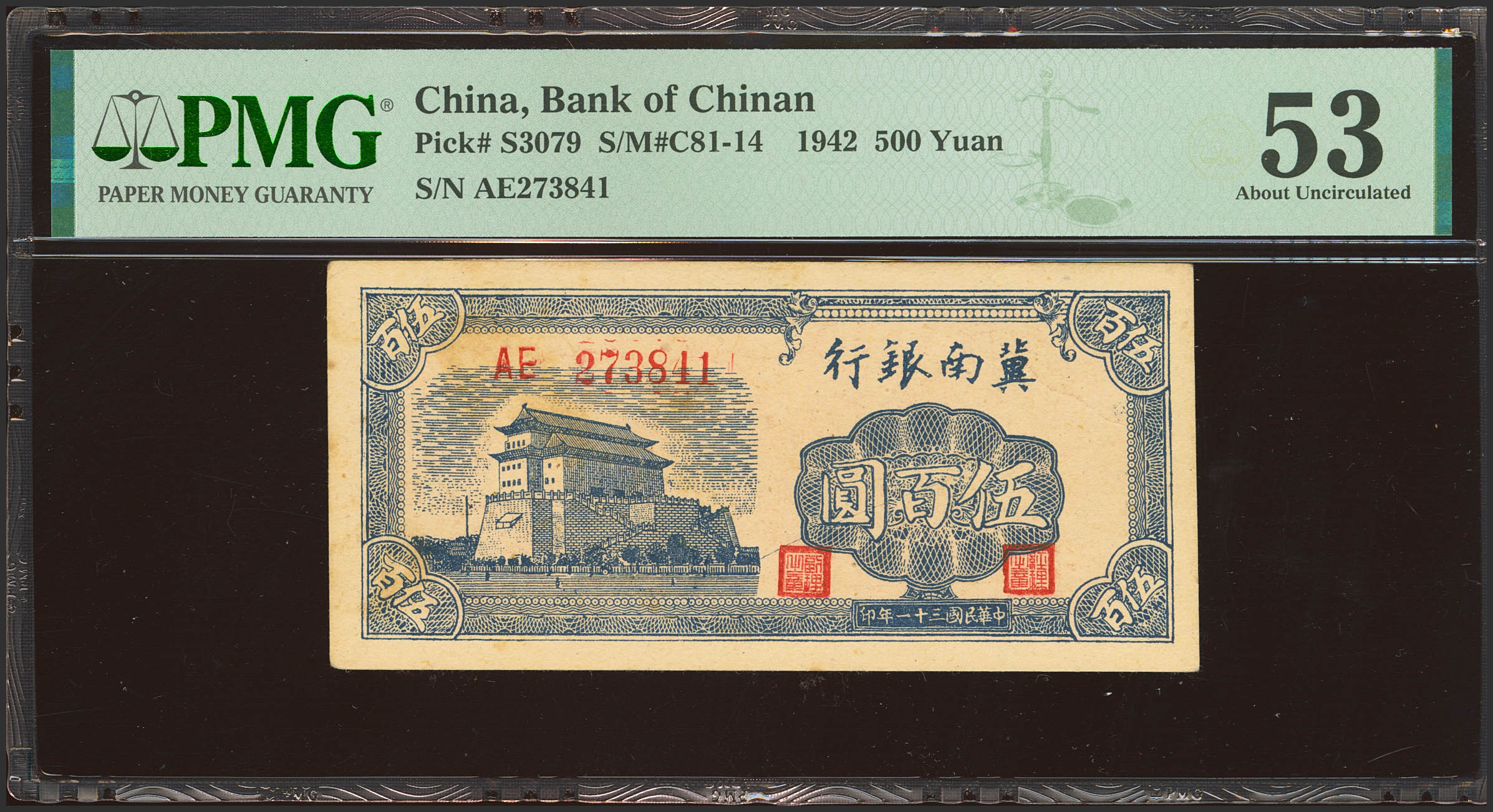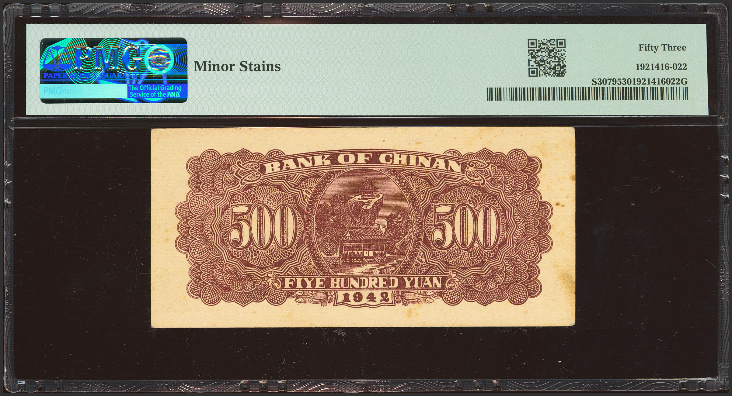 CHINA. 500 Yuan. 1942. Bank of Chinan. (Pick: S3079, SM: C81-14). PMG53 (minor stains).