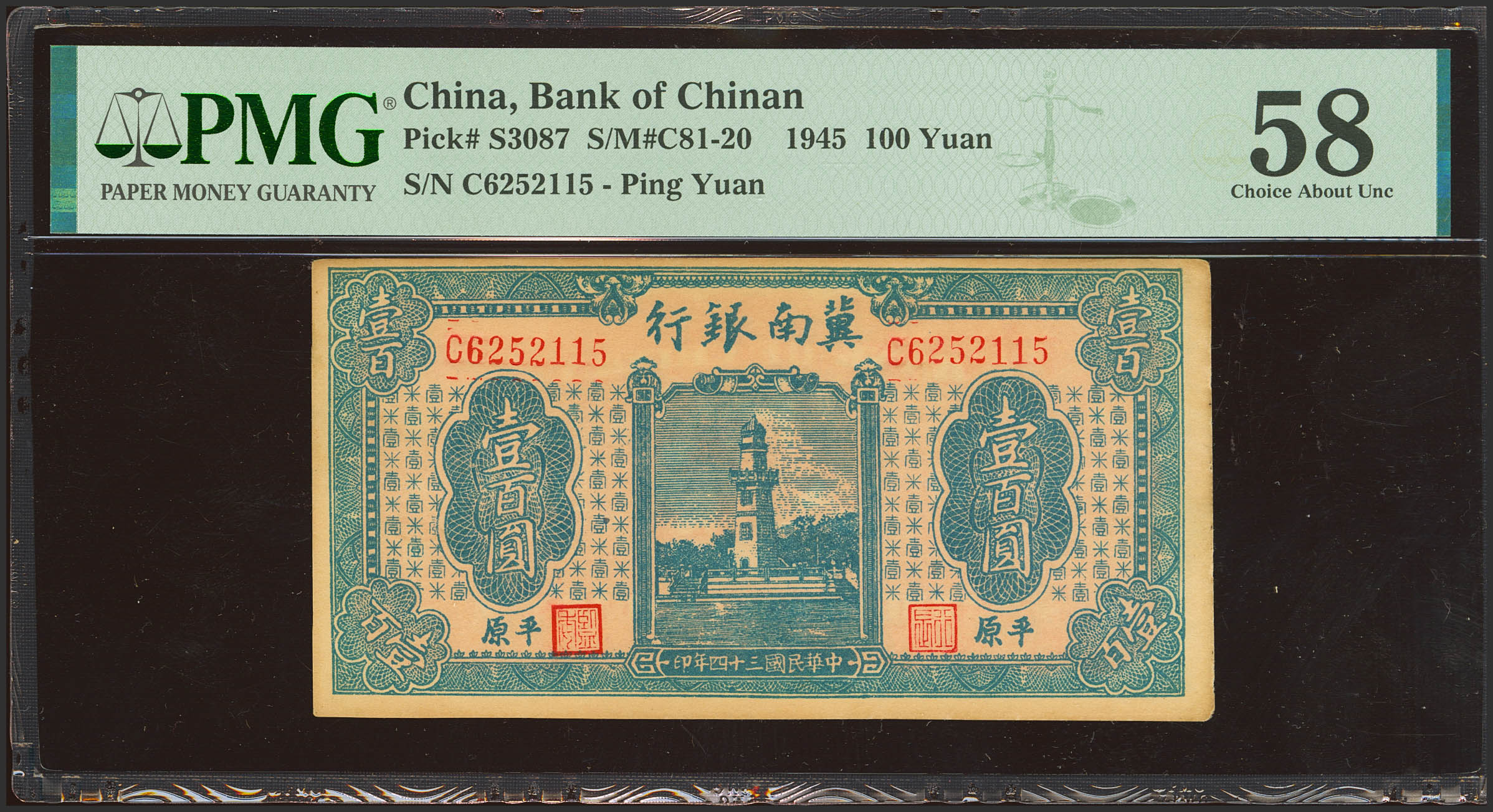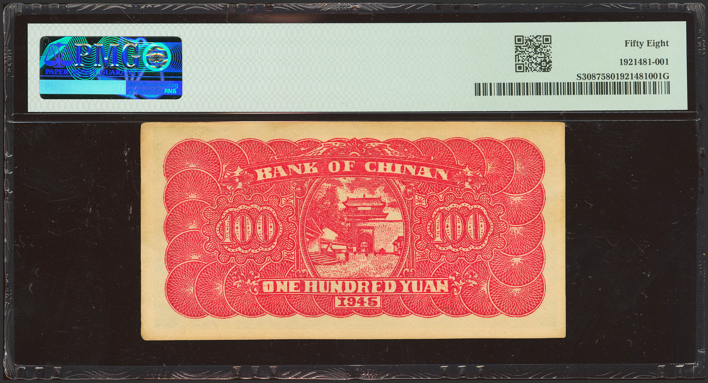 CHINA. 100 Yuan. 1945. Bank of Chinan. (Pick: S3087, SM: C81-20). PMG58.