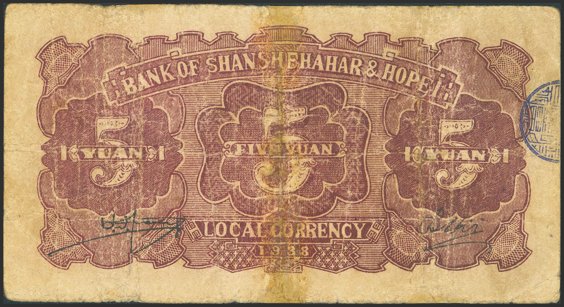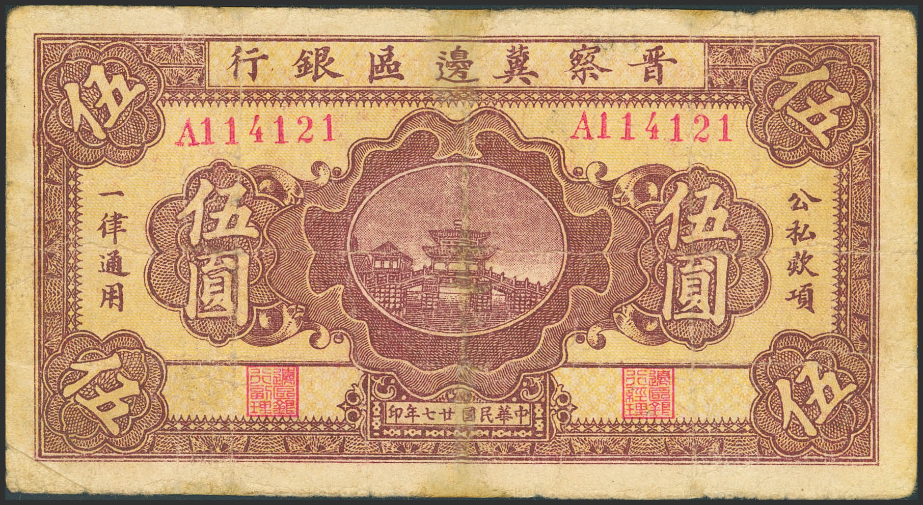 CHINA. 5 Yuan. 1938. Bank of Shansi. Chahar and Hopei. (Pick: S3140). Restored. Fine.