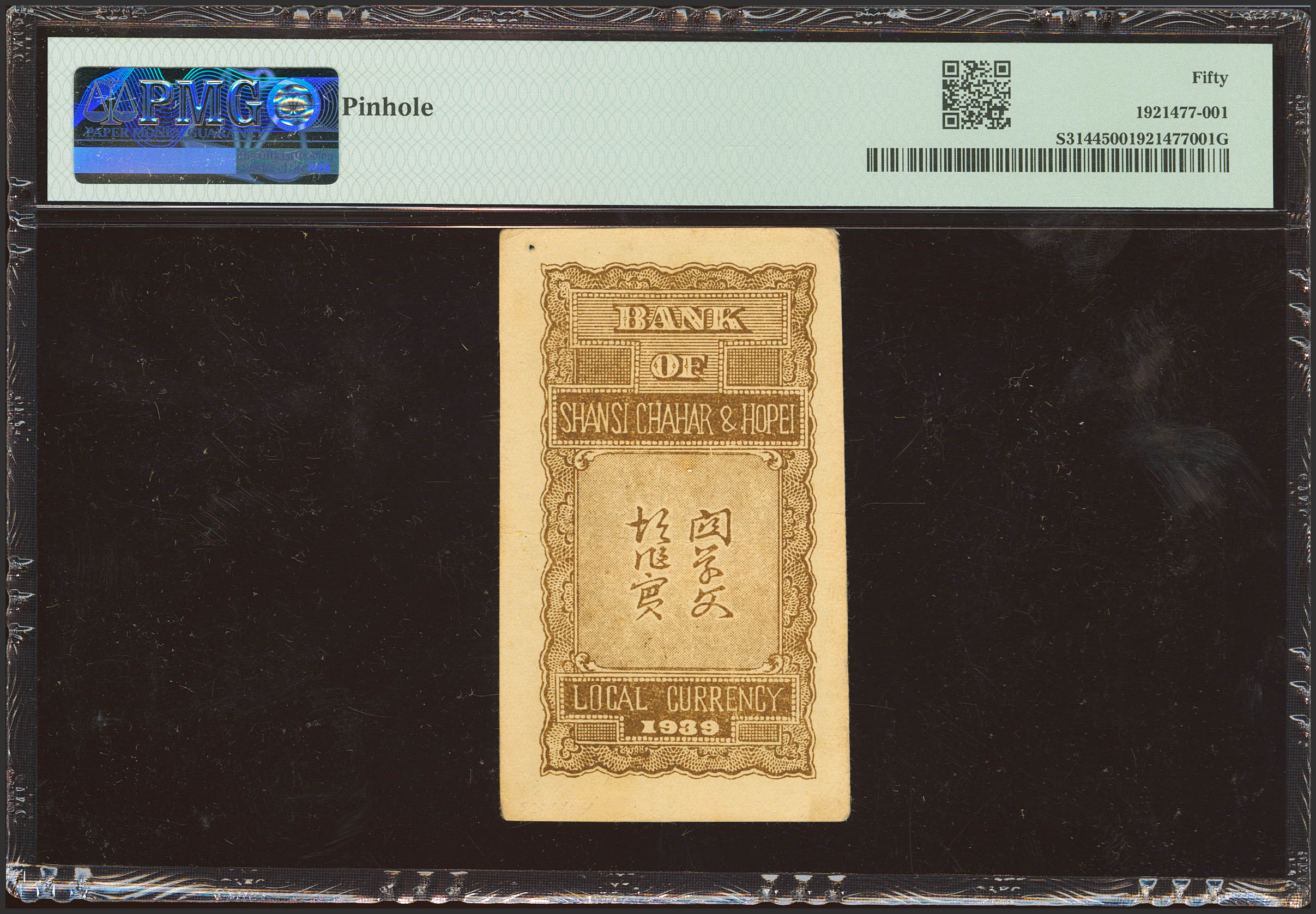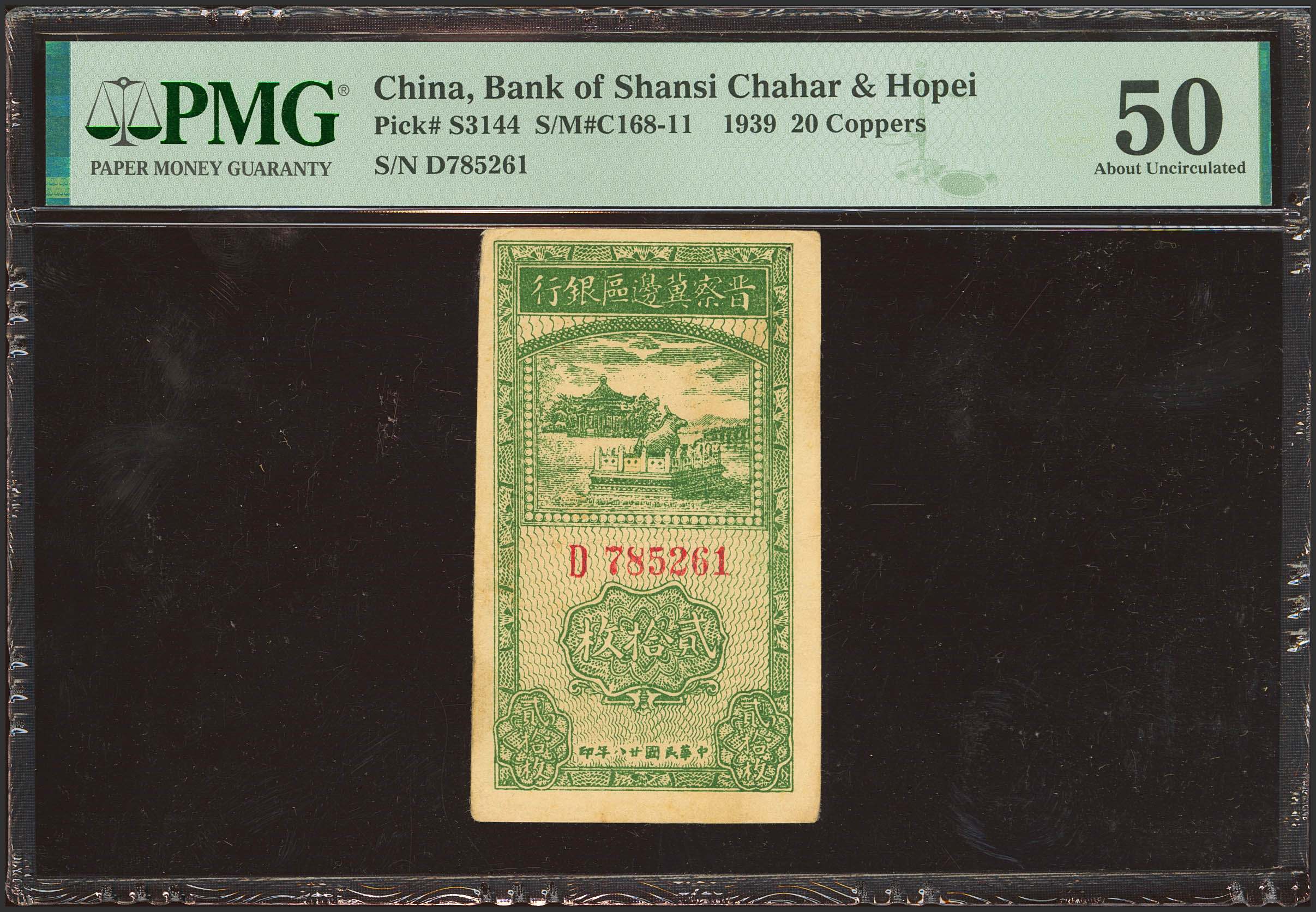CHINA. 20 Coppers. 1939. Bank of Shansi. Chahar and Hopei. (Pick: S3144, SM: C168-11). PMG50 (pinhole).