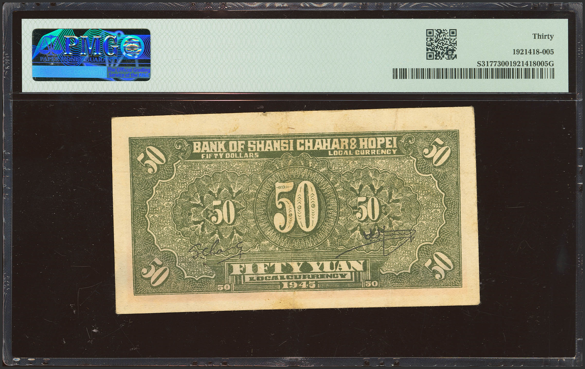 CHINA. 50 Yuan. 1945. Bank of Shansi. Chahar and Hopei. (Pick: S3177, SM: C168-76). PMG30.