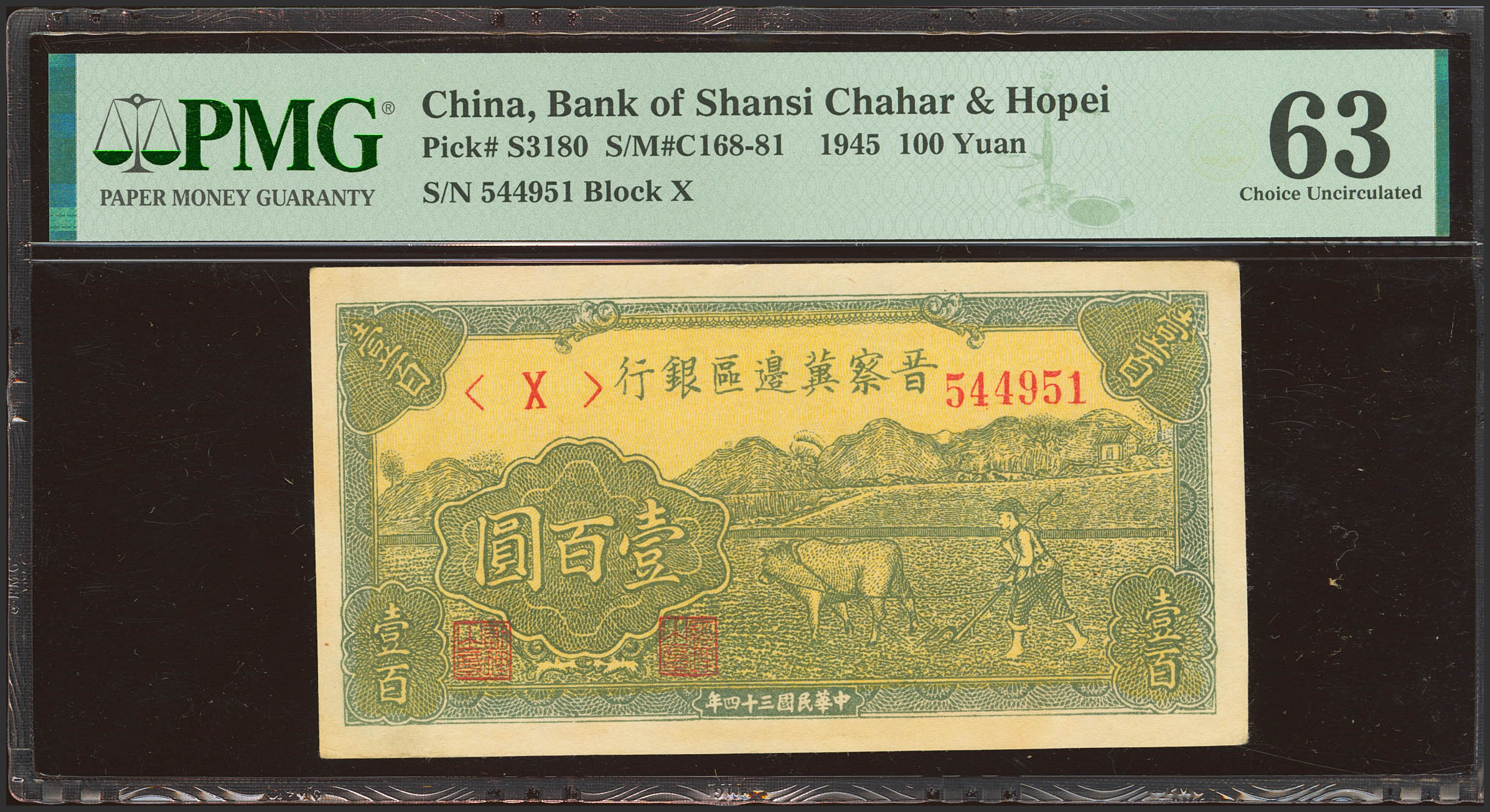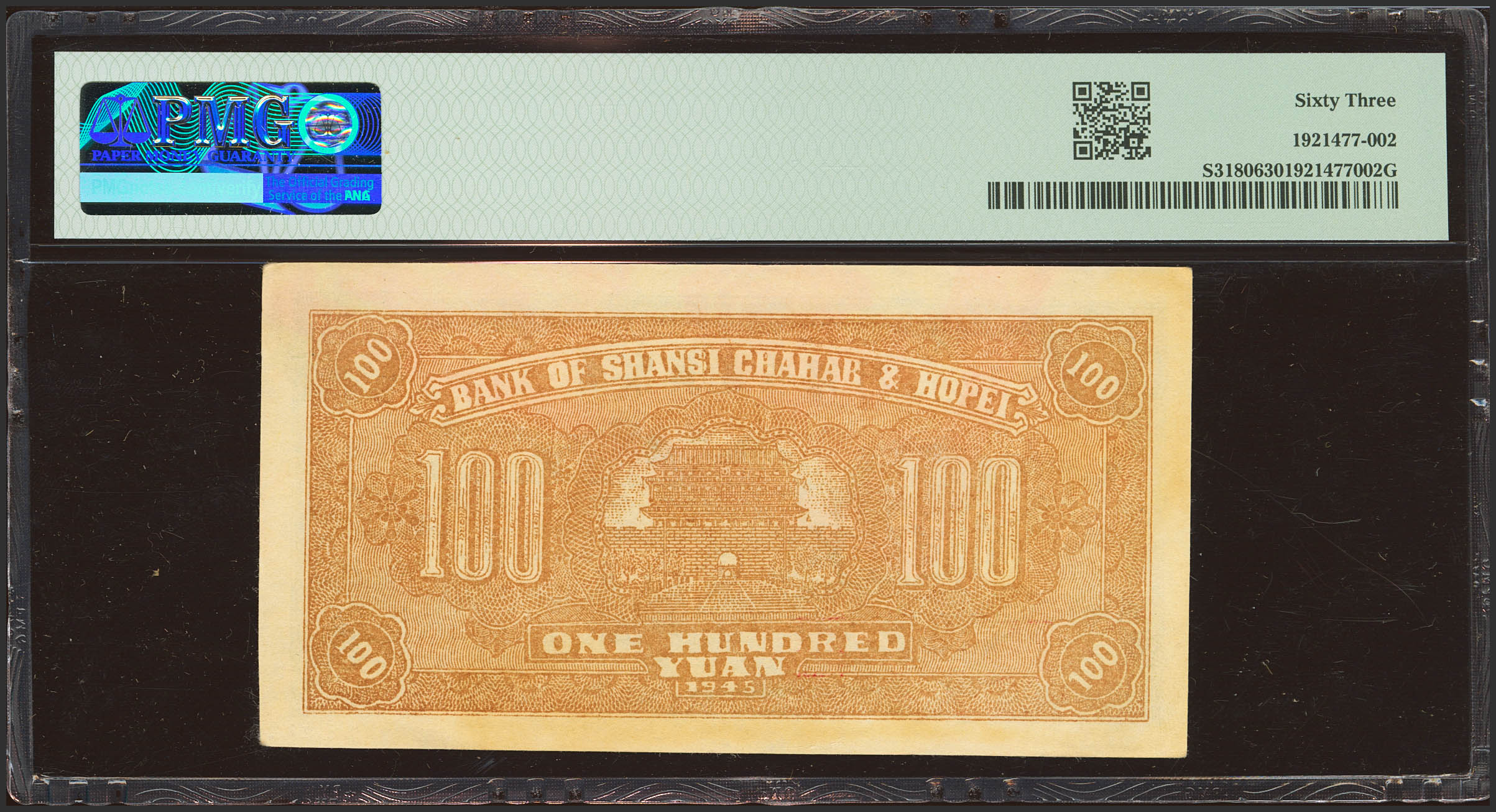 CHINA. 100 Yuan. 1945. Bank of Shansi. Chahar and Hopei. (Pick: S3180, SM: C168-81). PMG63.