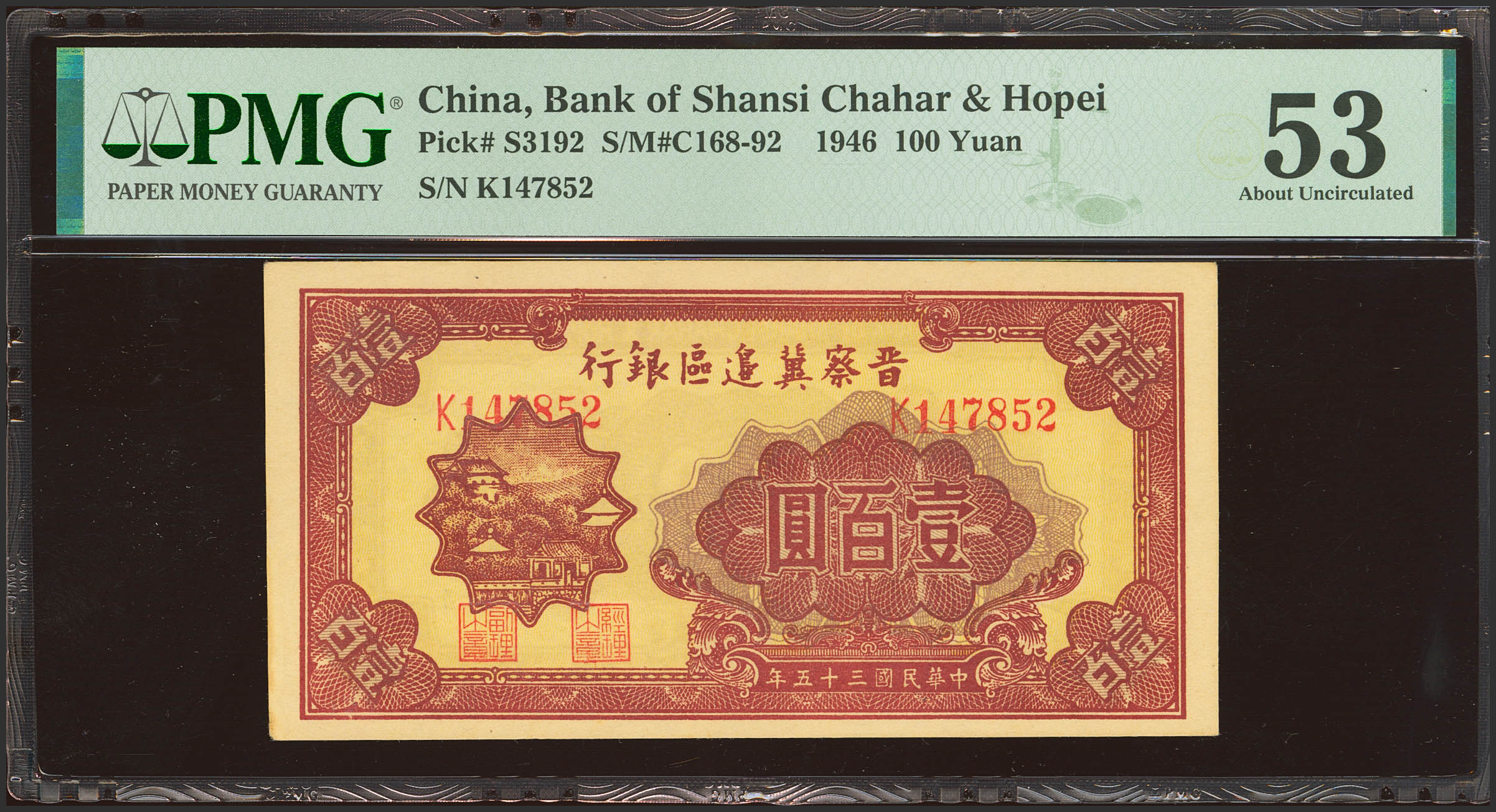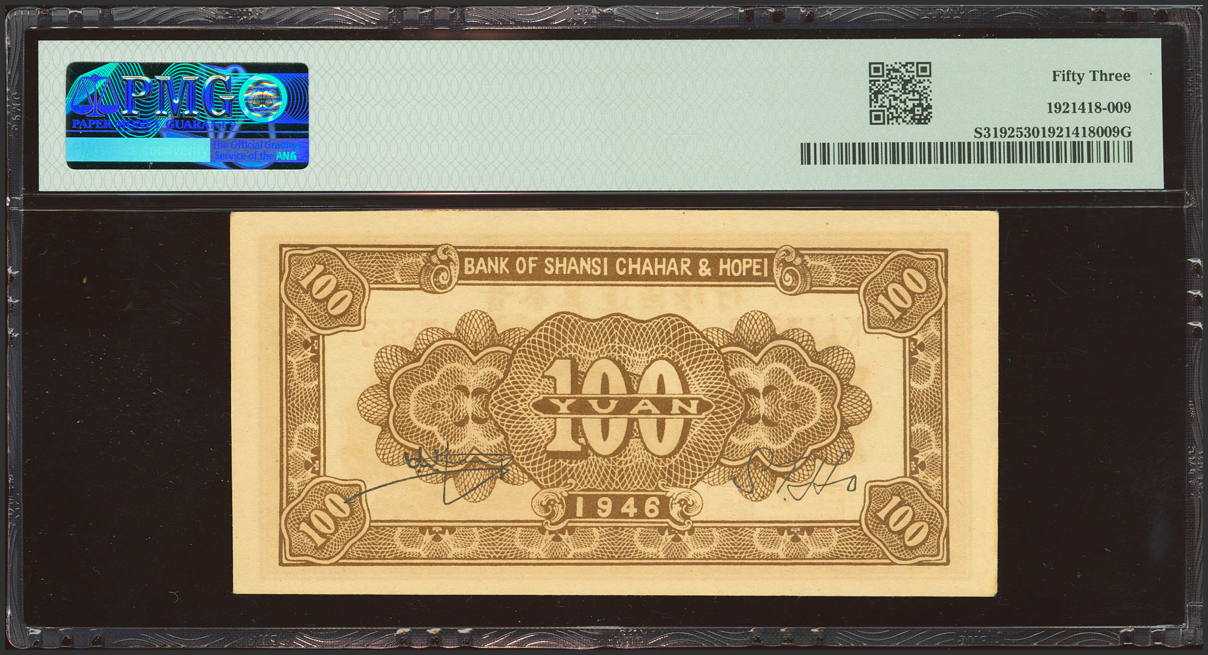 CHINA. 100 Yuan. 1946. Bank of Shansi. Chahar and Hopei. (Pick: S3192, SM: C168-92). PMG53.