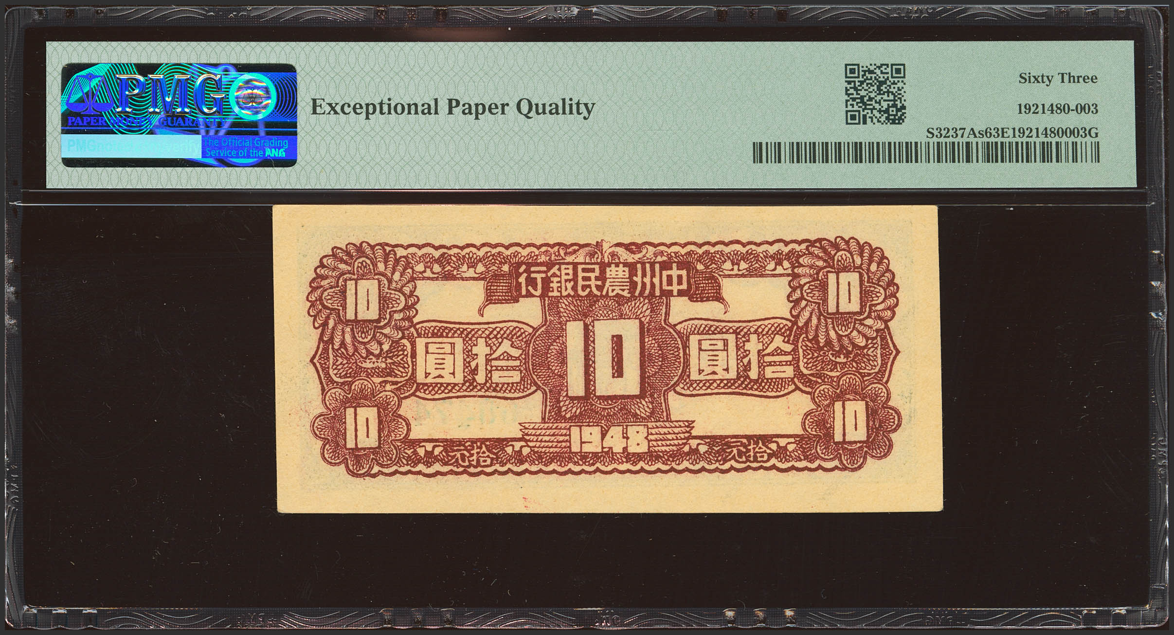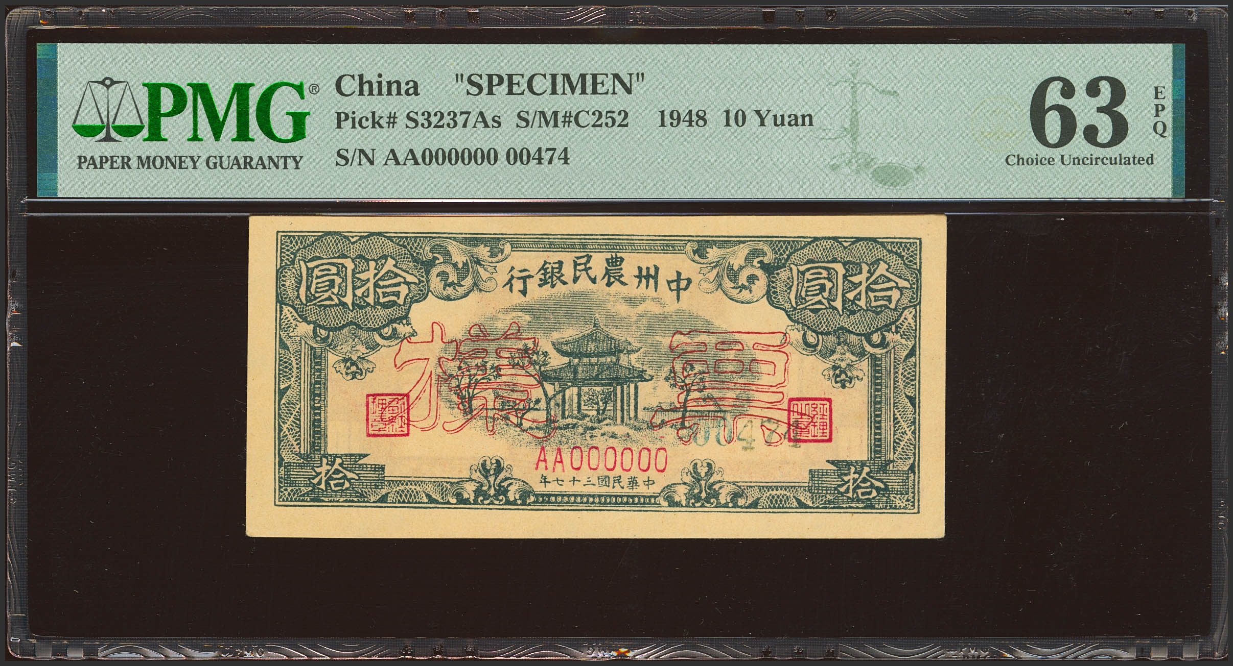 CHINA. 10 Yuan. 1948. Farmers Bank of Chung-Chou. Specimen. (Pick: S3237As, SM: C252). PMG63EPQ.