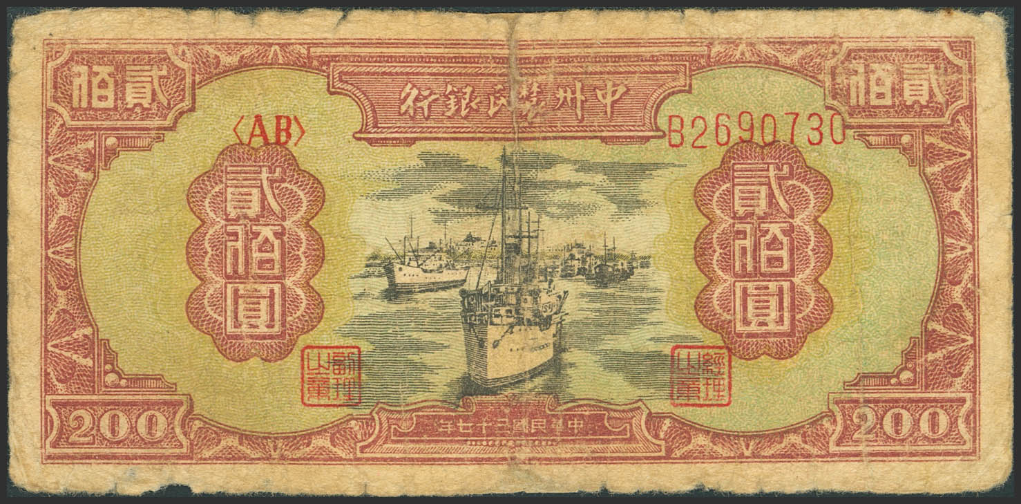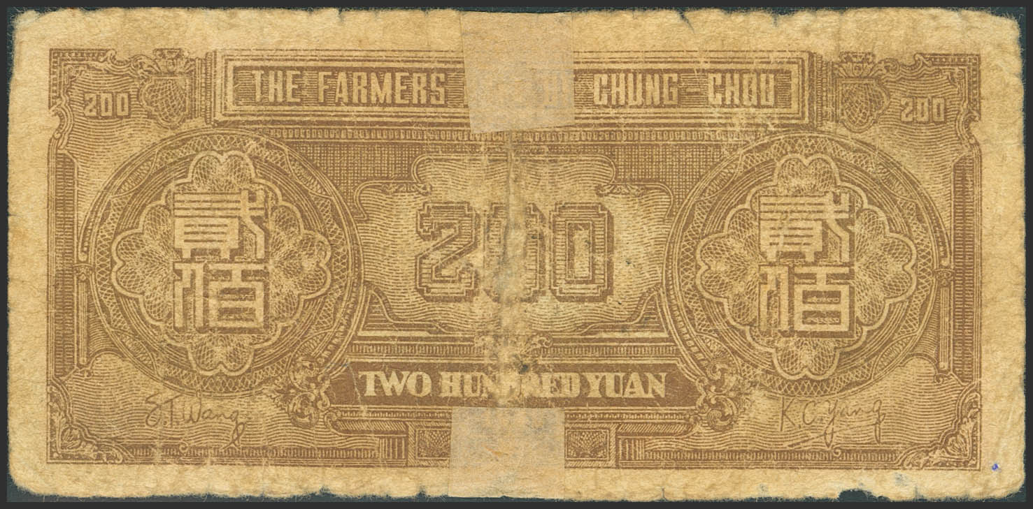 CHINA. 200 Yuan. 1948. Farmers Bank of Chung-Chou. (Pick: S3241). Tape added to the top and bottom tear of the central fold. Very Good.