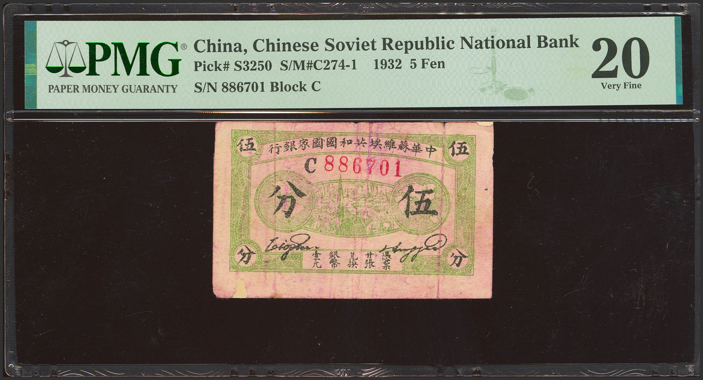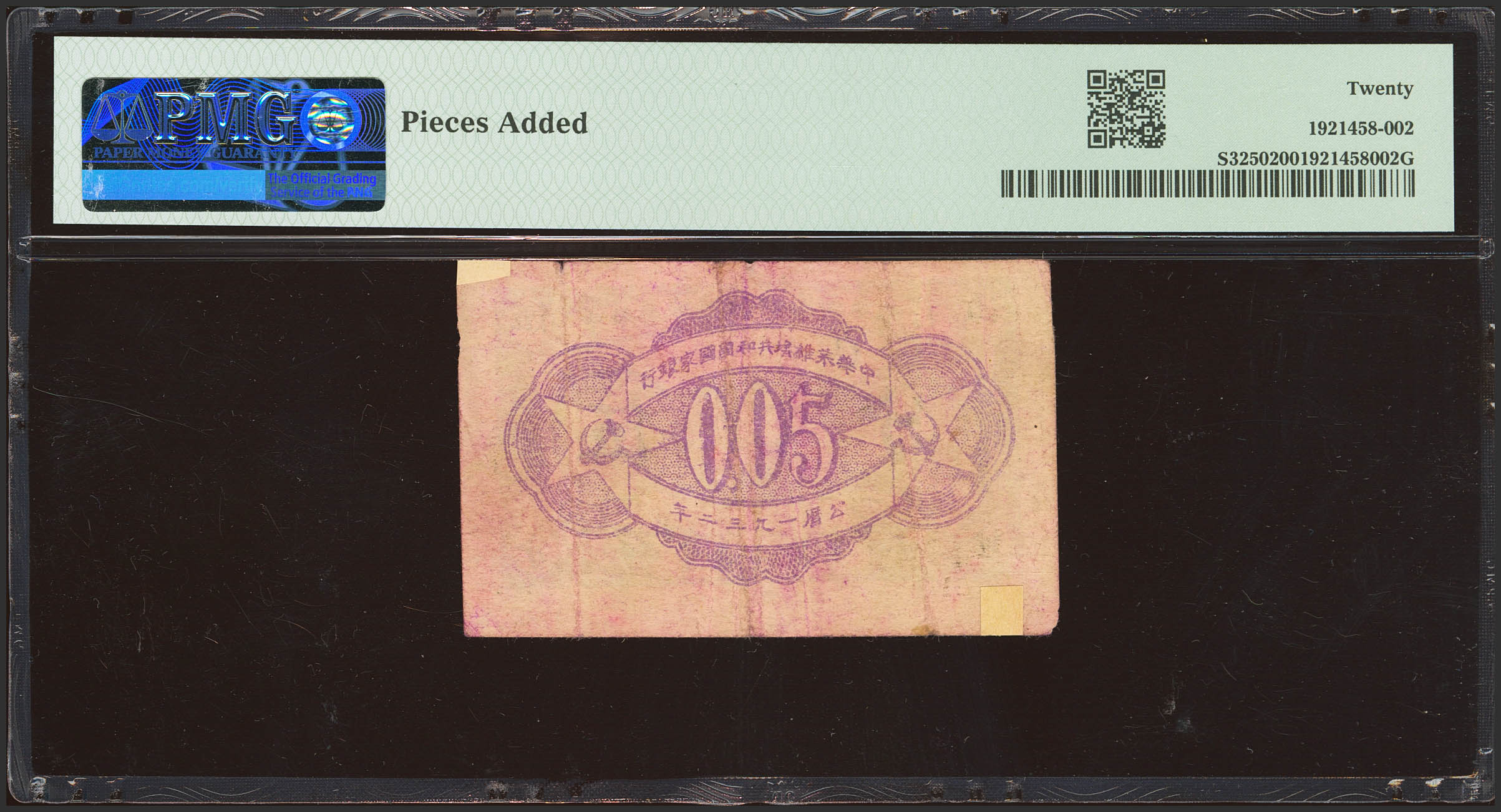 CHINA. 5 Fen. 1932. Chinese Soviet Republic National Bank. (Pick: S3250, SM: C274-1). Adhesive paper added to the top and bottom edges. PMG20 (pieces added).