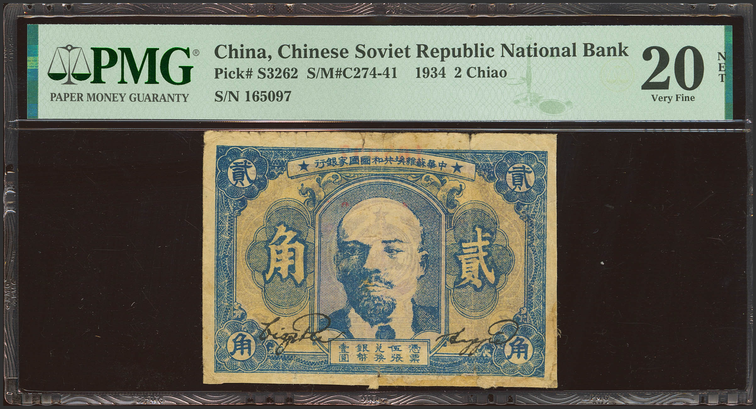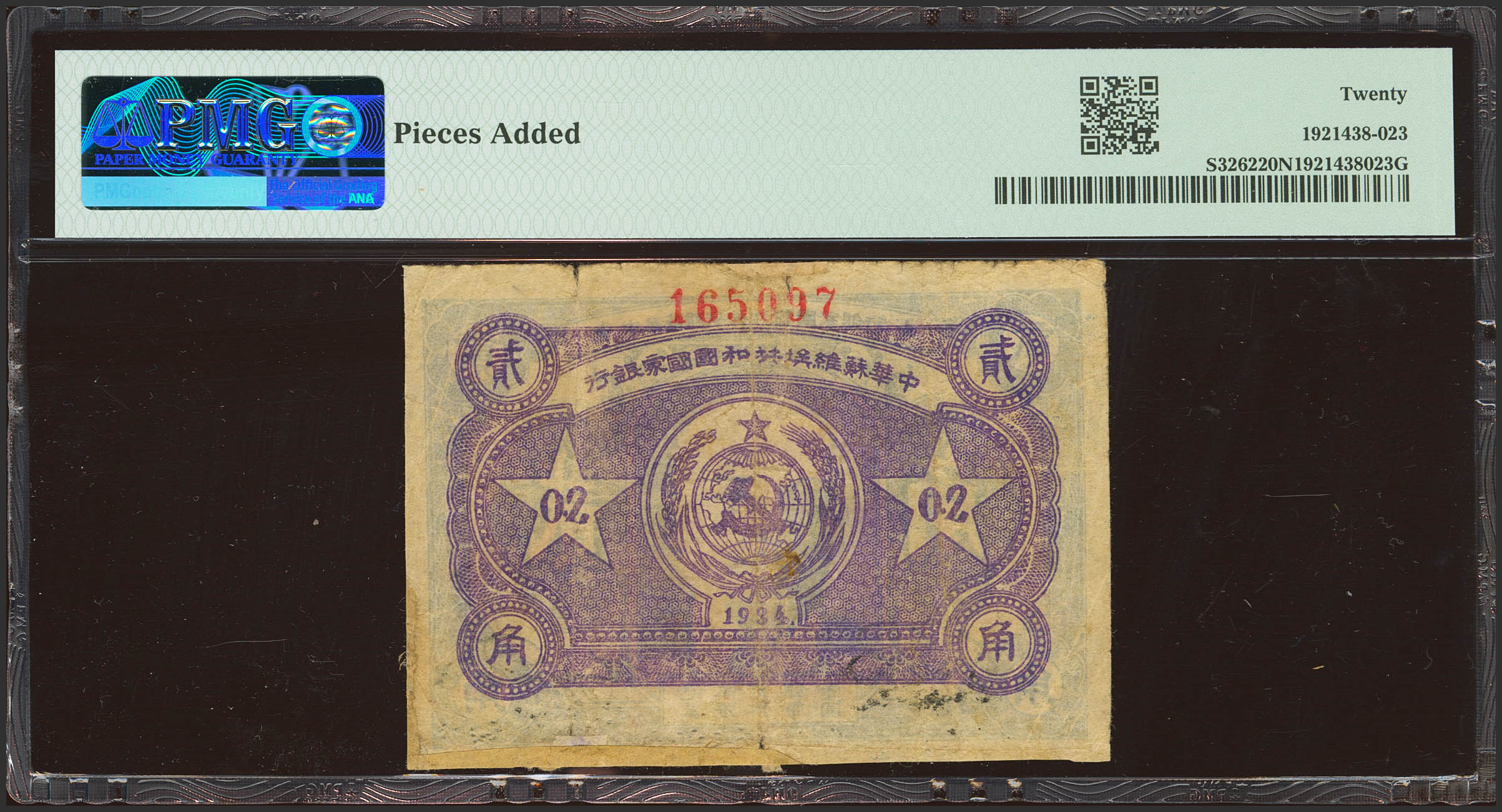 CHINA. 2 Chiao. 1934. Chinese Soviet Republic National Bank. (Pick: S3262, SM: C274-41). PMG20NET (pieces added).