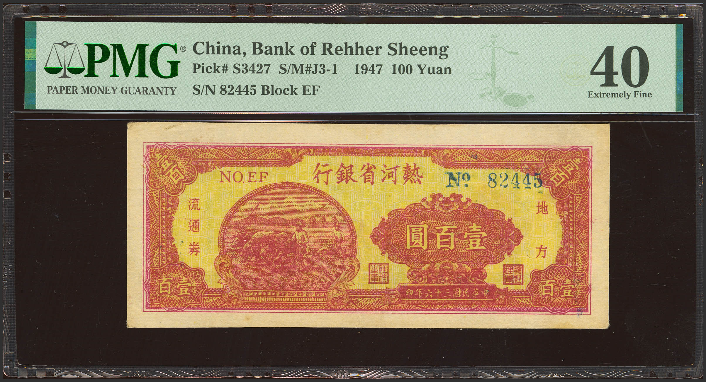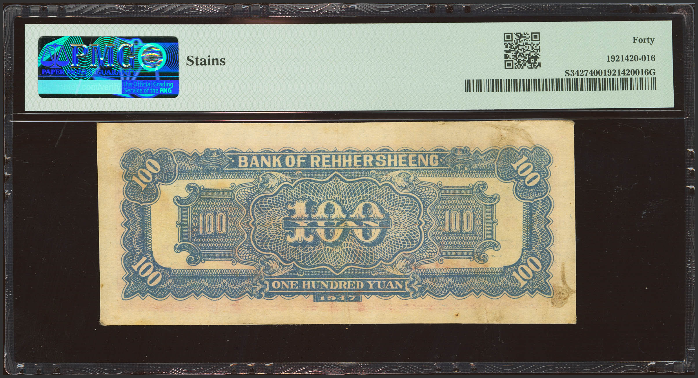 CHINA. 100 Yuan. 1947. Bank of Rehher Sheeng. (Pick: S3427, SM: J3-1). PMG40 (stains).