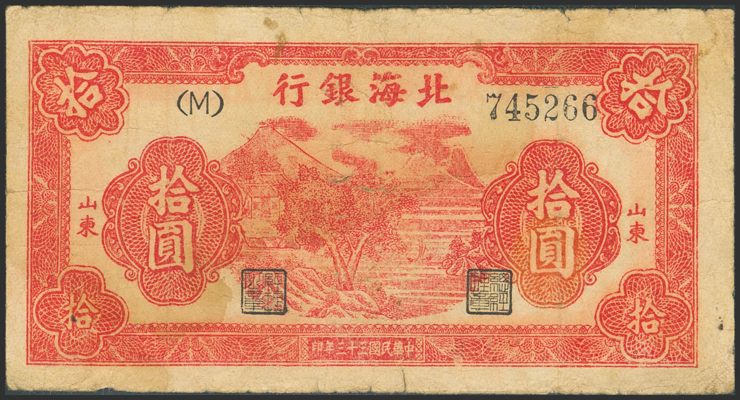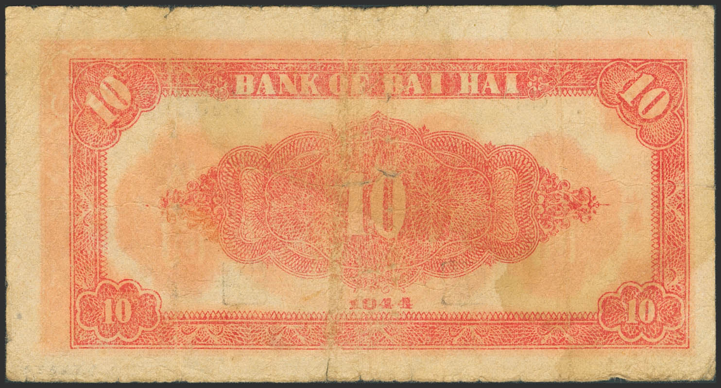 CHINA. 10 Yuan. 1944. Bank of Bai Hai. (Pick: S3564). Tears on the bottom edge and center. Fine.