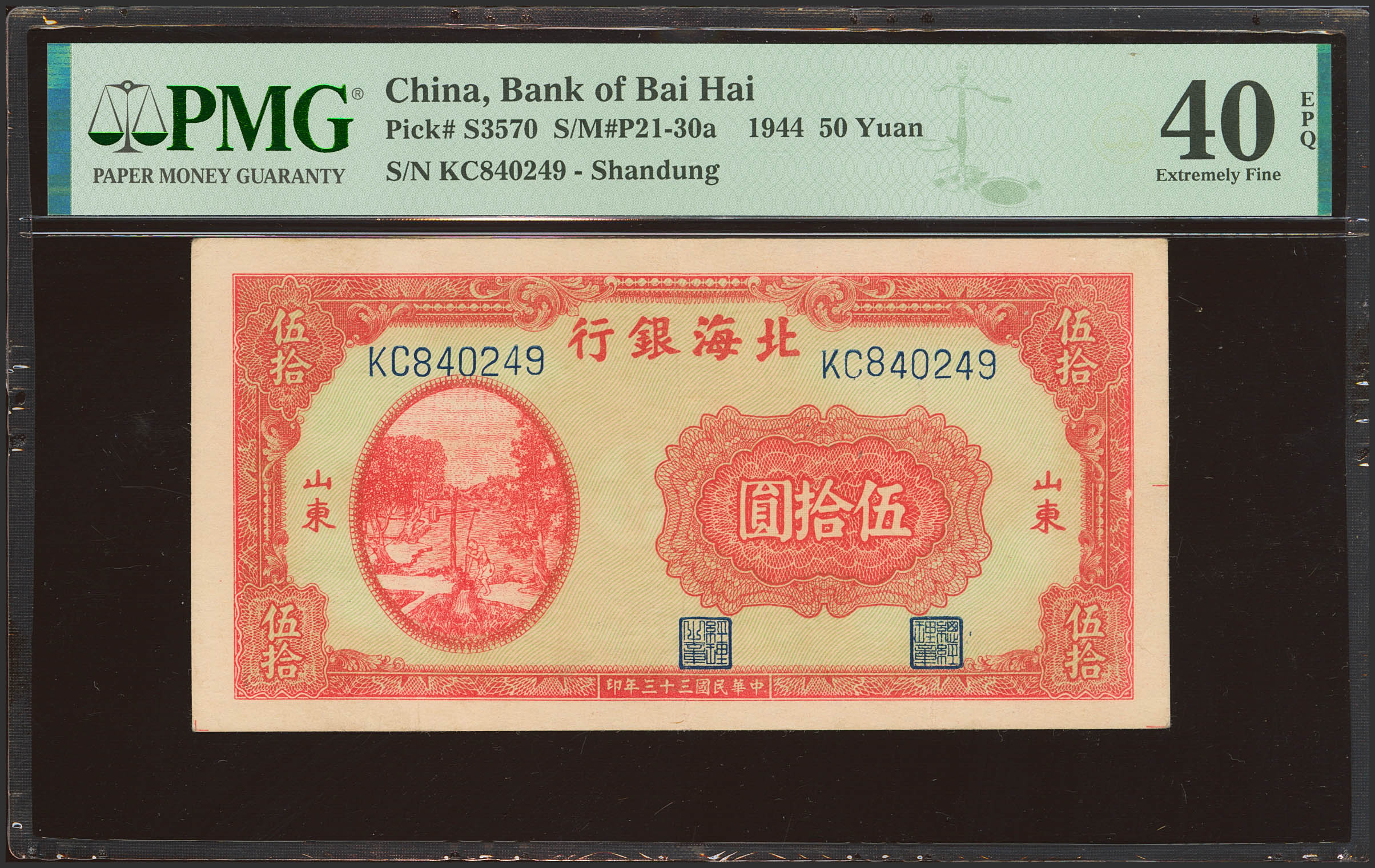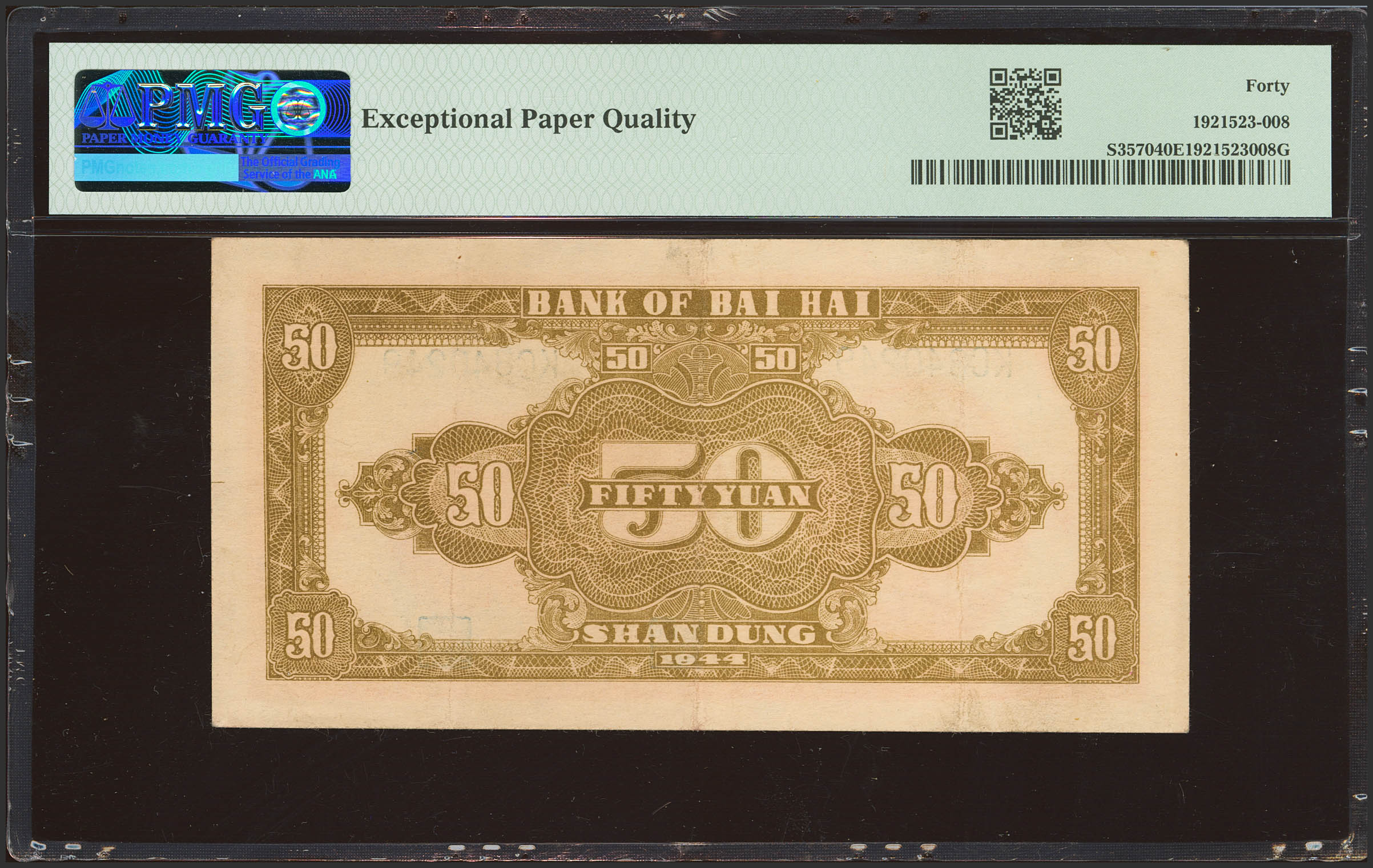 CHINA. 50 Yuan. 1944. Bank of Bai Hai. Shandung. (Pick: S3570a, SM: P21-30a). PMG40EPQ.
