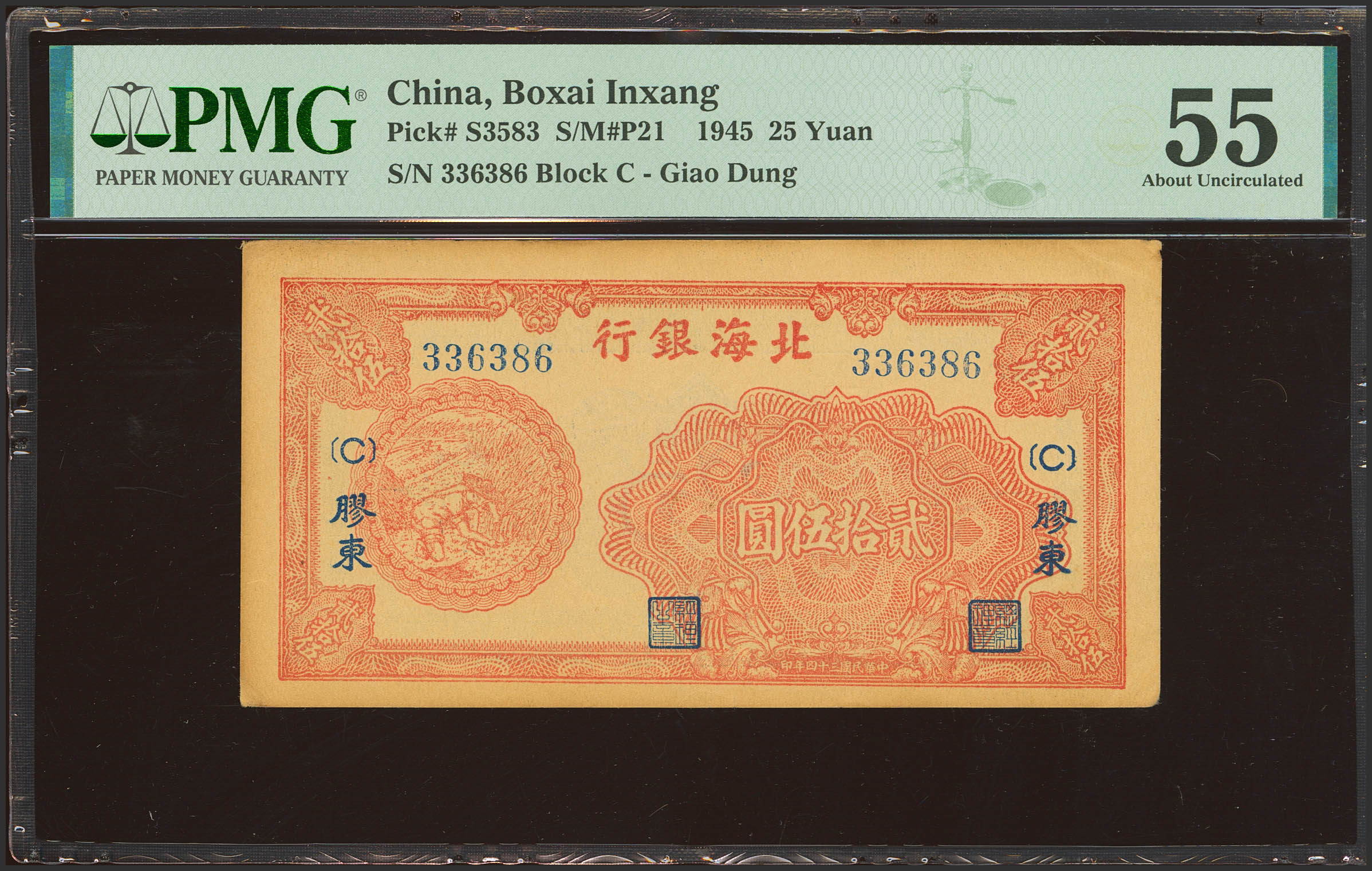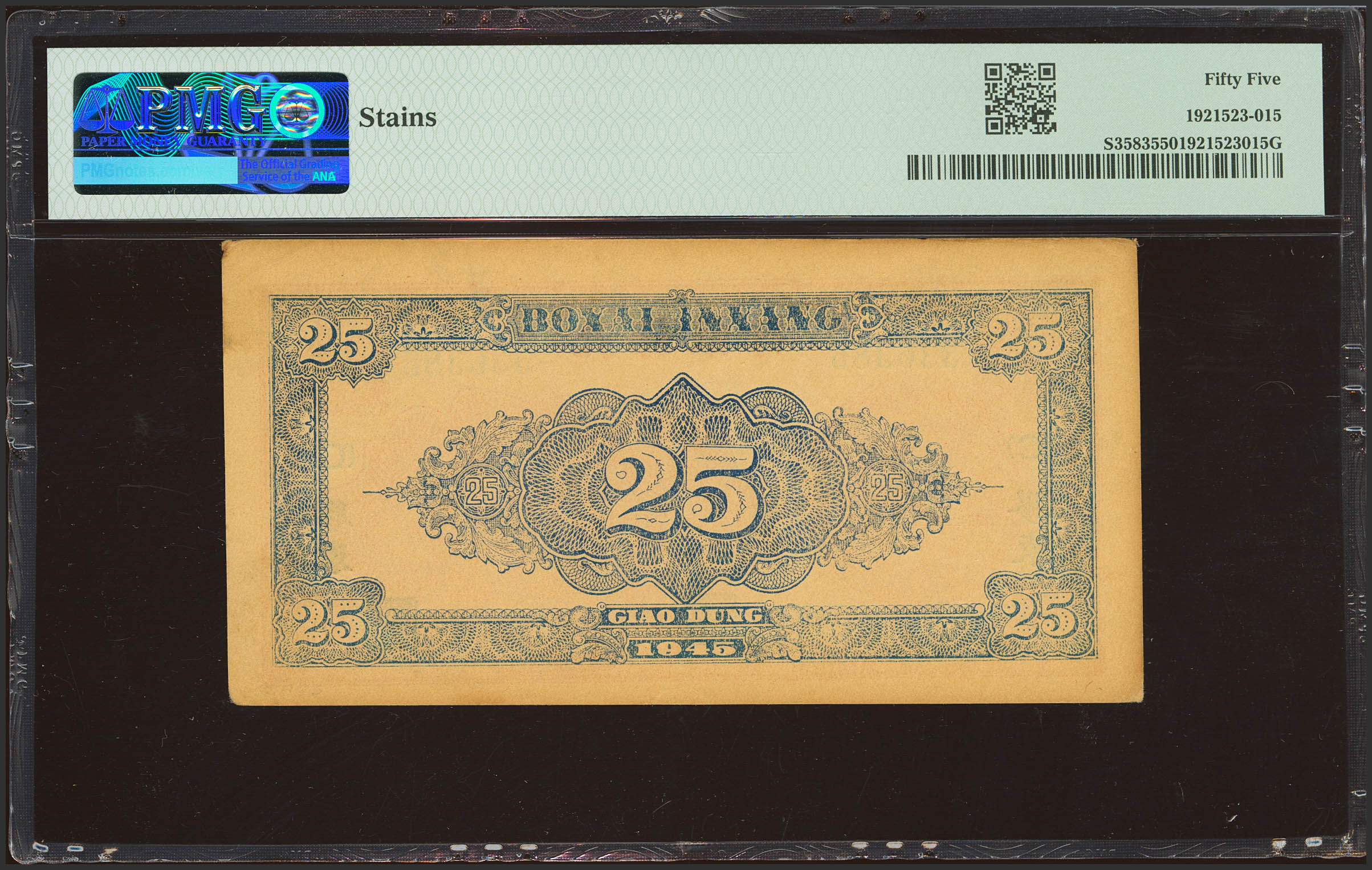 CHINA. 25 Yuan. 1945. Boxai Inxang. Giao Dung. (Pick: S3583, SM: P21). PMG55 (stains).