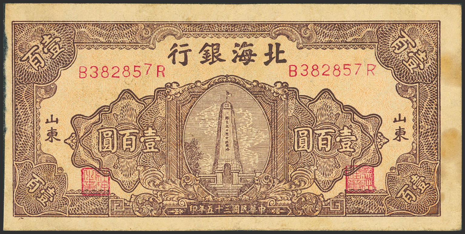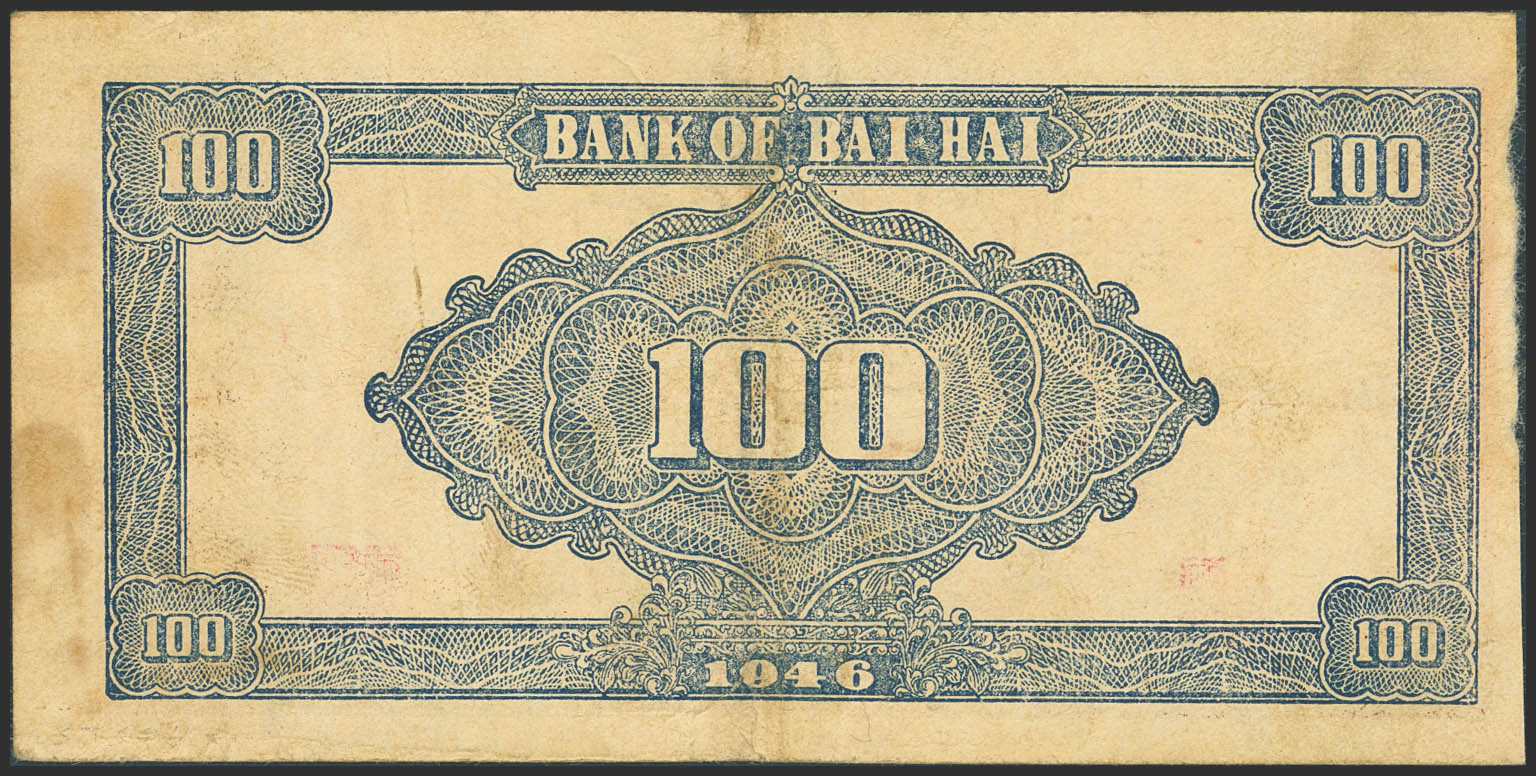 CHINA. 100 Yuan. 1946. Bank of Bai Hai. (Pick: S3604). Left edge damaged. More than Very Fine.