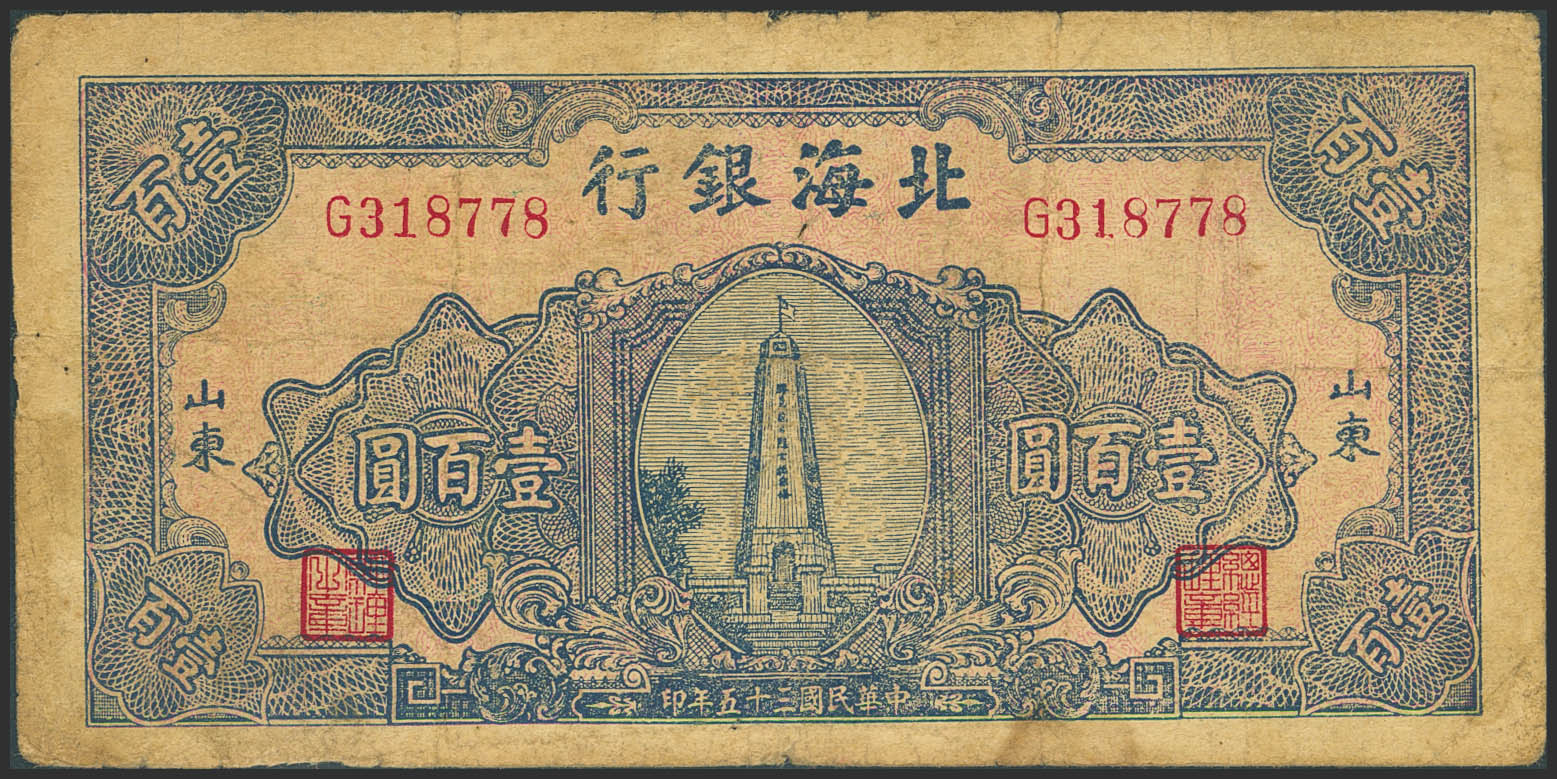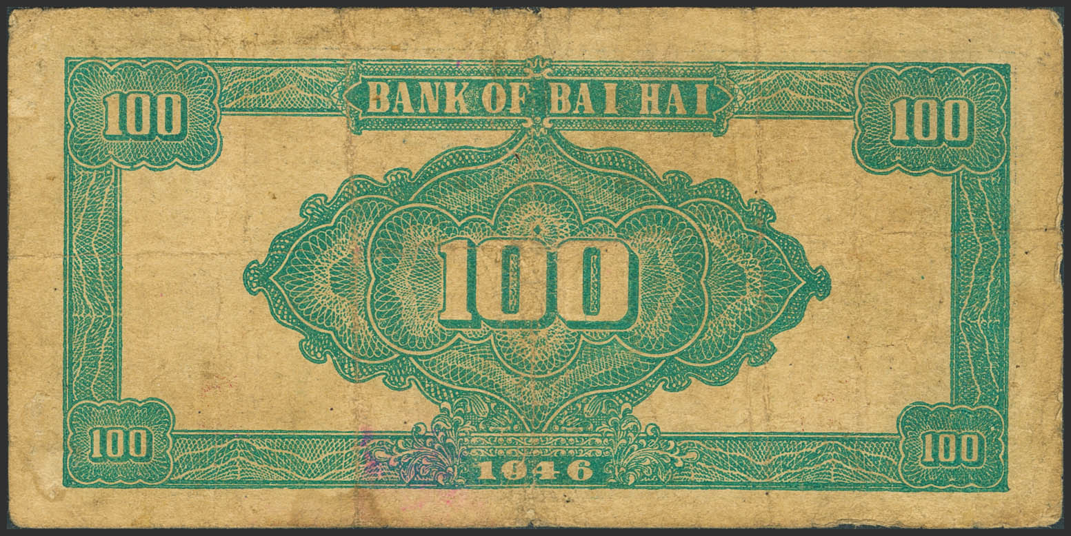 CHINA. 100 Yuan. 1946. Bank of Bai Hai. (Pick: S3608). Pinholes. Fine.
