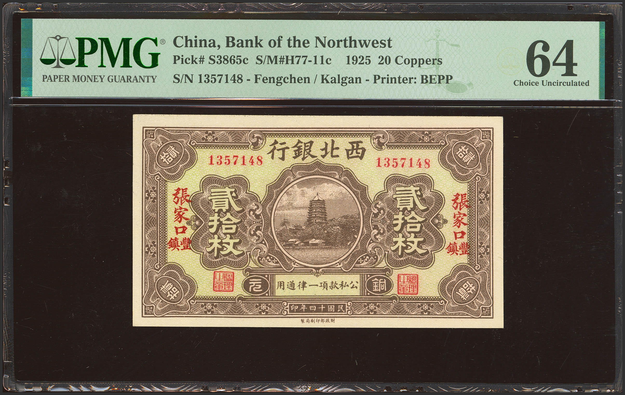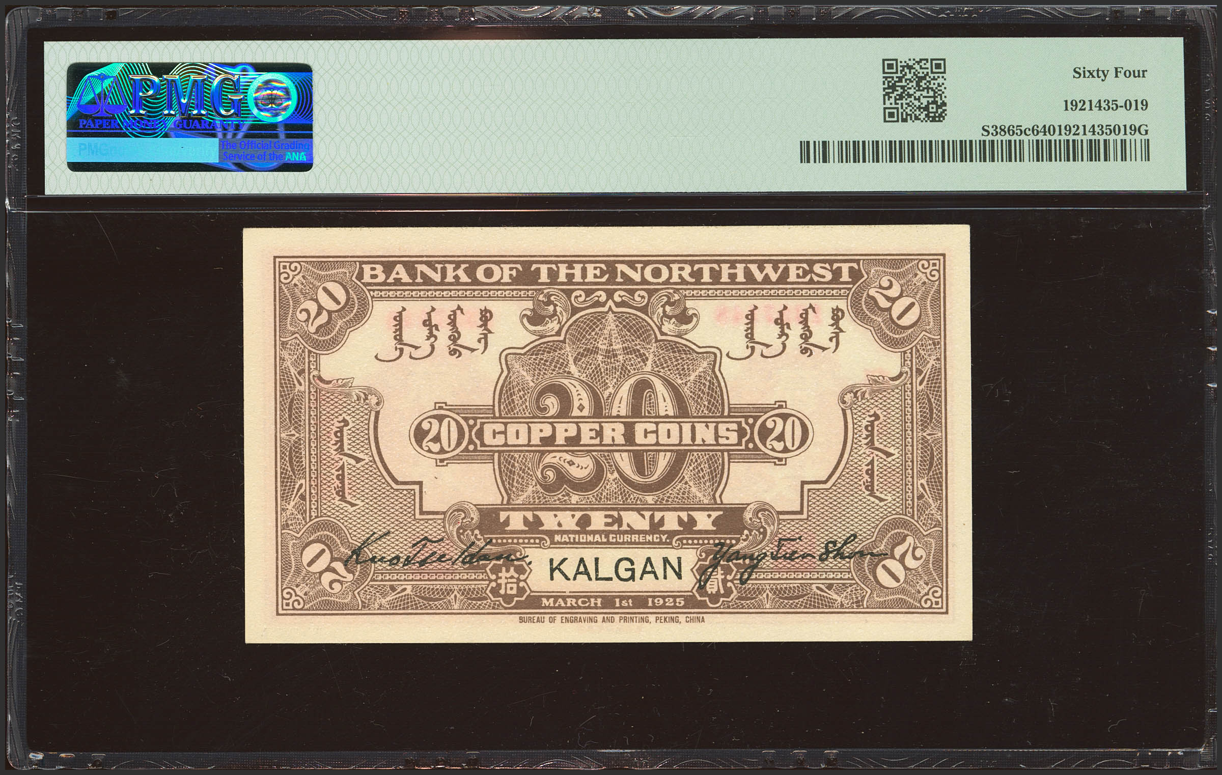 CHINA. 20 Copper coins. 1 March 1925. Bank of the Northwest. Kalgan. (Pick: S3865a, SM: H77-11c). PMG64.