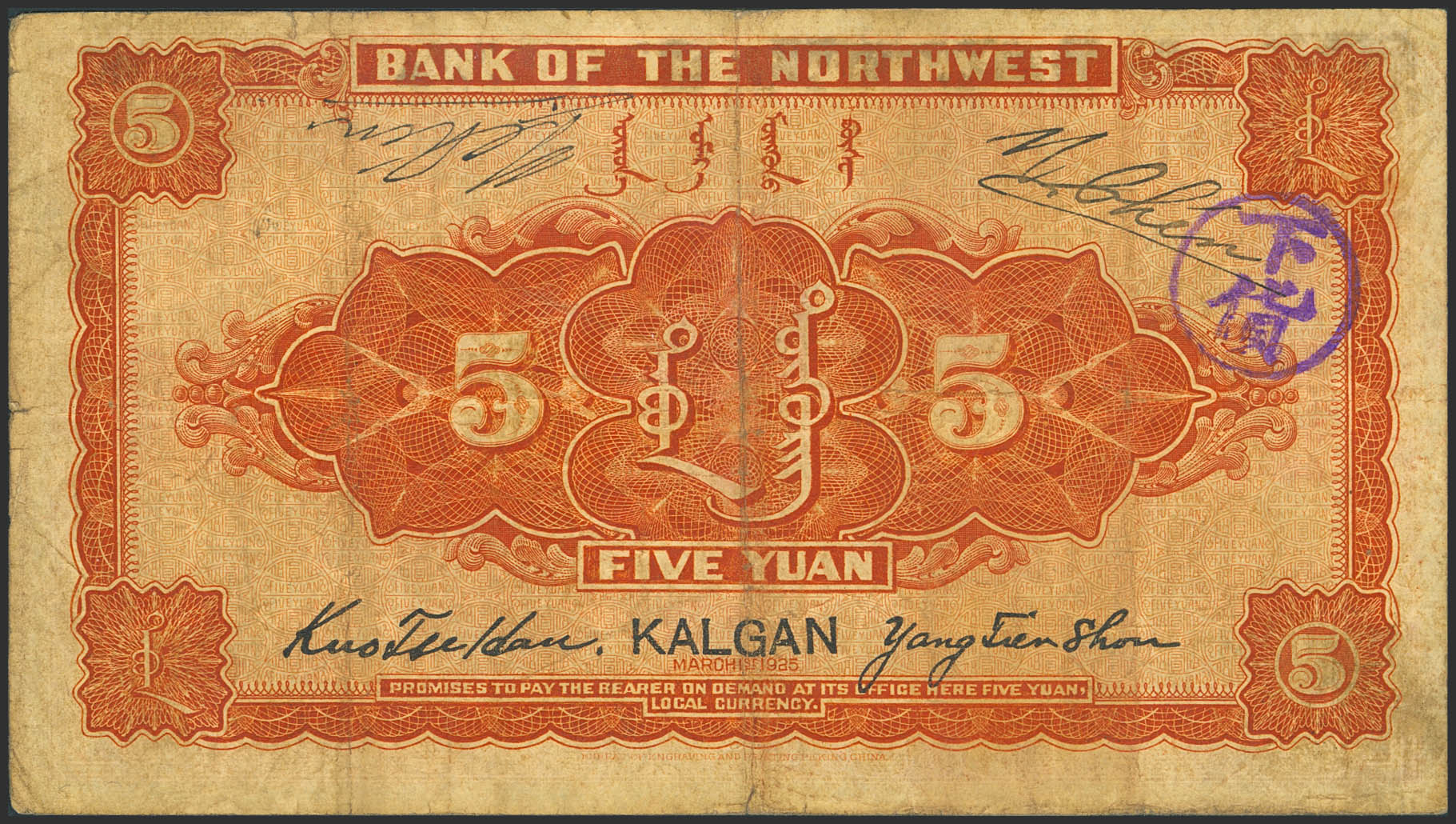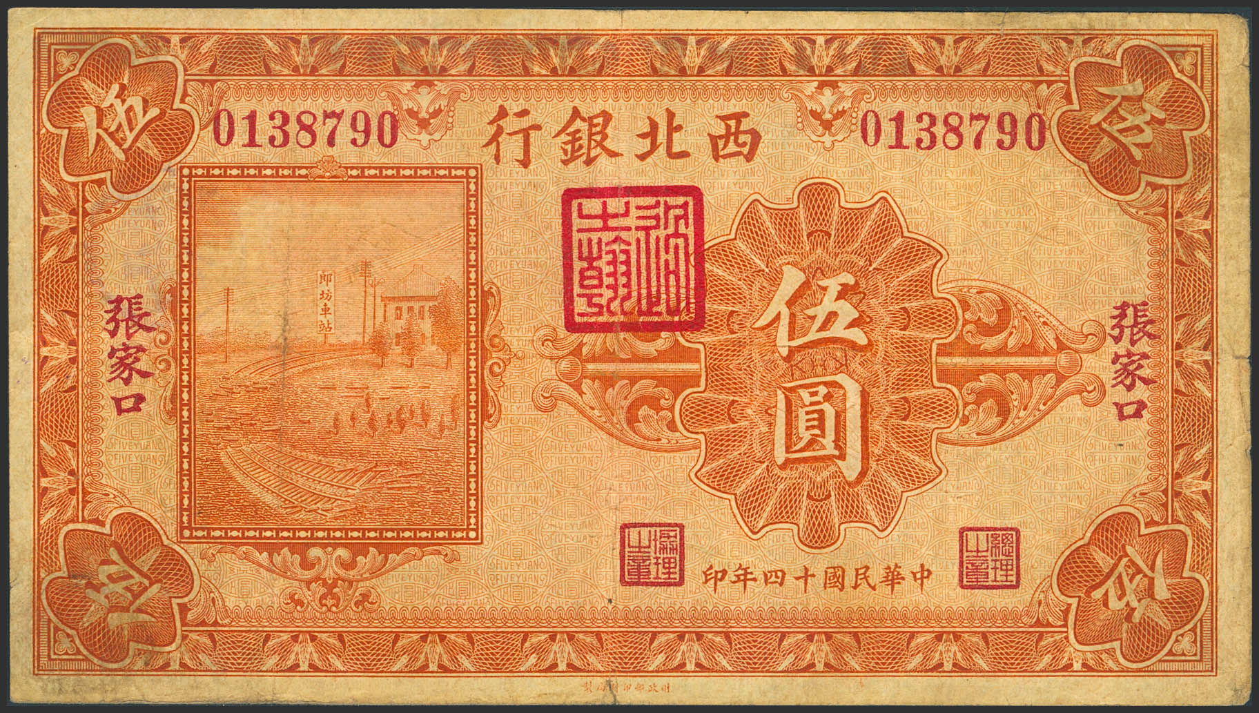 CHINA. 5 Yuan. 1 March 1925. Bank of the Northwest. Kalgan. (Pick: S3873c). Tears. Very Fine.