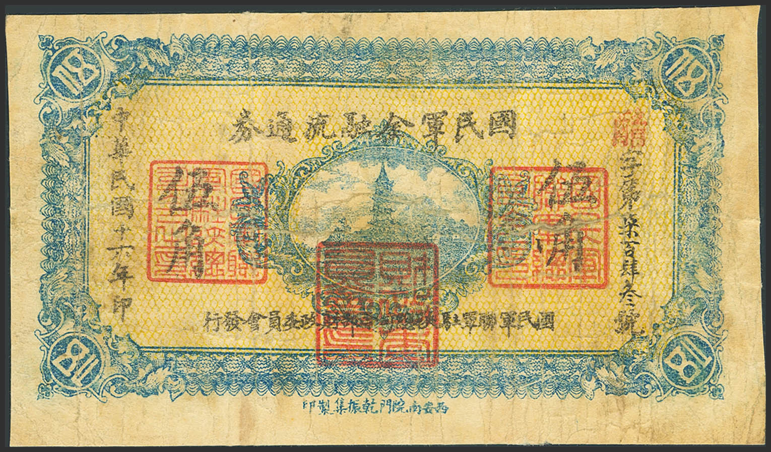 CHINA. 5 Chiao. 1927. National Army. (Pick: S3913). Tear 1 cm over right seal. Very Fine.