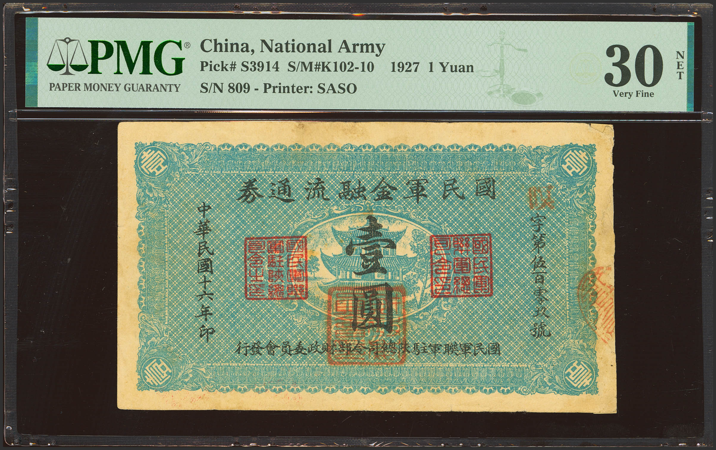 CHINA. 1 Yuan. 1927. National Army. (Pick: S3914, SM: K102-10). PMG30NET (repaired).