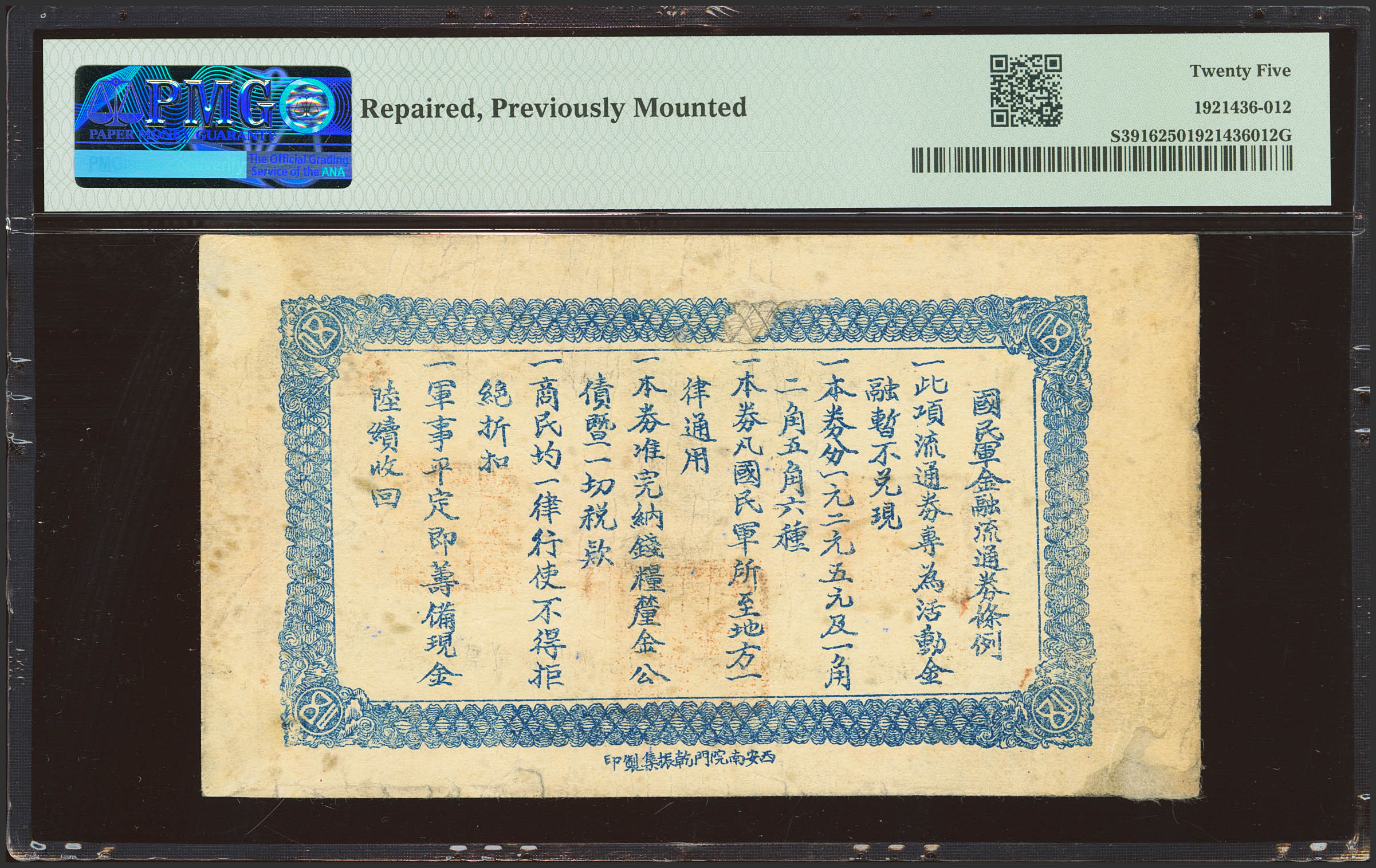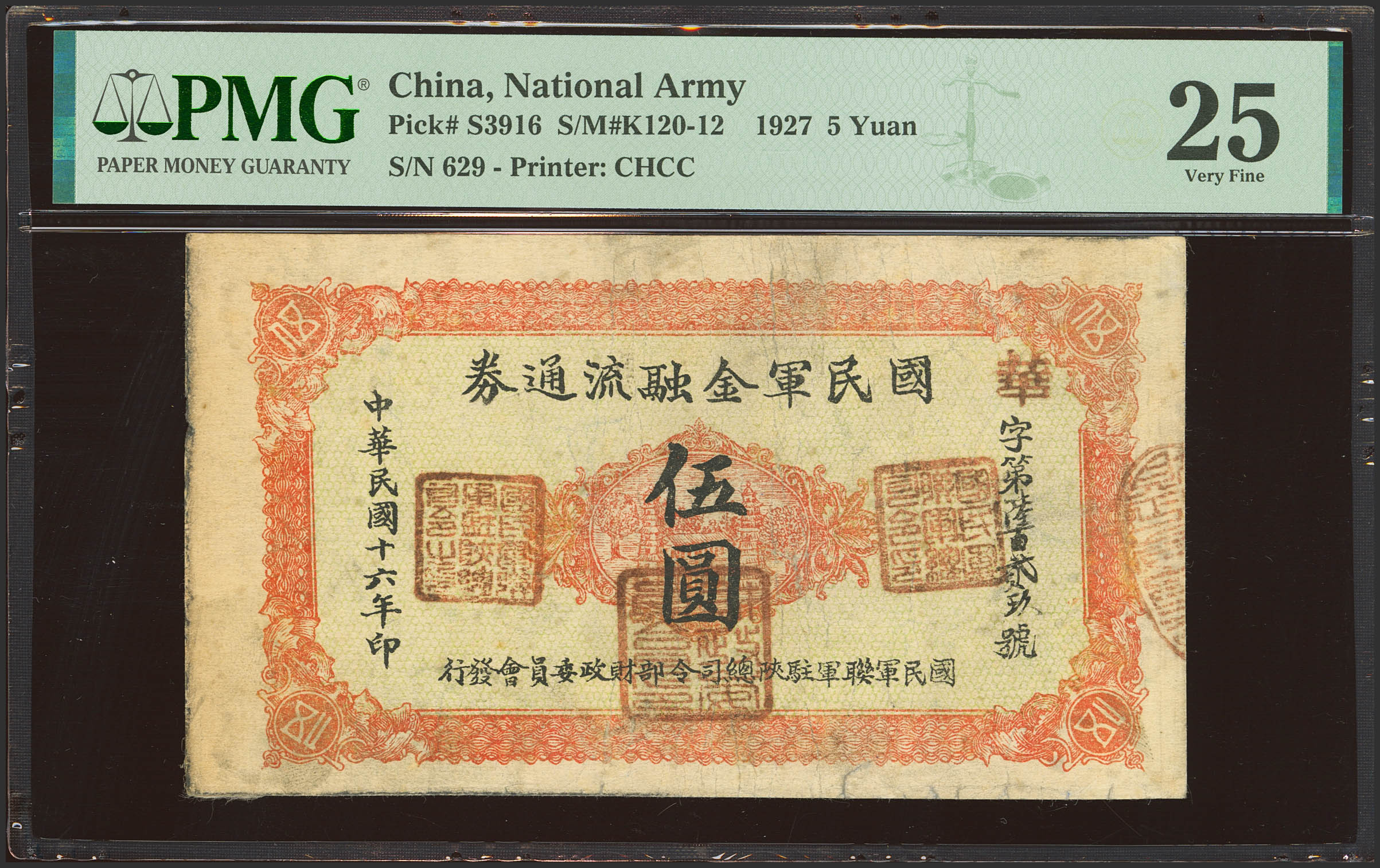 CHINA. 5 Yuan. 1927. National Army. (Pick: S3916, SM: K120-12). PMG25 (repaired, previously mounted).