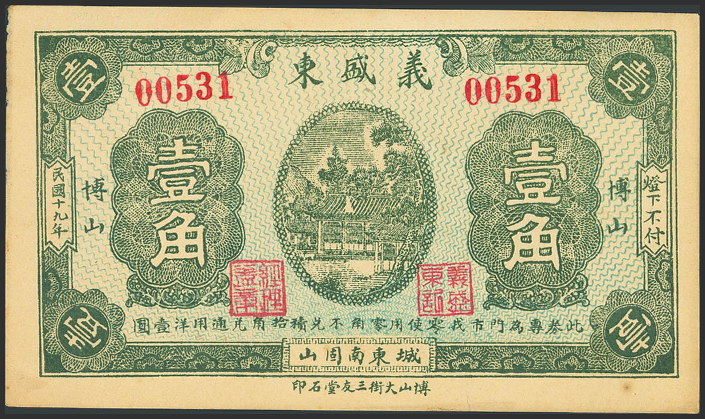 CHINA. 10 Cents. 1930. I Seng Tung. Boshan. Private Isue. (Pick: Unlisted). Uncirculated.