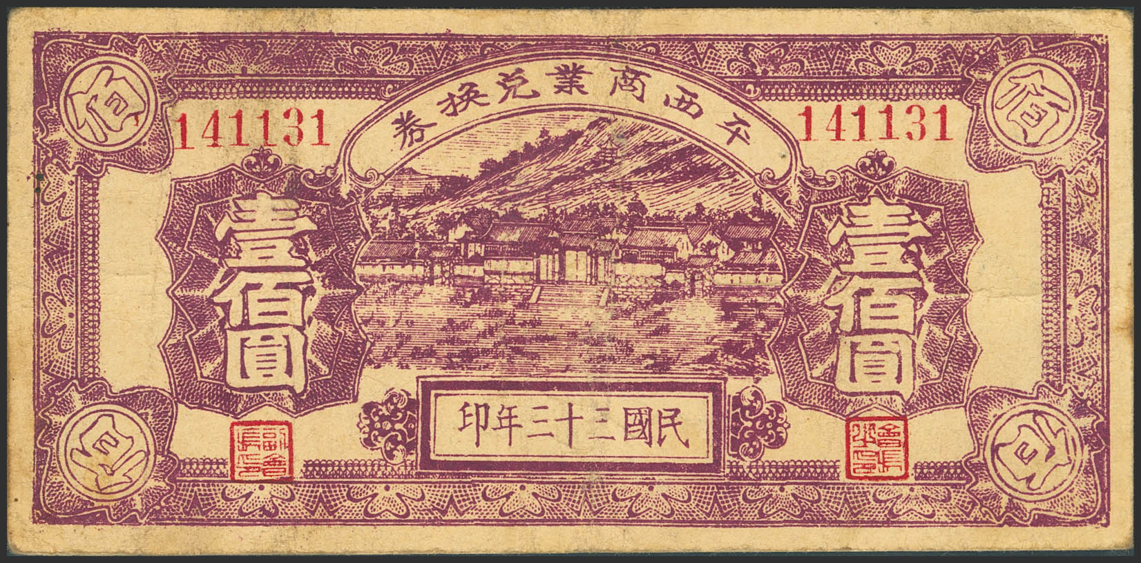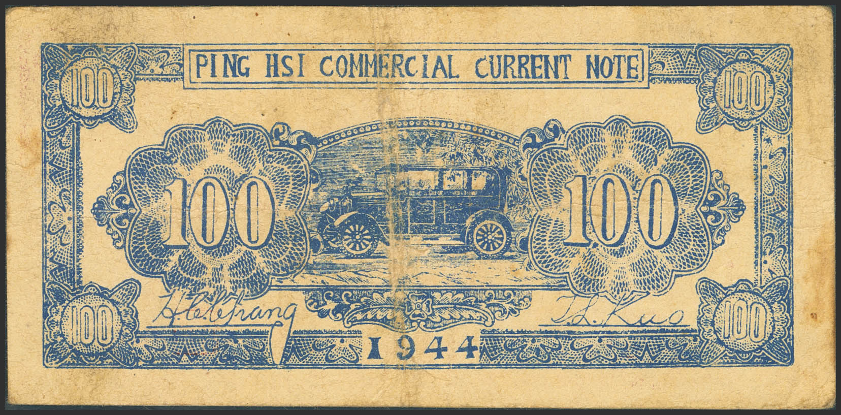 CHINA. 100 Yuan. 1944. Ping Hsi Commercial. Private Issue. (Pick: Unlisted). Very Fine.
